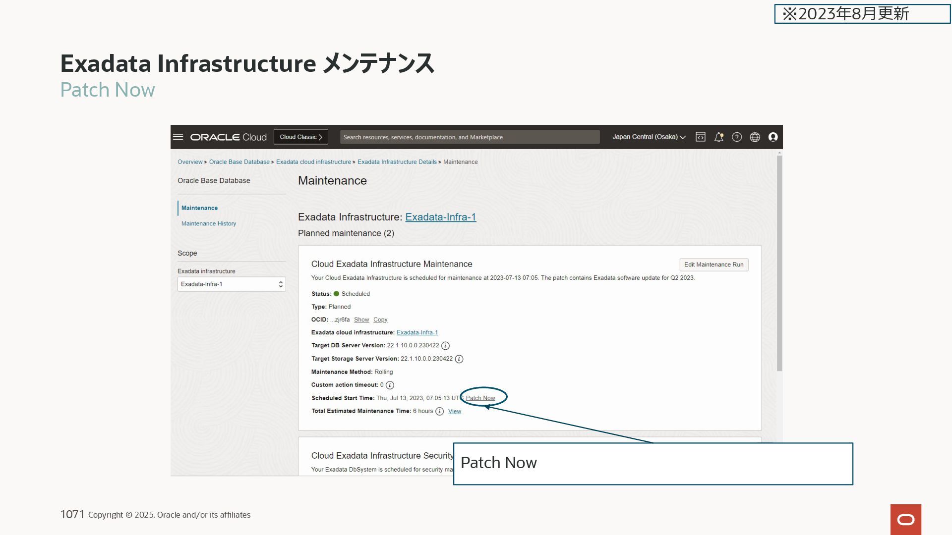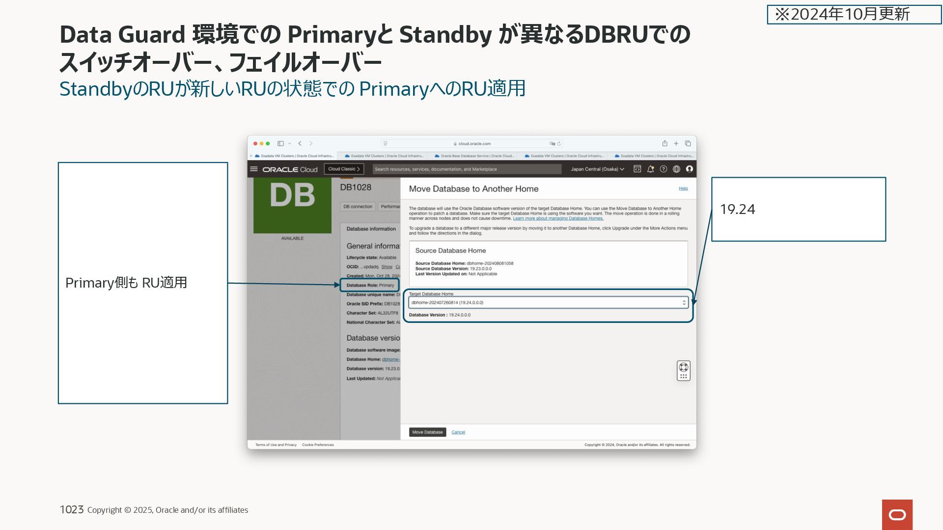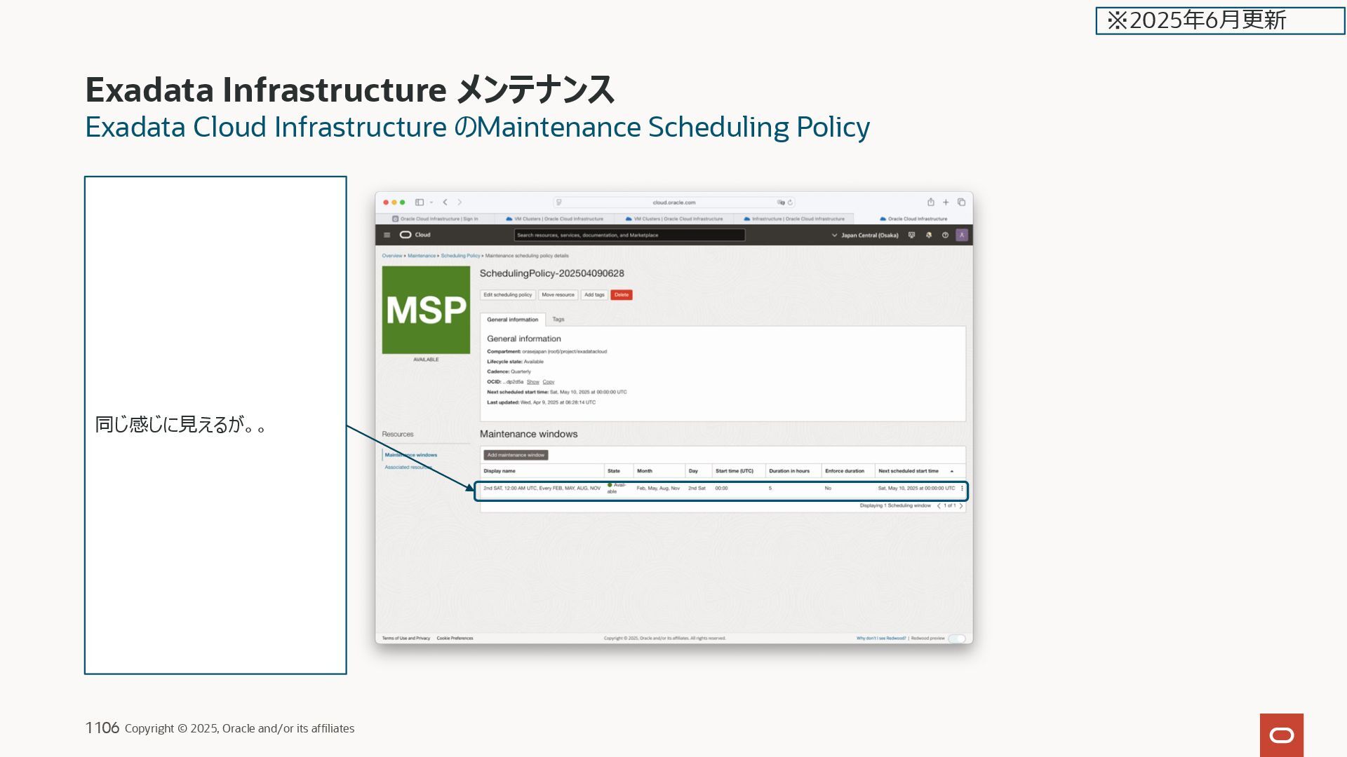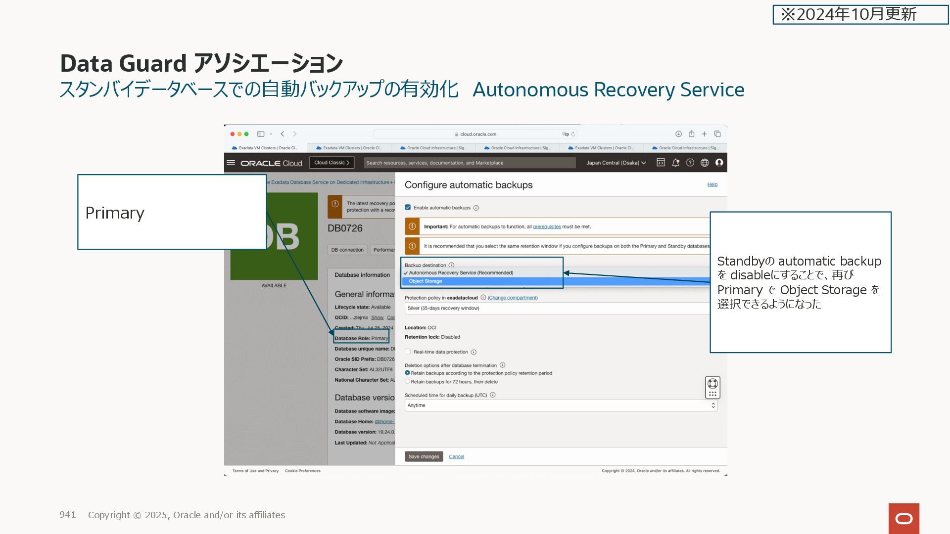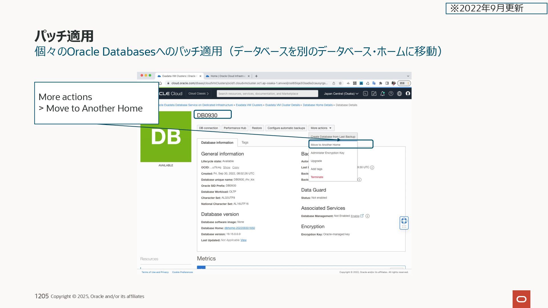 2025-04-03T01:31:51.131744+00:00 SQL> ALTER DISKGROUP DATAC2 DROP DISK 'DATAC2_CD_00_kix101117exdcl10', 'DATAC2_CD_01_kix101117exdcl10', 'DATAC2_CD_02_kix101117exdcl10', 'DATAC2_CD_03_kix101117exdcl10', 'DATAC2_CD_04_kix101117exdcl10', 'DATAC2_CD_05_kix101117exdcl10', 'DATAC2_CD_06_kix101117exdcl10', 'DATAC2_CD_07_kix101117exdcl10', 'DATAC2_CD_08_kix101117exdcl10', 'DATAC2_CD_09_kix101117exdcl10', 'DATAC2_CD_10_kix101117exdcl10', 'DATAC2_CD_11_kix101117exdcl10' REBALANCE POWER 4 略 SUCCESS: ALTER DISKGROUP RECOC2 DROP DISK 'RECOC2_CD_00_kix101117exdcl10', 'RECOC2_CD_01_kix101117exdcl10', 'RECOC2_CD_02_kix101117exdcl10', 'RECOC2_CD_03_kix101117exdcl10', 'RECOC2_CD_04_kix101117exdcl10', 'RECOC2_CD_05_kix101117exdcl10', 'RECOC2_CD_06_kix101117exdcl10', 'RECOC2_CD_07_kix101117exdcl10', 'RECOC2_CD_08_kix101117exdcl10', 'RECOC2_CD_09_kix101117exdcl10', 'RECOC2_CD_10_kix101117exdcl10', 'RECOC2_CD_11_kix101117exdcl10' REBALANCE POWER 4 NOTE: Attempting voting file refresh on diskgroup RECOC2 NOTE: Refresh completed on diskgroup RECOC2. No voting file found. 2025-04-03T01:32:19.466977+00:00 Exadata Infrastructure Copyright © 2025, Oracle and/or its affiliates 132 ※2025年4⽉更新