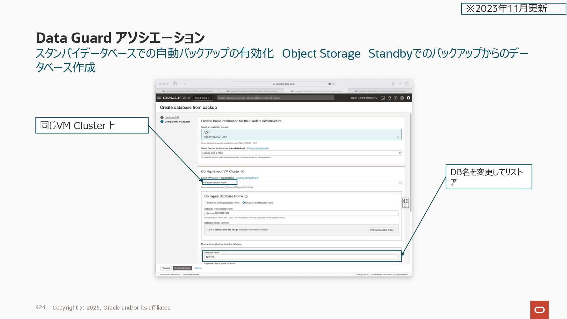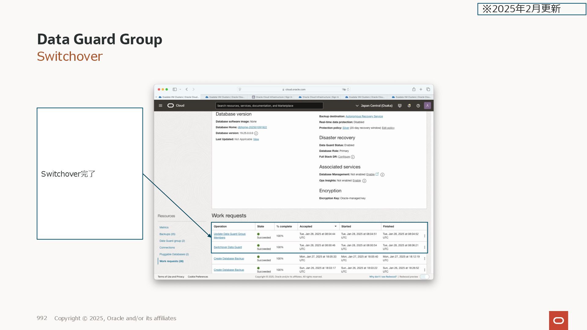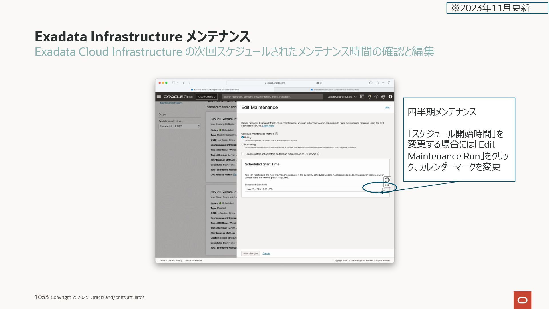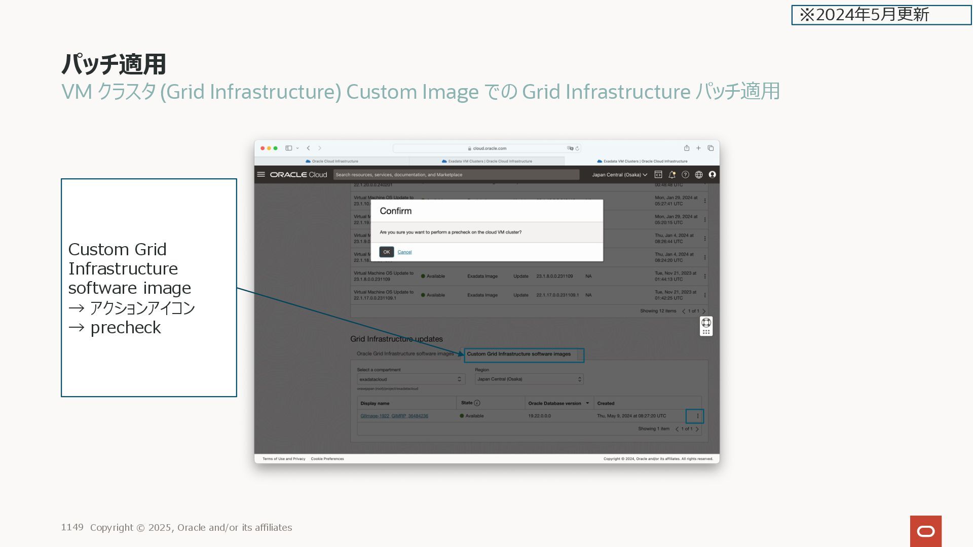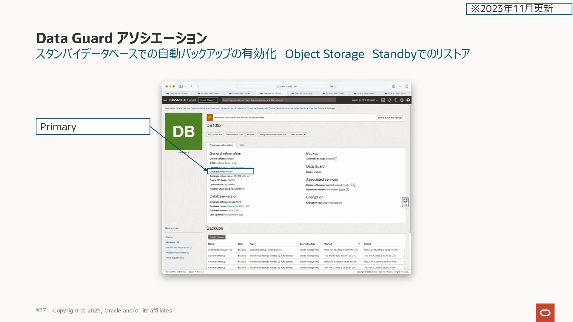 2025-04-03T01:31:51.131744+00:00 SQL> ALTER DISKGROUP DATAC2 DROP DISK 'DATAC2_CD_00_kix101117exdcl10', 'DATAC2_CD_01_kix101117exdcl10', 'DATAC2_CD_02_kix101117exdcl10', 'DATAC2_CD_03_kix101117exdcl10', 'DATAC2_CD_04_kix101117exdcl10', 'DATAC2_CD_05_kix101117exdcl10', 'DATAC2_CD_06_kix101117exdcl10', 'DATAC2_CD_07_kix101117exdcl10', 'DATAC2_CD_08_kix101117exdcl10', 'DATAC2_CD_09_kix101117exdcl10', 'DATAC2_CD_10_kix101117exdcl10', 'DATAC2_CD_11_kix101117exdcl10' REBALANCE POWER 4 略 SUCCESS: ALTER DISKGROUP RECOC2 DROP DISK 'RECOC2_CD_00_kix101117exdcl10', 'RECOC2_CD_01_kix101117exdcl10', 'RECOC2_CD_02_kix101117exdcl10', 'RECOC2_CD_03_kix101117exdcl10', 'RECOC2_CD_04_kix101117exdcl10', 'RECOC2_CD_05_kix101117exdcl10', 'RECOC2_CD_06_kix101117exdcl10', 'RECOC2_CD_07_kix101117exdcl10', 'RECOC2_CD_08_kix101117exdcl10', 'RECOC2_CD_09_kix101117exdcl10', 'RECOC2_CD_10_kix101117exdcl10', 'RECOC2_CD_11_kix101117exdcl10' REBALANCE POWER 4 NOTE: Attempting voting file refresh on diskgroup RECOC2 NOTE: Refresh completed on diskgroup RECOC2. No voting file found. 2025-04-03T01:32:19.466977+00:00 Exadata Infrastructure Copyright © 2025, Oracle and/or its affiliates 132 ※2025年4⽉更新