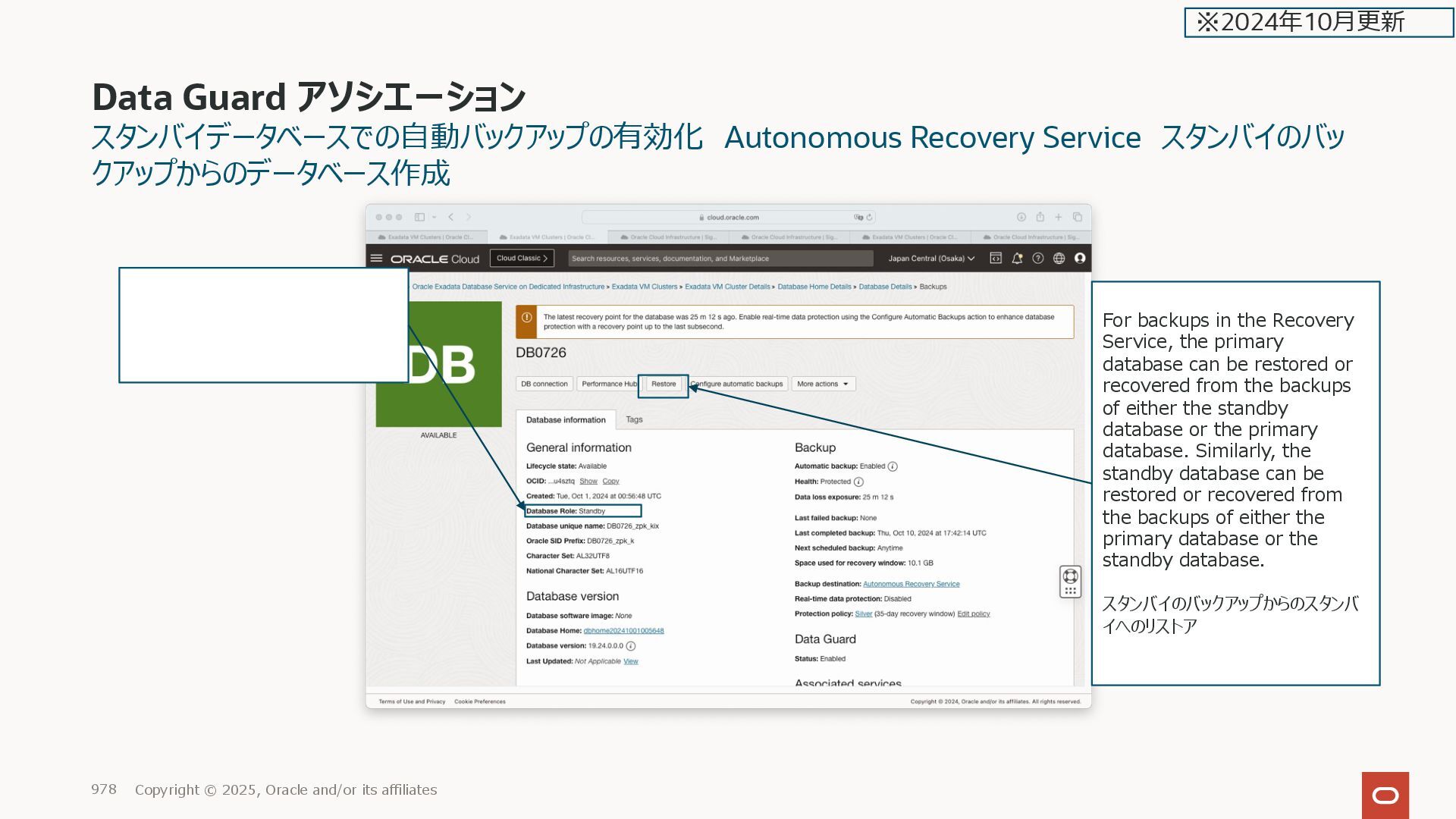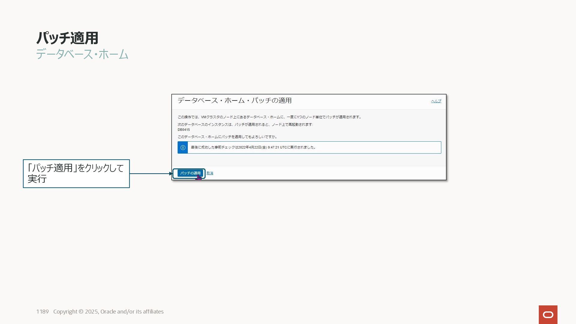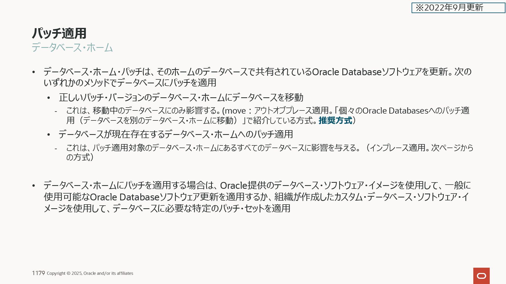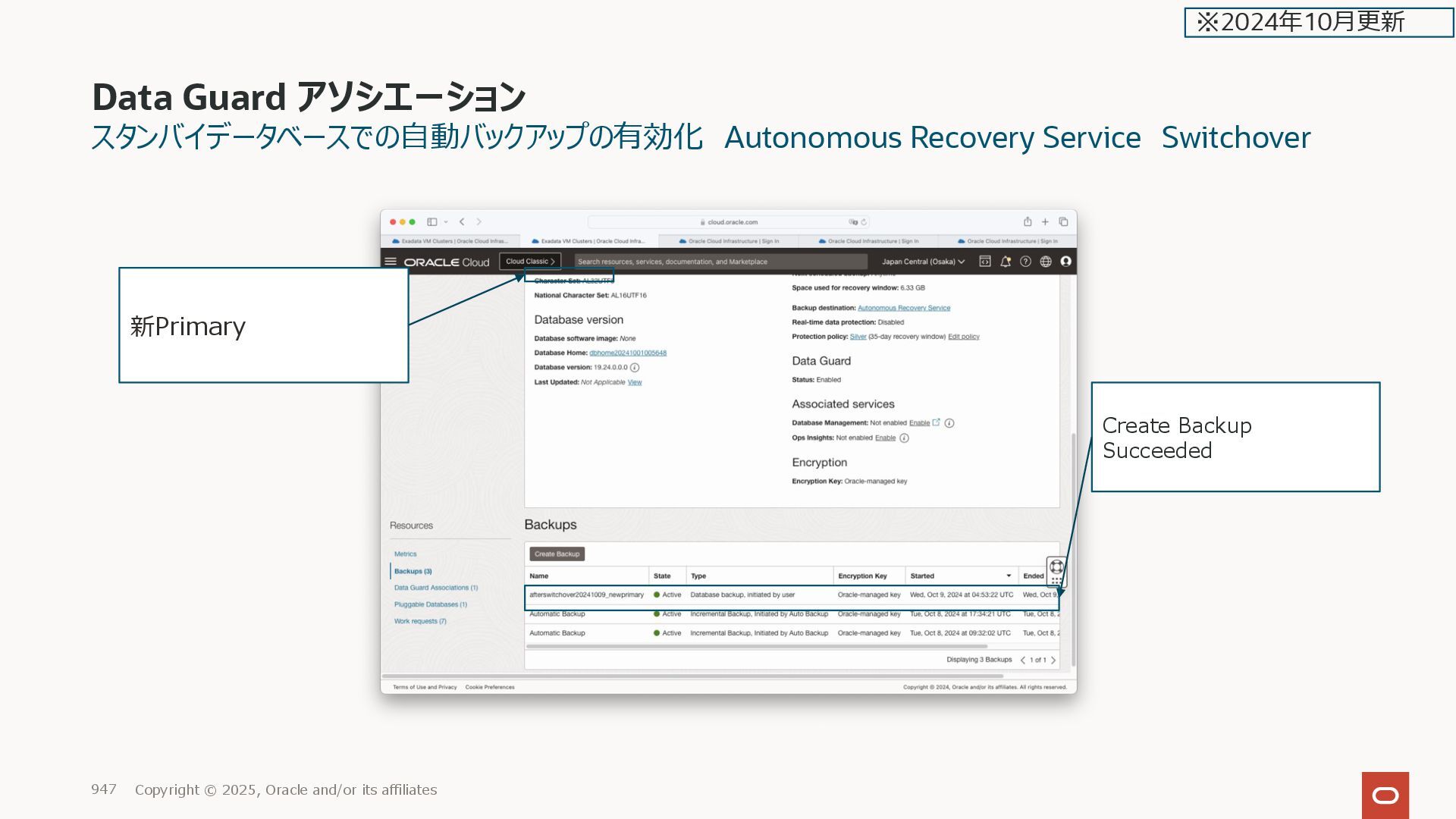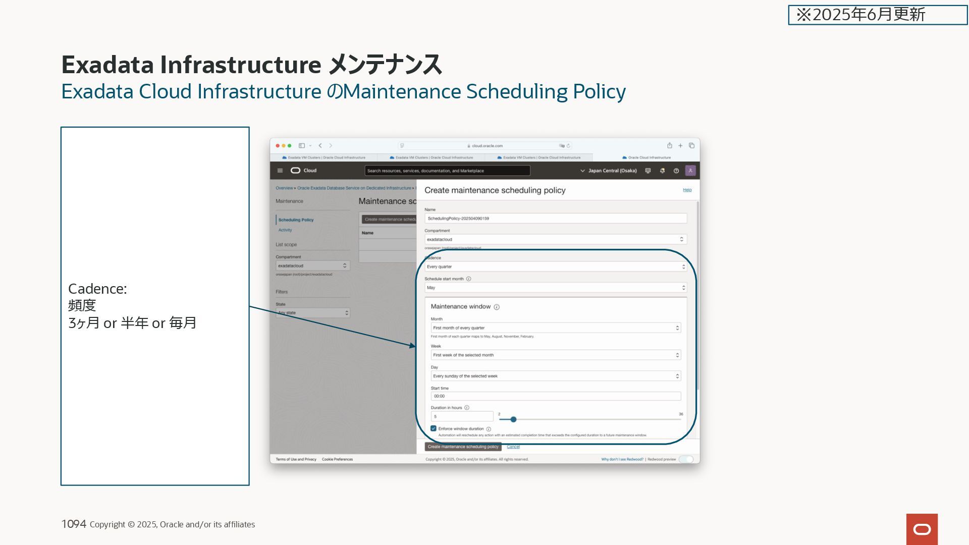 2025-04-03T01:31:51.131744+00:00 SQL> ALTER DISKGROUP DATAC2 DROP DISK 'DATAC2_CD_00_kix101117exdcl10', 'DATAC2_CD_01_kix101117exdcl10', 'DATAC2_CD_02_kix101117exdcl10', 'DATAC2_CD_03_kix101117exdcl10', 'DATAC2_CD_04_kix101117exdcl10', 'DATAC2_CD_05_kix101117exdcl10', 'DATAC2_CD_06_kix101117exdcl10', 'DATAC2_CD_07_kix101117exdcl10', 'DATAC2_CD_08_kix101117exdcl10', 'DATAC2_CD_09_kix101117exdcl10', 'DATAC2_CD_10_kix101117exdcl10', 'DATAC2_CD_11_kix101117exdcl10' REBALANCE POWER 4 略 SUCCESS: ALTER DISKGROUP RECOC2 DROP DISK 'RECOC2_CD_00_kix101117exdcl10', 'RECOC2_CD_01_kix101117exdcl10', 'RECOC2_CD_02_kix101117exdcl10', 'RECOC2_CD_03_kix101117exdcl10', 'RECOC2_CD_04_kix101117exdcl10', 'RECOC2_CD_05_kix101117exdcl10', 'RECOC2_CD_06_kix101117exdcl10', 'RECOC2_CD_07_kix101117exdcl10', 'RECOC2_CD_08_kix101117exdcl10', 'RECOC2_CD_09_kix101117exdcl10', 'RECOC2_CD_10_kix101117exdcl10', 'RECOC2_CD_11_kix101117exdcl10' REBALANCE POWER 4 NOTE: Attempting voting file refresh on diskgroup RECOC2 NOTE: Refresh completed on diskgroup RECOC2. No voting file found. 2025-04-03T01:32:19.466977+00:00 Exadata Infrastructure Copyright © 2025, Oracle and/or its affiliates 132 ※2025年4⽉更新