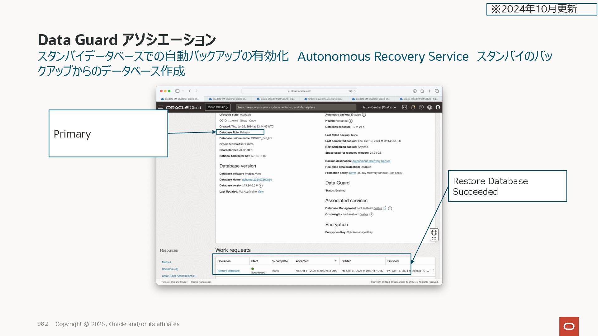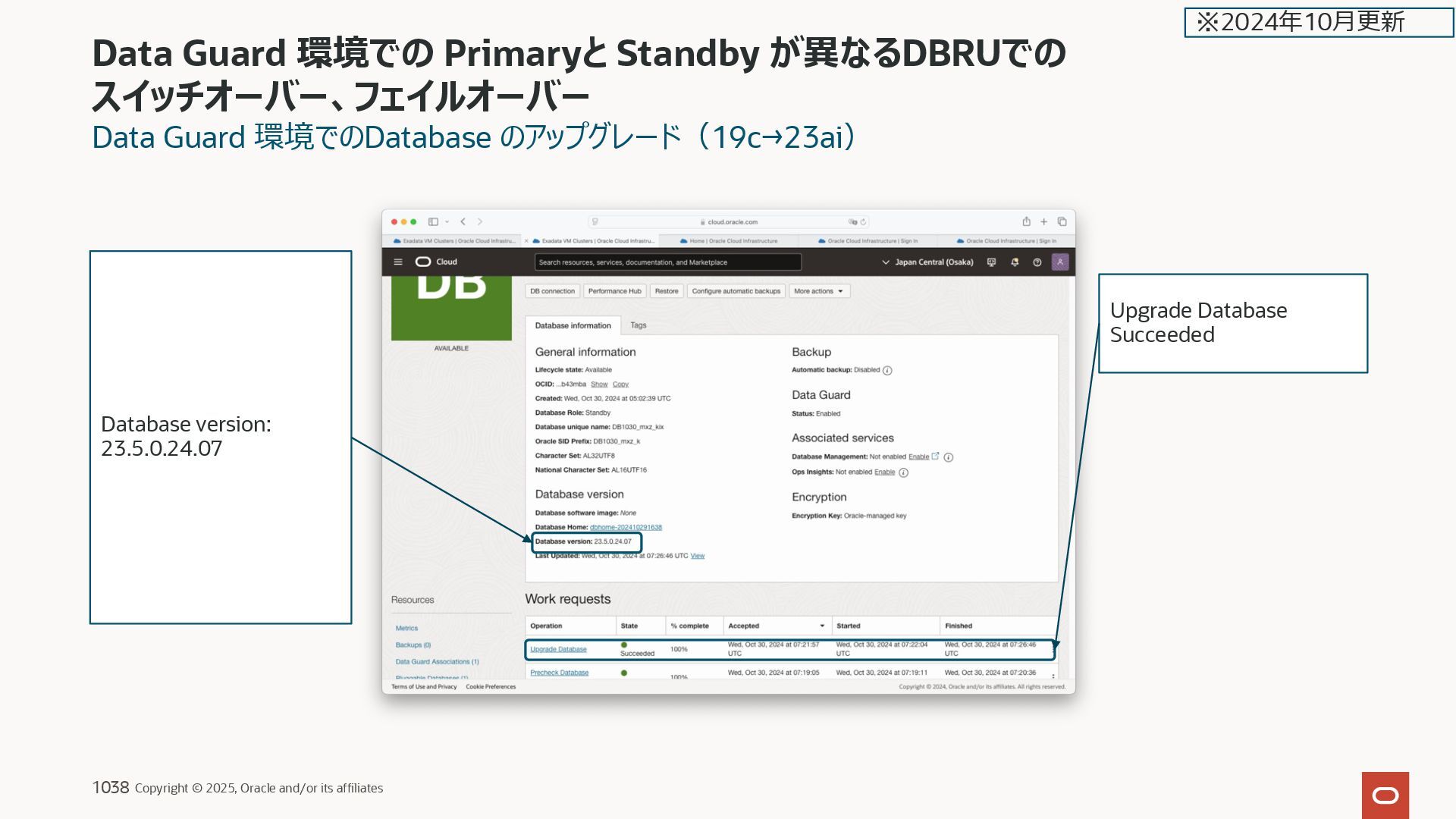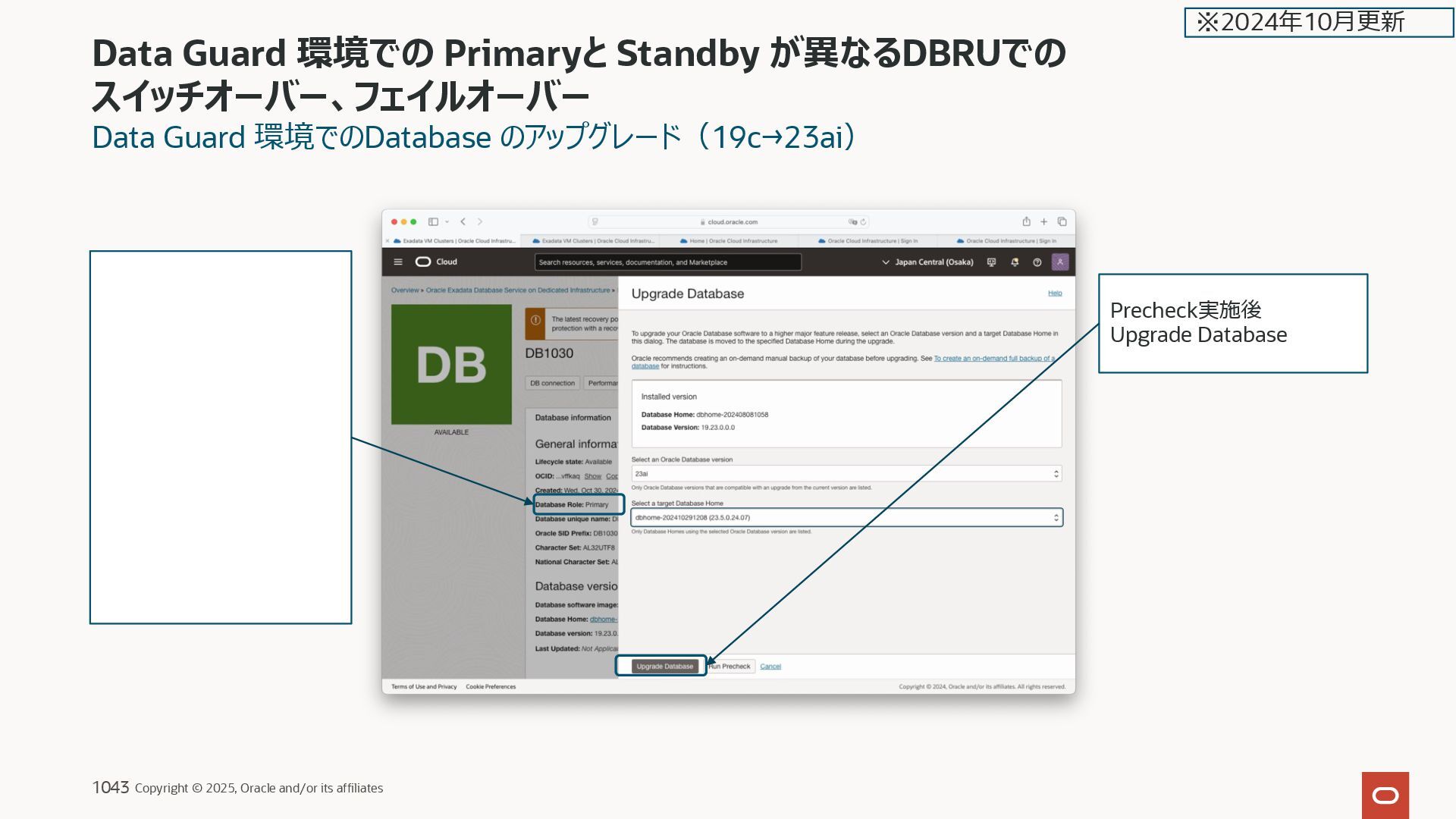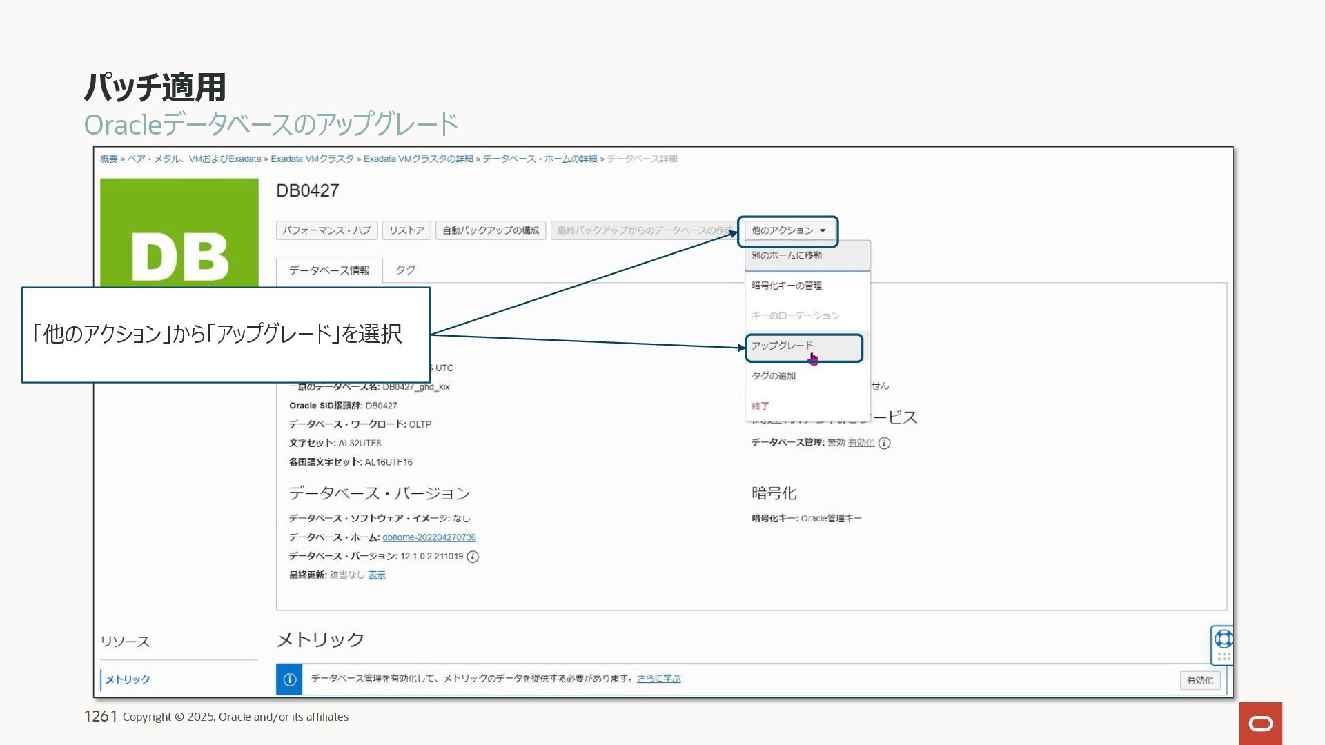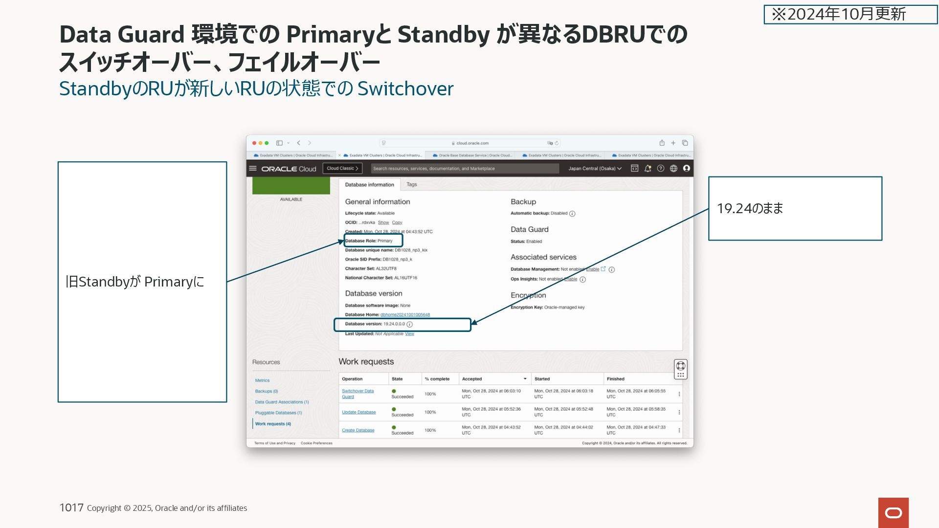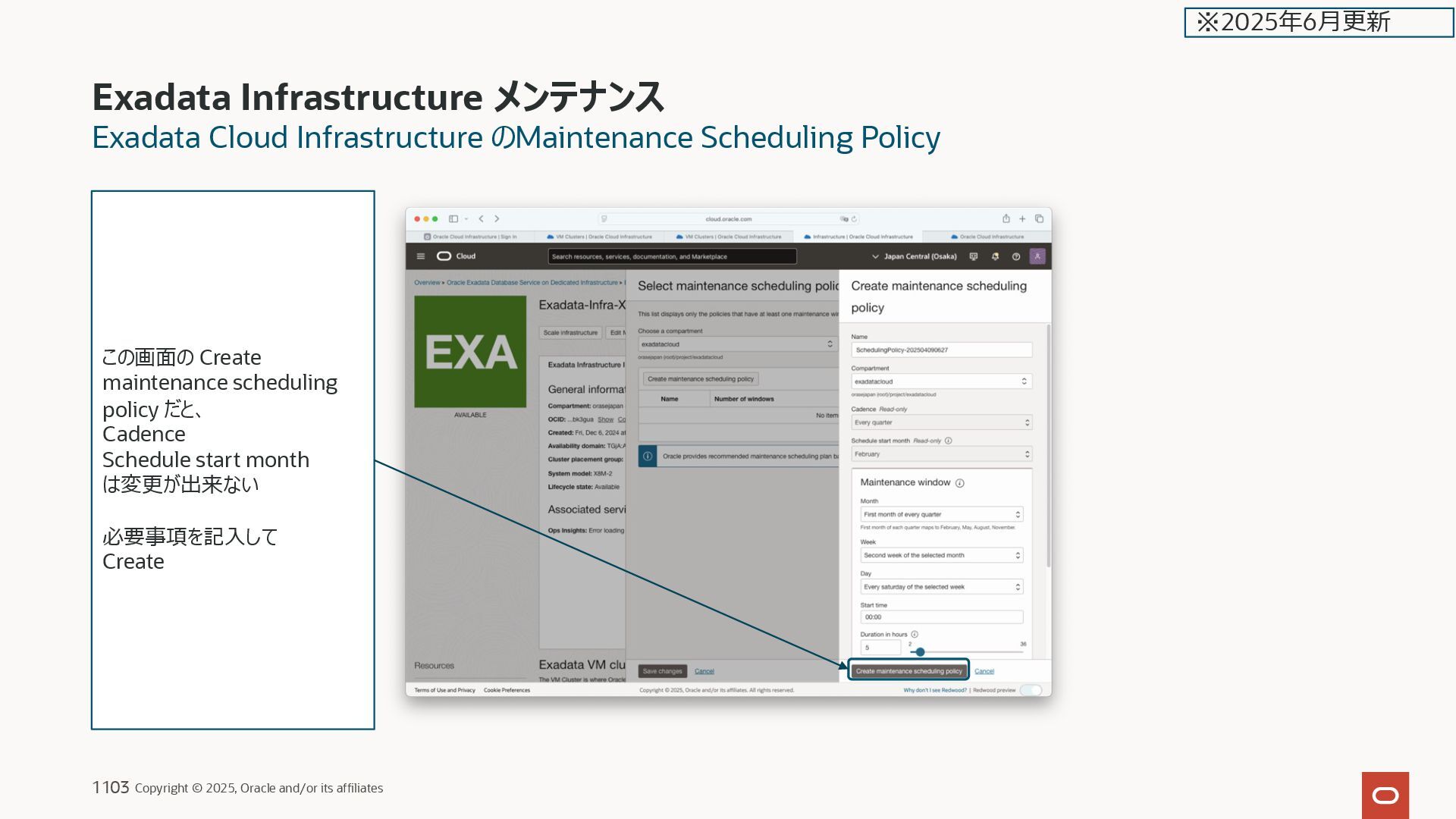 2025-04-03T01:31:51.131744+00:00 SQL> ALTER DISKGROUP DATAC2 DROP DISK 'DATAC2_CD_00_kix101117exdcl10', 'DATAC2_CD_01_kix101117exdcl10', 'DATAC2_CD_02_kix101117exdcl10', 'DATAC2_CD_03_kix101117exdcl10', 'DATAC2_CD_04_kix101117exdcl10', 'DATAC2_CD_05_kix101117exdcl10', 'DATAC2_CD_06_kix101117exdcl10', 'DATAC2_CD_07_kix101117exdcl10', 'DATAC2_CD_08_kix101117exdcl10', 'DATAC2_CD_09_kix101117exdcl10', 'DATAC2_CD_10_kix101117exdcl10', 'DATAC2_CD_11_kix101117exdcl10' REBALANCE POWER 4 略 SUCCESS: ALTER DISKGROUP RECOC2 DROP DISK 'RECOC2_CD_00_kix101117exdcl10', 'RECOC2_CD_01_kix101117exdcl10', 'RECOC2_CD_02_kix101117exdcl10', 'RECOC2_CD_03_kix101117exdcl10', 'RECOC2_CD_04_kix101117exdcl10', 'RECOC2_CD_05_kix101117exdcl10', 'RECOC2_CD_06_kix101117exdcl10', 'RECOC2_CD_07_kix101117exdcl10', 'RECOC2_CD_08_kix101117exdcl10', 'RECOC2_CD_09_kix101117exdcl10', 'RECOC2_CD_10_kix101117exdcl10', 'RECOC2_CD_11_kix101117exdcl10' REBALANCE POWER 4 NOTE: Attempting voting file refresh on diskgroup RECOC2 NOTE: Refresh completed on diskgroup RECOC2. No voting file found. 2025-04-03T01:32:19.466977+00:00 Exadata Infrastructure Copyright © 2025, Oracle and/or its affiliates 132 ※2025年4⽉更新