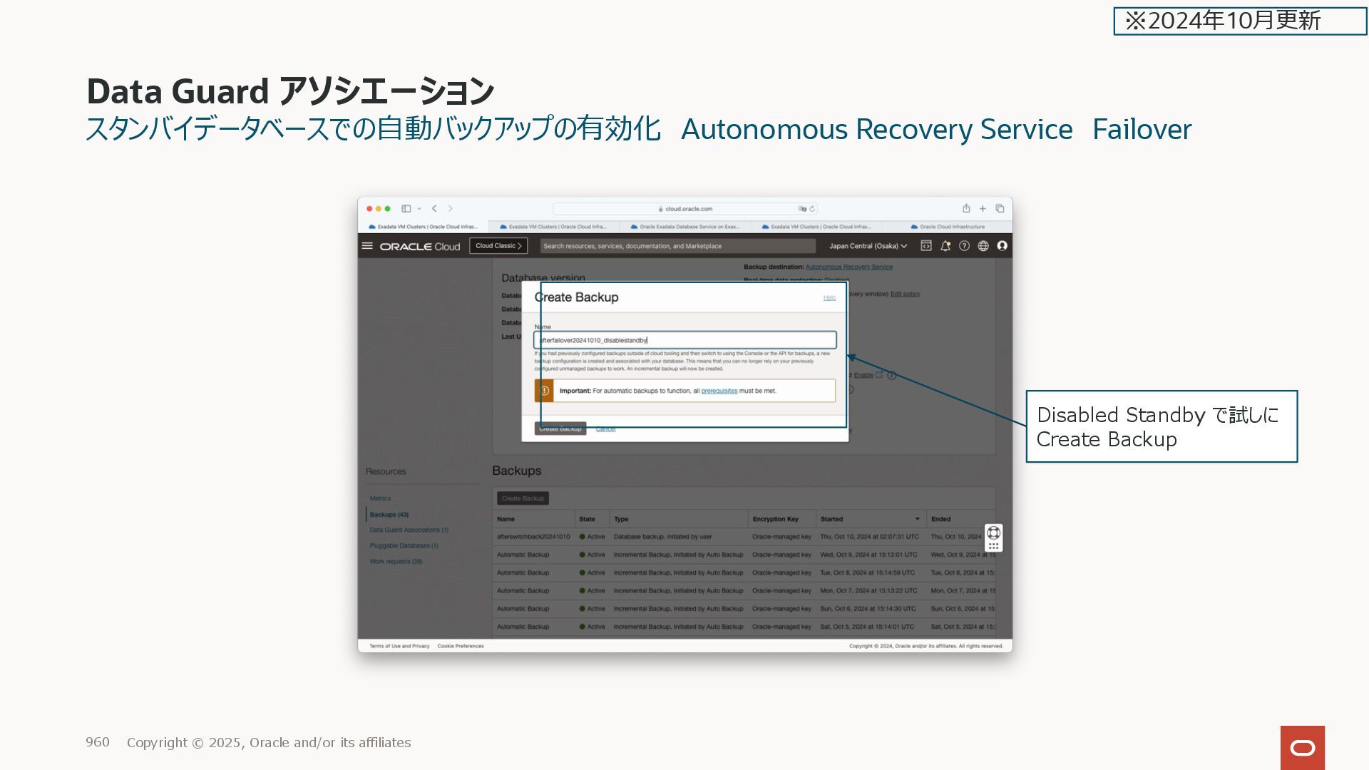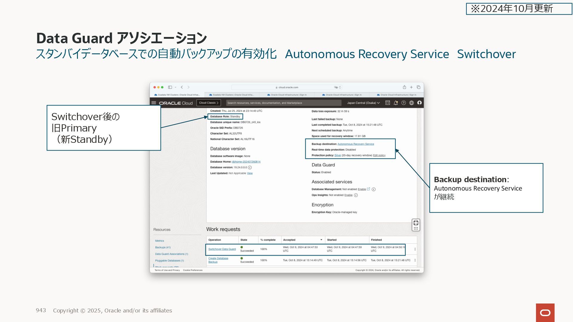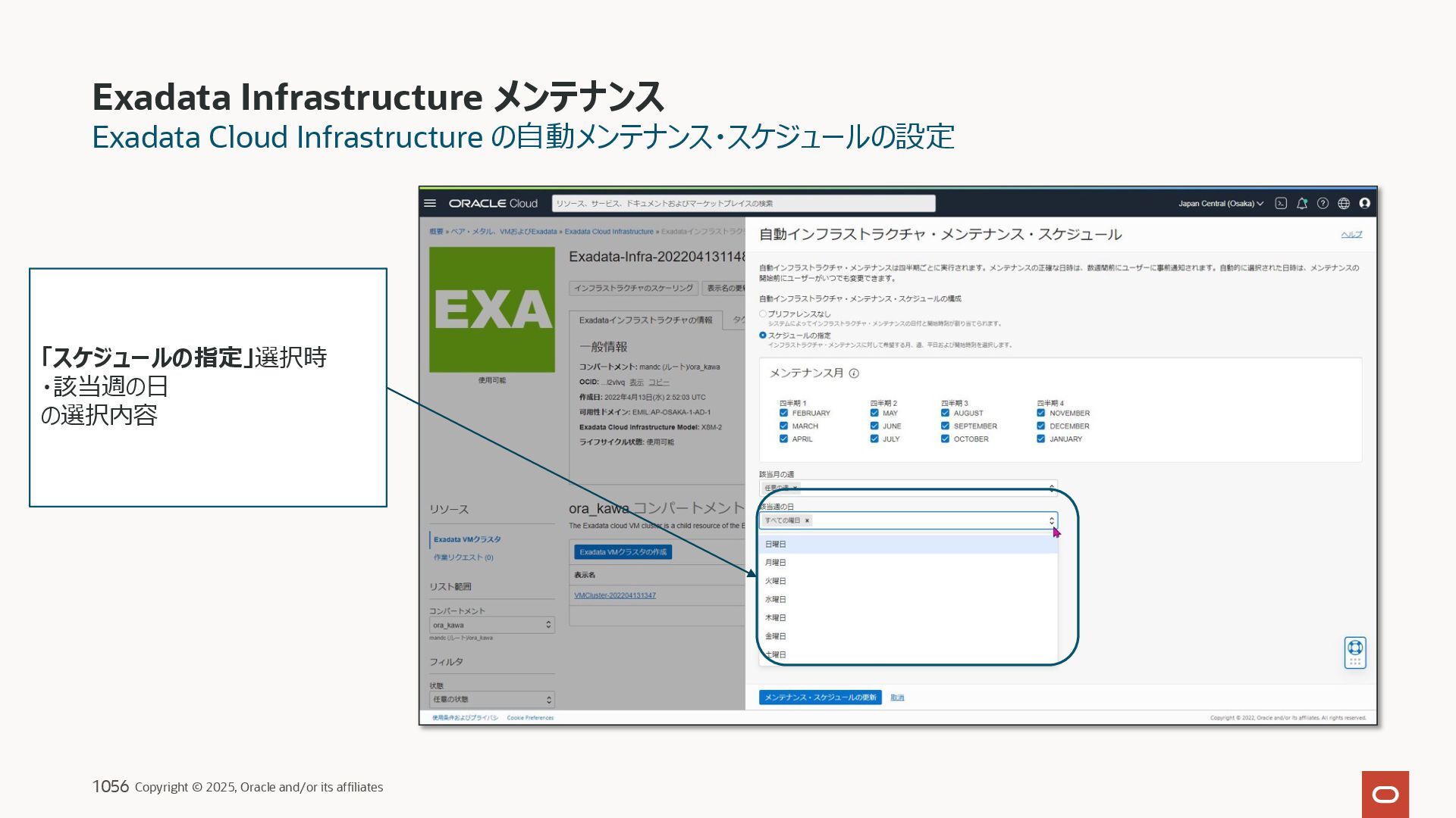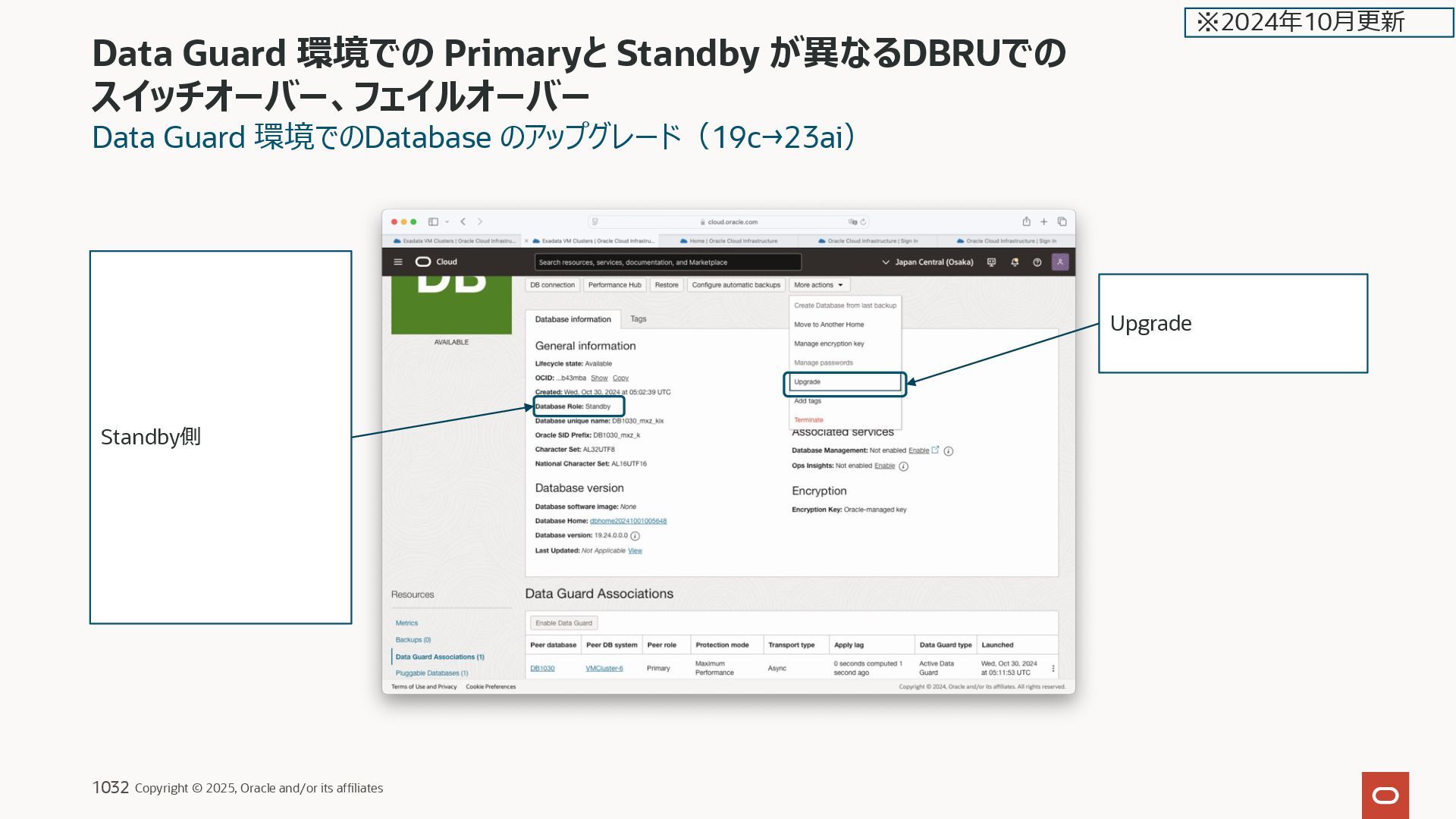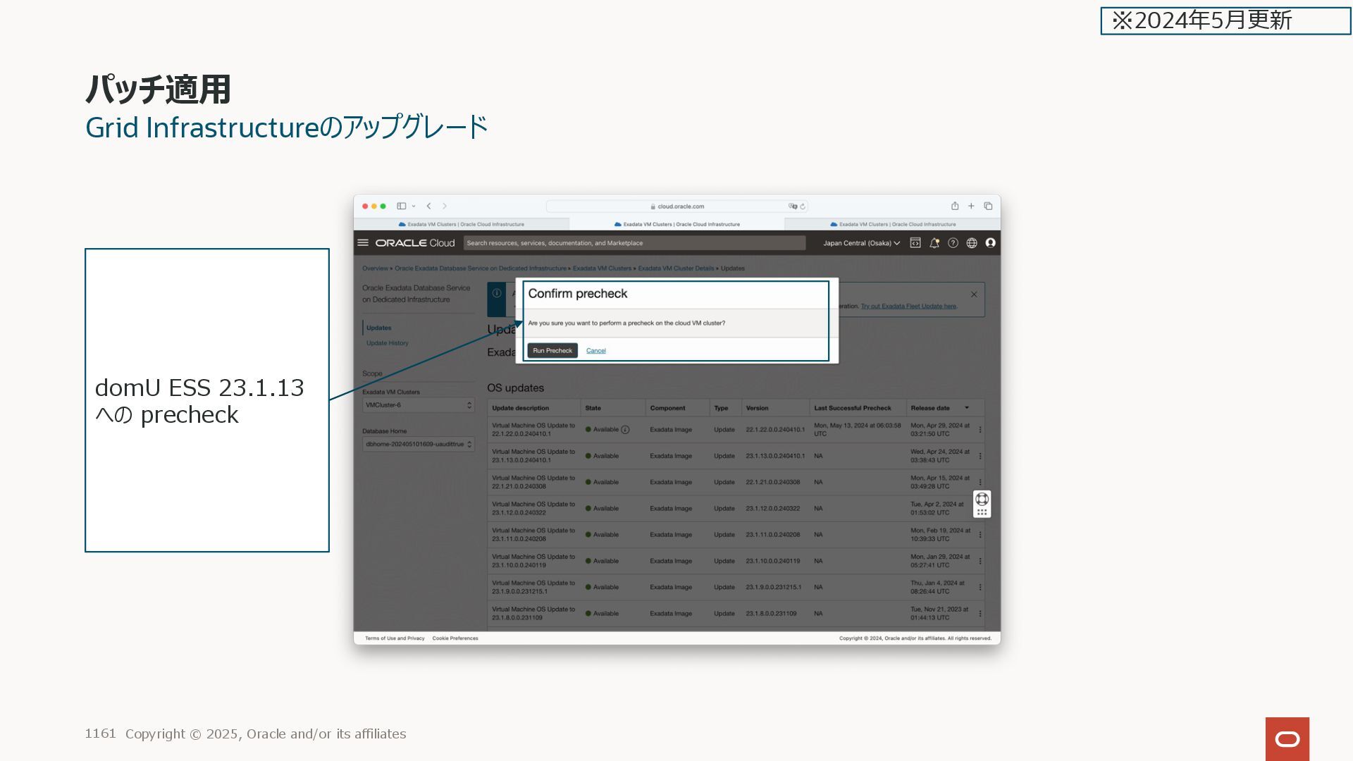 2025-04-03T01:31:51.131744+00:00 SQL> ALTER DISKGROUP DATAC2 DROP DISK 'DATAC2_CD_00_kix101117exdcl10', 'DATAC2_CD_01_kix101117exdcl10', 'DATAC2_CD_02_kix101117exdcl10', 'DATAC2_CD_03_kix101117exdcl10', 'DATAC2_CD_04_kix101117exdcl10', 'DATAC2_CD_05_kix101117exdcl10', 'DATAC2_CD_06_kix101117exdcl10', 'DATAC2_CD_07_kix101117exdcl10', 'DATAC2_CD_08_kix101117exdcl10', 'DATAC2_CD_09_kix101117exdcl10', 'DATAC2_CD_10_kix101117exdcl10', 'DATAC2_CD_11_kix101117exdcl10' REBALANCE POWER 4 略 SUCCESS: ALTER DISKGROUP RECOC2 DROP DISK 'RECOC2_CD_00_kix101117exdcl10', 'RECOC2_CD_01_kix101117exdcl10', 'RECOC2_CD_02_kix101117exdcl10', 'RECOC2_CD_03_kix101117exdcl10', 'RECOC2_CD_04_kix101117exdcl10', 'RECOC2_CD_05_kix101117exdcl10', 'RECOC2_CD_06_kix101117exdcl10', 'RECOC2_CD_07_kix101117exdcl10', 'RECOC2_CD_08_kix101117exdcl10', 'RECOC2_CD_09_kix101117exdcl10', 'RECOC2_CD_10_kix101117exdcl10', 'RECOC2_CD_11_kix101117exdcl10' REBALANCE POWER 4 NOTE: Attempting voting file refresh on diskgroup RECOC2 NOTE: Refresh completed on diskgroup RECOC2. No voting file found. 2025-04-03T01:32:19.466977+00:00 Exadata Infrastructure Copyright © 2025, Oracle and/or its affiliates 132 ※2025年4⽉更新