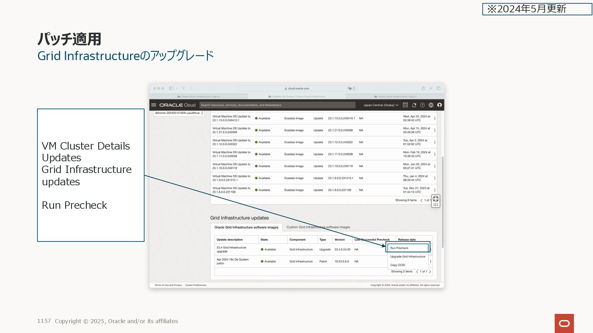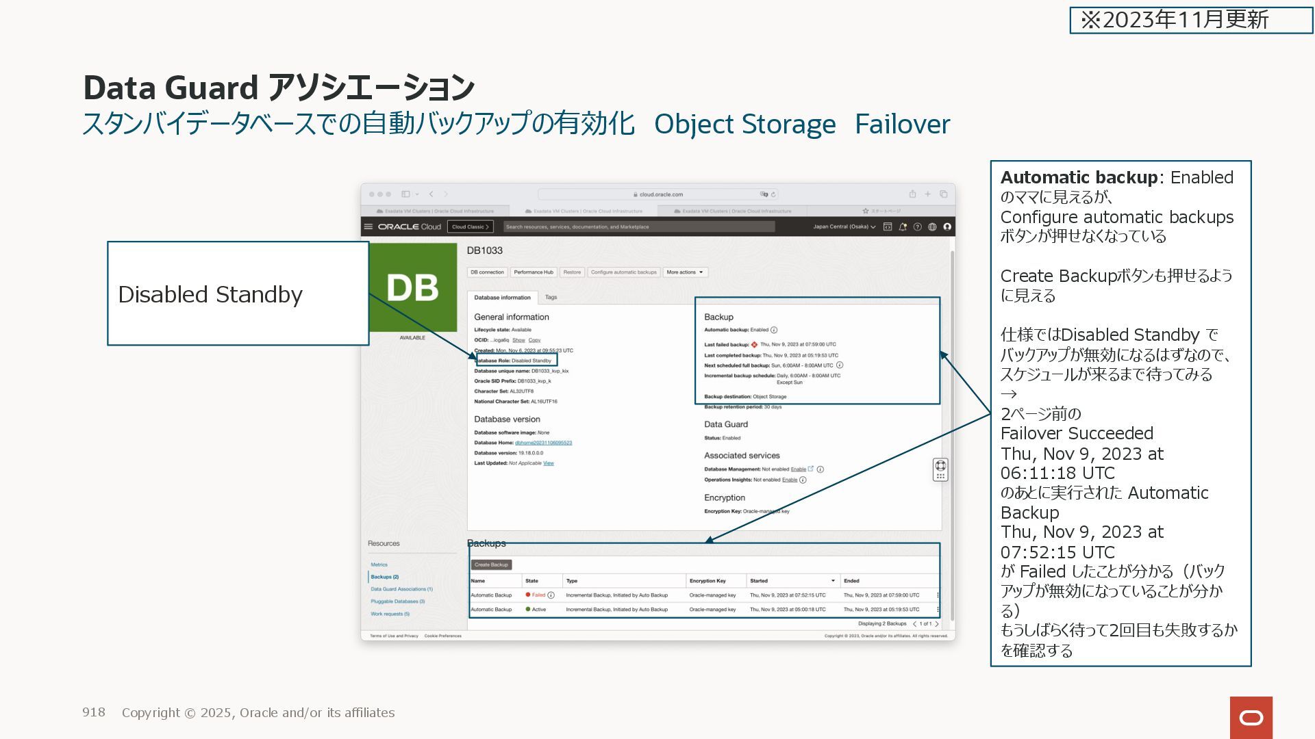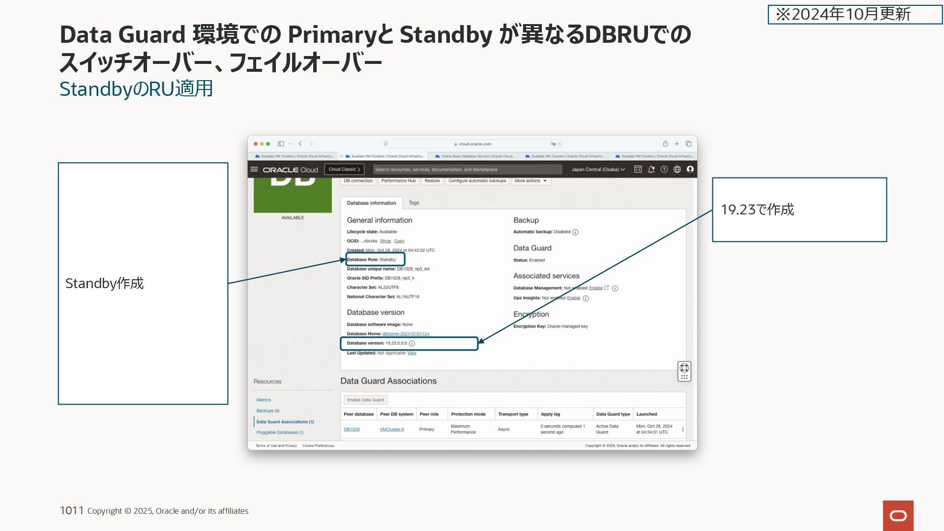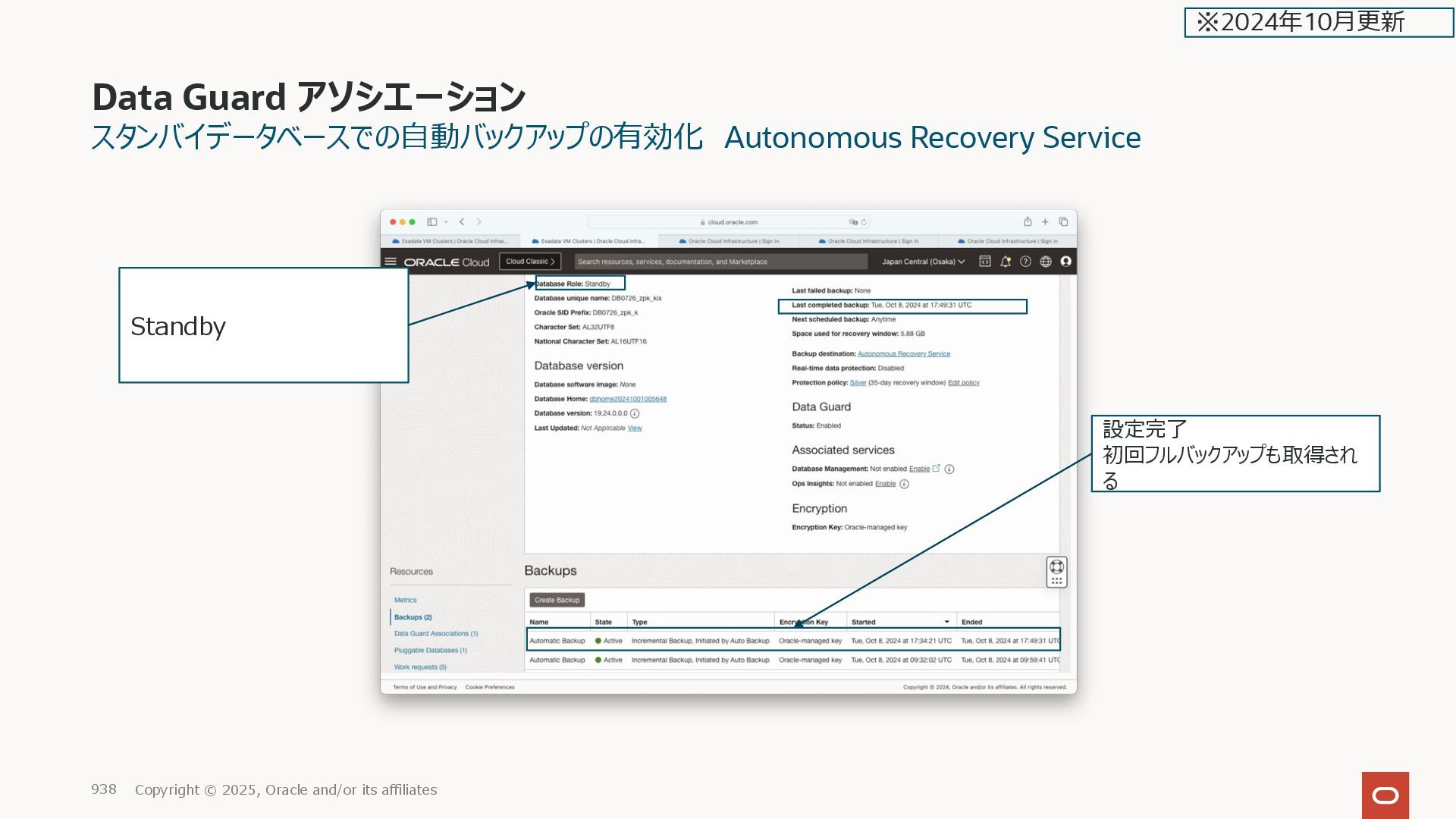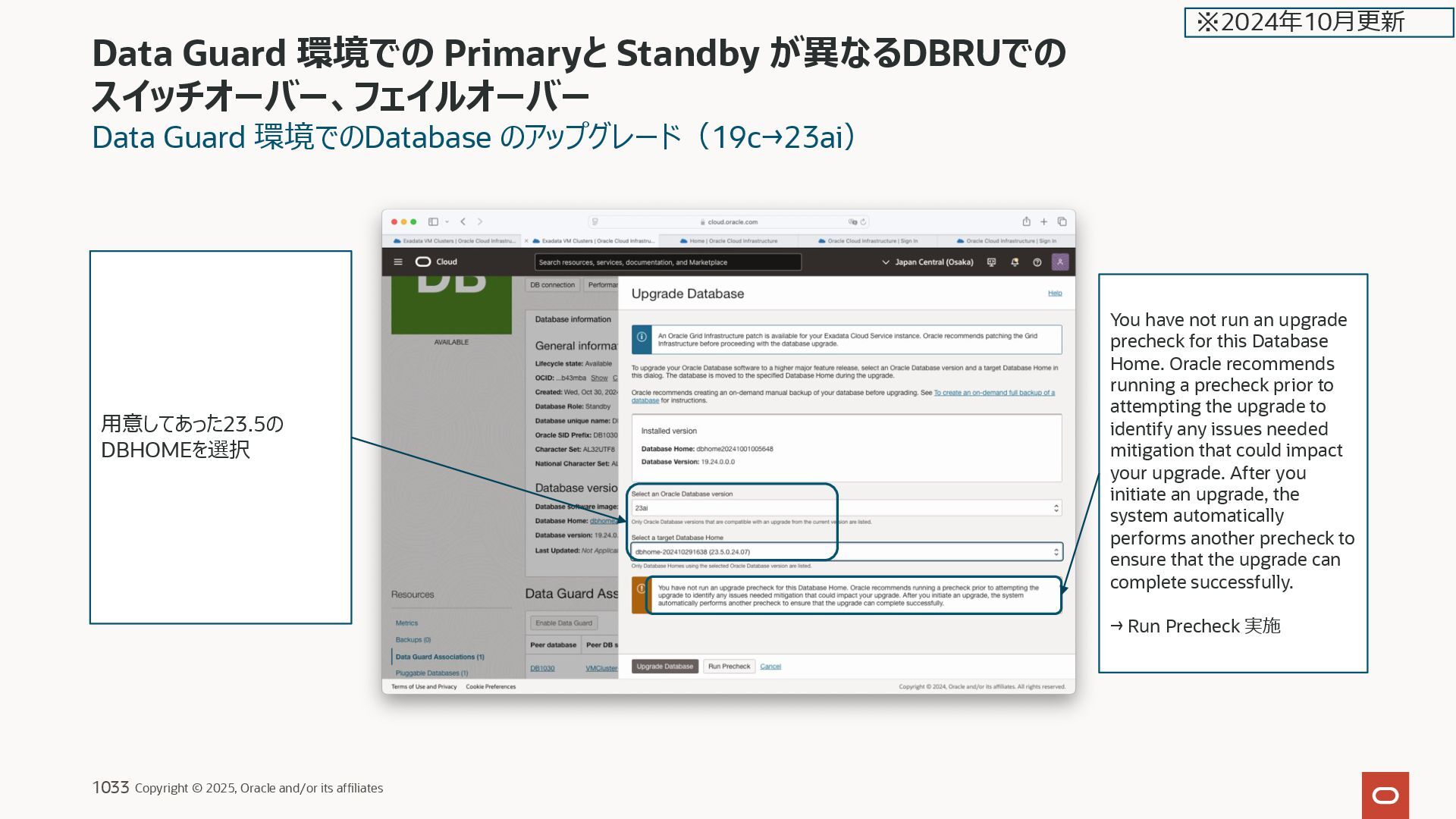 2025-04-03T01:31:51.131744+00:00 SQL> ALTER DISKGROUP DATAC2 DROP DISK 'DATAC2_CD_00_kix101117exdcl10', 'DATAC2_CD_01_kix101117exdcl10', 'DATAC2_CD_02_kix101117exdcl10', 'DATAC2_CD_03_kix101117exdcl10', 'DATAC2_CD_04_kix101117exdcl10', 'DATAC2_CD_05_kix101117exdcl10', 'DATAC2_CD_06_kix101117exdcl10', 'DATAC2_CD_07_kix101117exdcl10', 'DATAC2_CD_08_kix101117exdcl10', 'DATAC2_CD_09_kix101117exdcl10', 'DATAC2_CD_10_kix101117exdcl10', 'DATAC2_CD_11_kix101117exdcl10' REBALANCE POWER 4 略 SUCCESS: ALTER DISKGROUP RECOC2 DROP DISK 'RECOC2_CD_00_kix101117exdcl10', 'RECOC2_CD_01_kix101117exdcl10', 'RECOC2_CD_02_kix101117exdcl10', 'RECOC2_CD_03_kix101117exdcl10', 'RECOC2_CD_04_kix101117exdcl10', 'RECOC2_CD_05_kix101117exdcl10', 'RECOC2_CD_06_kix101117exdcl10', 'RECOC2_CD_07_kix101117exdcl10', 'RECOC2_CD_08_kix101117exdcl10', 'RECOC2_CD_09_kix101117exdcl10', 'RECOC2_CD_10_kix101117exdcl10', 'RECOC2_CD_11_kix101117exdcl10' REBALANCE POWER 4 NOTE: Attempting voting file refresh on diskgroup RECOC2 NOTE: Refresh completed on diskgroup RECOC2. No voting file found. 2025-04-03T01:32:19.466977+00:00 Exadata Infrastructure Copyright © 2025, Oracle and/or its affiliates 132 ※2025年4⽉更新