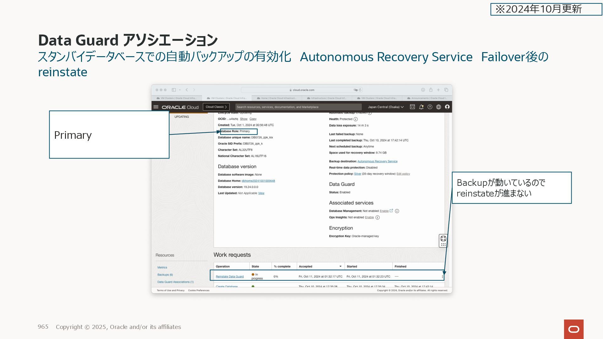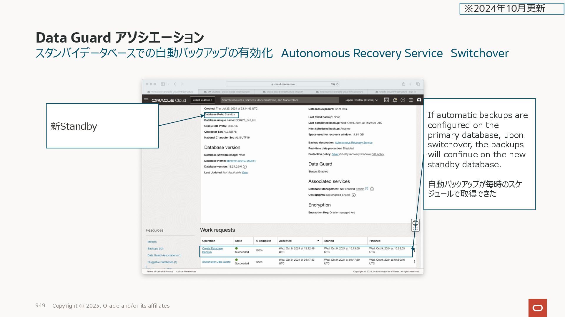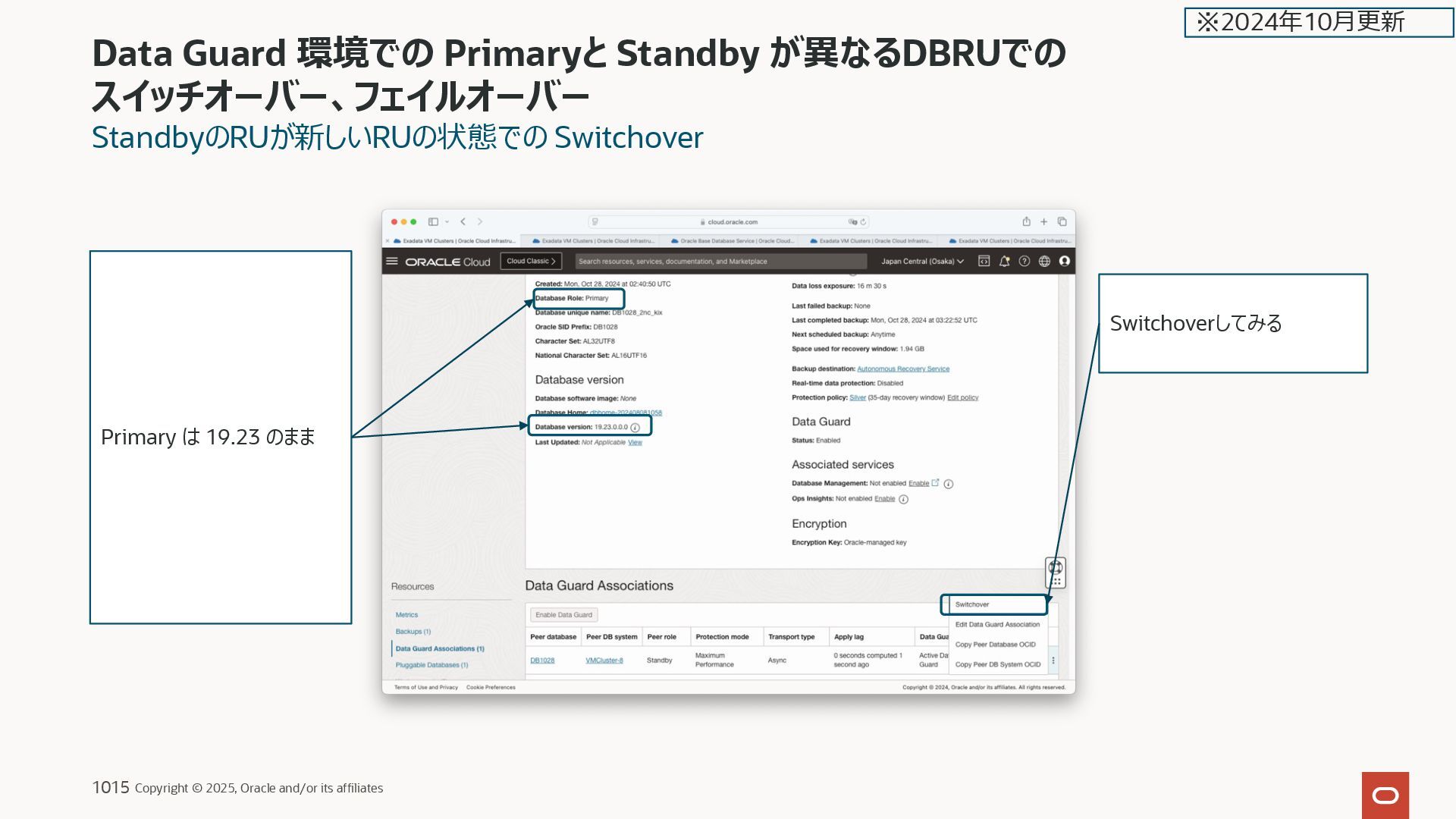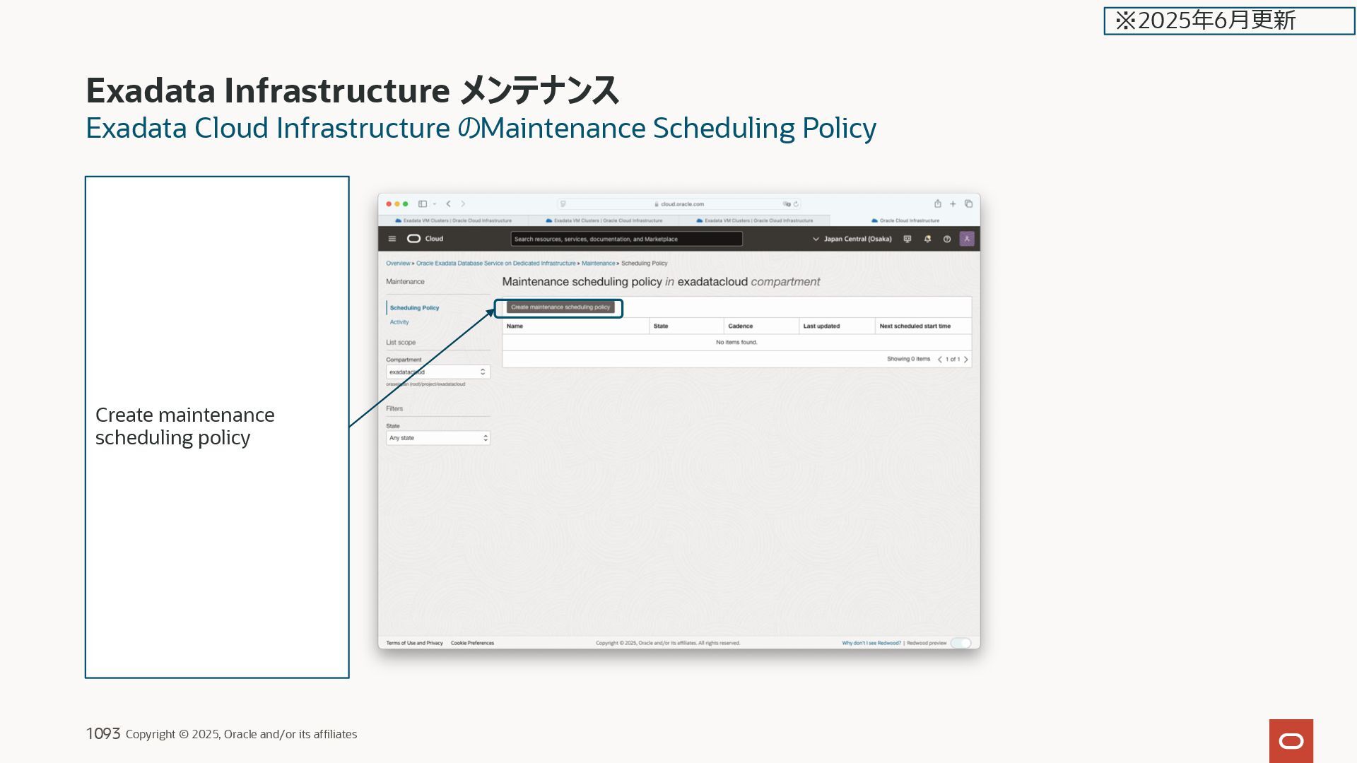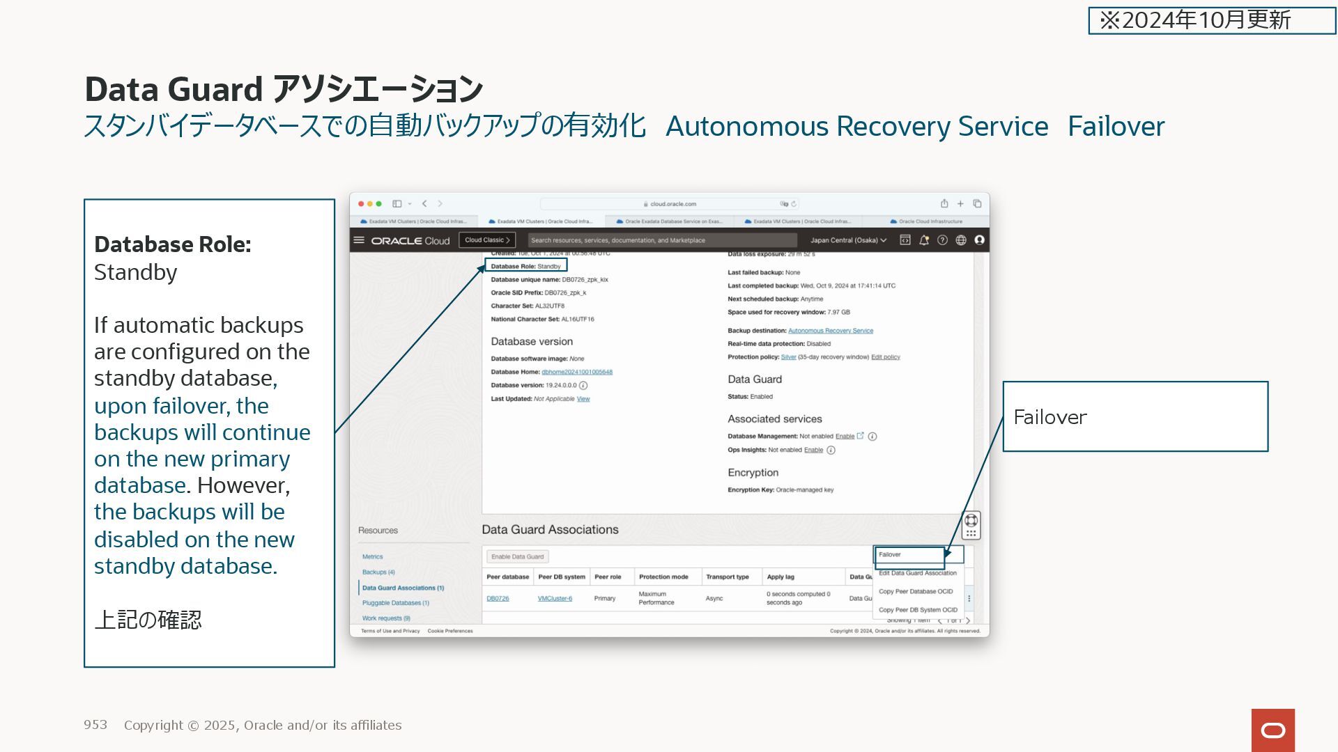 2025-04-03T01:31:51.131744+00:00 SQL> ALTER DISKGROUP DATAC2 DROP DISK 'DATAC2_CD_00_kix101117exdcl10', 'DATAC2_CD_01_kix101117exdcl10', 'DATAC2_CD_02_kix101117exdcl10', 'DATAC2_CD_03_kix101117exdcl10', 'DATAC2_CD_04_kix101117exdcl10', 'DATAC2_CD_05_kix101117exdcl10', 'DATAC2_CD_06_kix101117exdcl10', 'DATAC2_CD_07_kix101117exdcl10', 'DATAC2_CD_08_kix101117exdcl10', 'DATAC2_CD_09_kix101117exdcl10', 'DATAC2_CD_10_kix101117exdcl10', 'DATAC2_CD_11_kix101117exdcl10' REBALANCE POWER 4 略 SUCCESS: ALTER DISKGROUP RECOC2 DROP DISK 'RECOC2_CD_00_kix101117exdcl10', 'RECOC2_CD_01_kix101117exdcl10', 'RECOC2_CD_02_kix101117exdcl10', 'RECOC2_CD_03_kix101117exdcl10', 'RECOC2_CD_04_kix101117exdcl10', 'RECOC2_CD_05_kix101117exdcl10', 'RECOC2_CD_06_kix101117exdcl10', 'RECOC2_CD_07_kix101117exdcl10', 'RECOC2_CD_08_kix101117exdcl10', 'RECOC2_CD_09_kix101117exdcl10', 'RECOC2_CD_10_kix101117exdcl10', 'RECOC2_CD_11_kix101117exdcl10' REBALANCE POWER 4 NOTE: Attempting voting file refresh on diskgroup RECOC2 NOTE: Refresh completed on diskgroup RECOC2. No voting file found. 2025-04-03T01:32:19.466977+00:00 Exadata Infrastructure Copyright © 2025, Oracle and/or its affiliates 132 ※2025年4⽉更新
