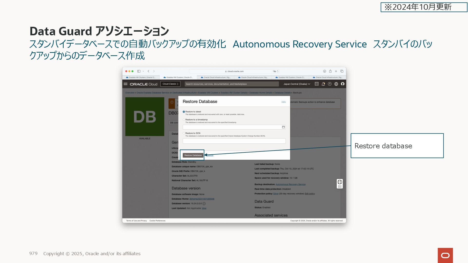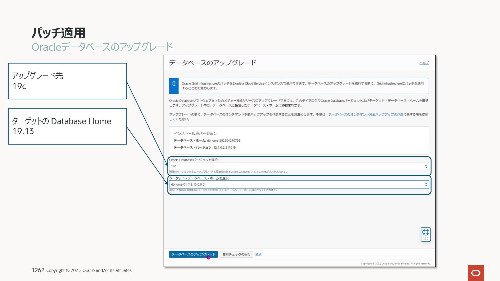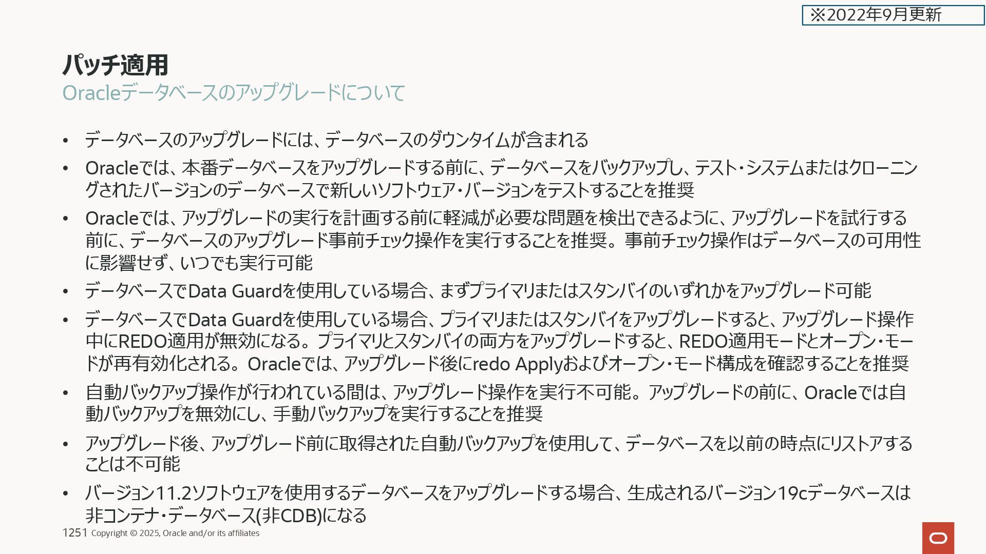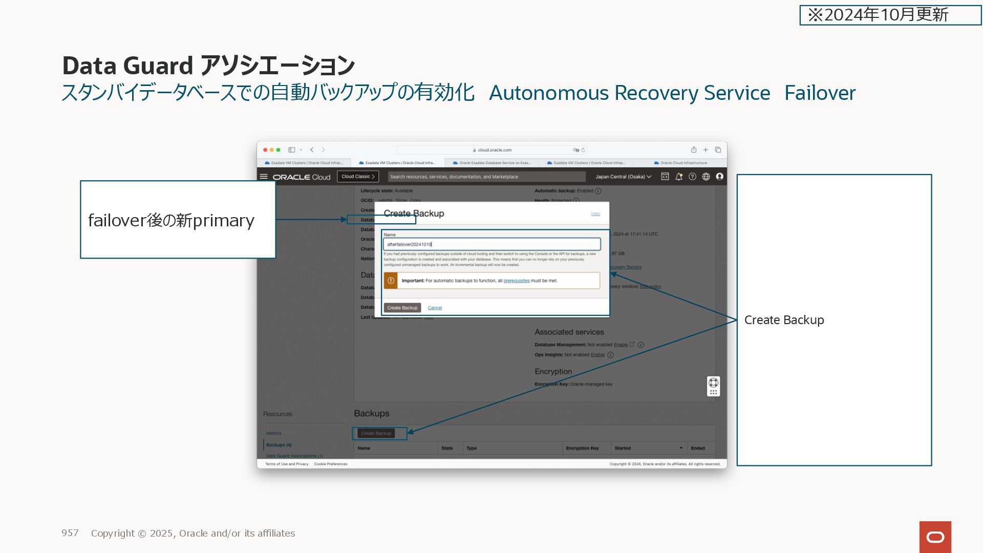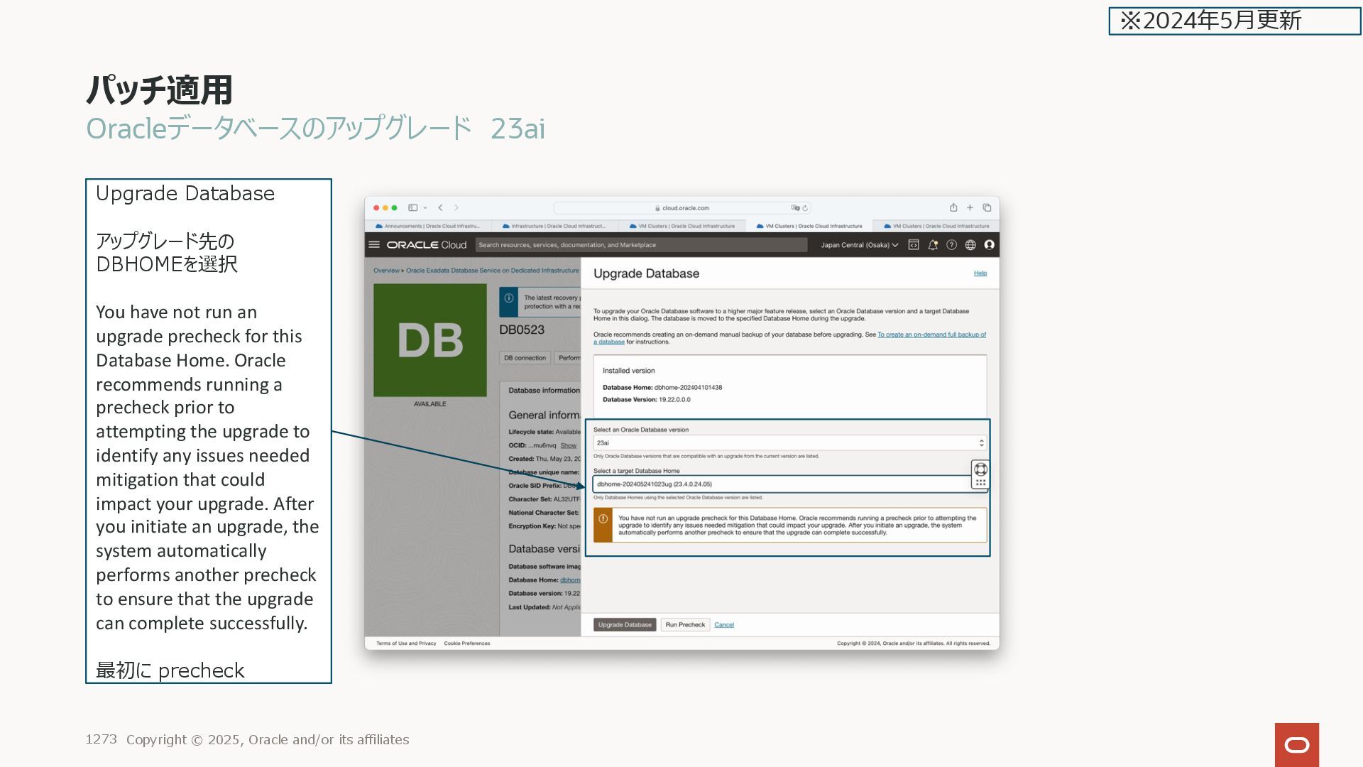 2025-04-03T01:31:51.131744+00:00 SQL> ALTER DISKGROUP DATAC2 DROP DISK 'DATAC2_CD_00_kix101117exdcl10', 'DATAC2_CD_01_kix101117exdcl10', 'DATAC2_CD_02_kix101117exdcl10', 'DATAC2_CD_03_kix101117exdcl10', 'DATAC2_CD_04_kix101117exdcl10', 'DATAC2_CD_05_kix101117exdcl10', 'DATAC2_CD_06_kix101117exdcl10', 'DATAC2_CD_07_kix101117exdcl10', 'DATAC2_CD_08_kix101117exdcl10', 'DATAC2_CD_09_kix101117exdcl10', 'DATAC2_CD_10_kix101117exdcl10', 'DATAC2_CD_11_kix101117exdcl10' REBALANCE POWER 4 略 SUCCESS: ALTER DISKGROUP RECOC2 DROP DISK 'RECOC2_CD_00_kix101117exdcl10', 'RECOC2_CD_01_kix101117exdcl10', 'RECOC2_CD_02_kix101117exdcl10', 'RECOC2_CD_03_kix101117exdcl10', 'RECOC2_CD_04_kix101117exdcl10', 'RECOC2_CD_05_kix101117exdcl10', 'RECOC2_CD_06_kix101117exdcl10', 'RECOC2_CD_07_kix101117exdcl10', 'RECOC2_CD_08_kix101117exdcl10', 'RECOC2_CD_09_kix101117exdcl10', 'RECOC2_CD_10_kix101117exdcl10', 'RECOC2_CD_11_kix101117exdcl10' REBALANCE POWER 4 NOTE: Attempting voting file refresh on diskgroup RECOC2 NOTE: Refresh completed on diskgroup RECOC2. No voting file found. 2025-04-03T01:32:19.466977+00:00 Exadata Infrastructure Copyright © 2025, Oracle and/or its affiliates 132 ※2025年4⽉更新