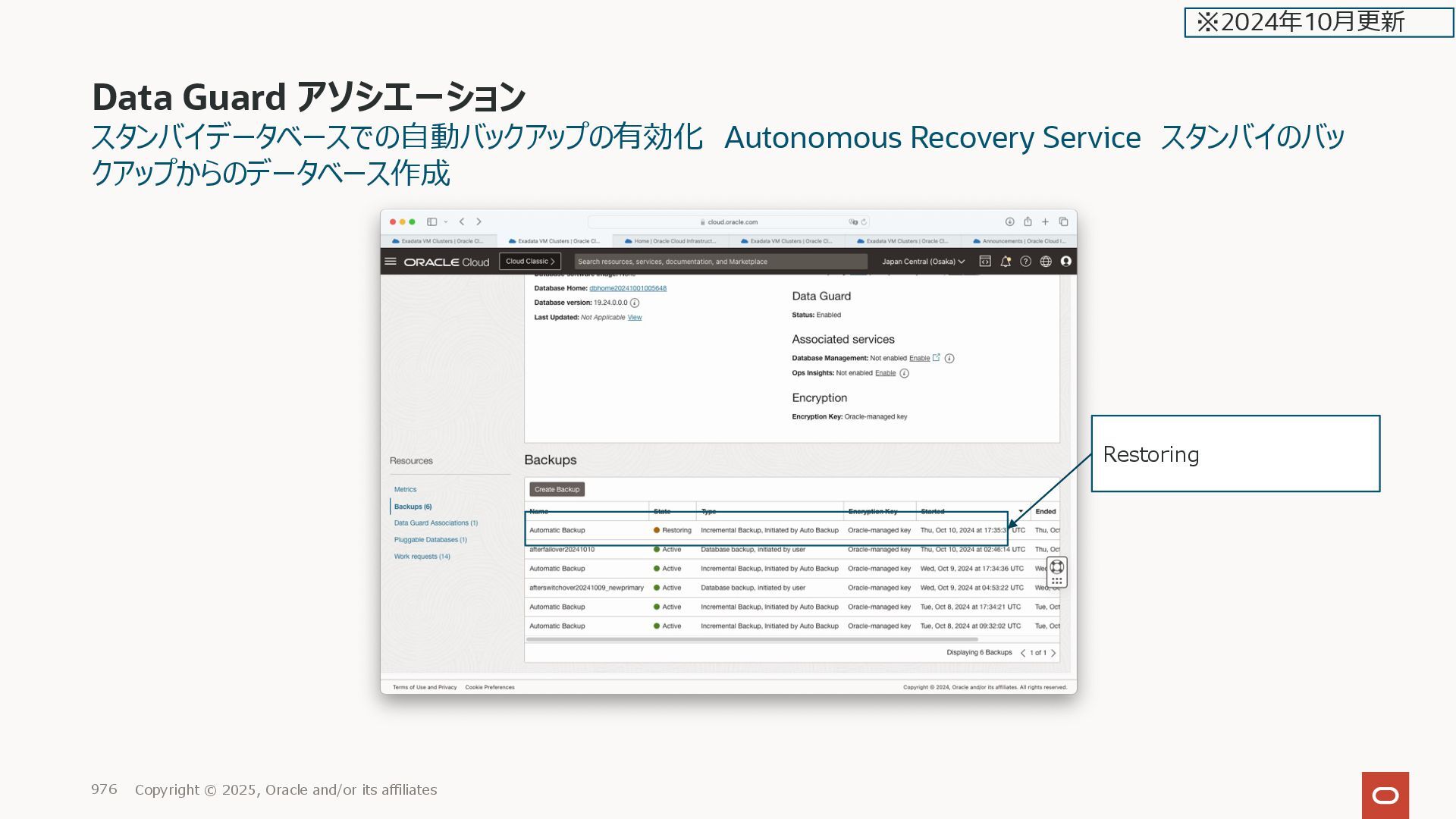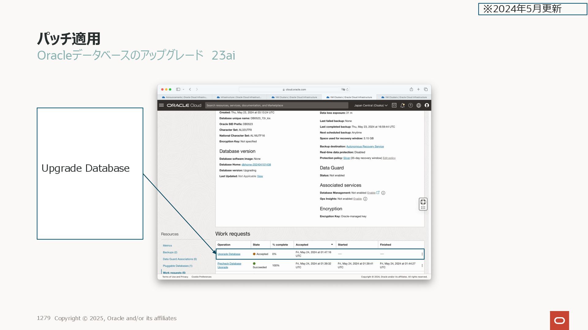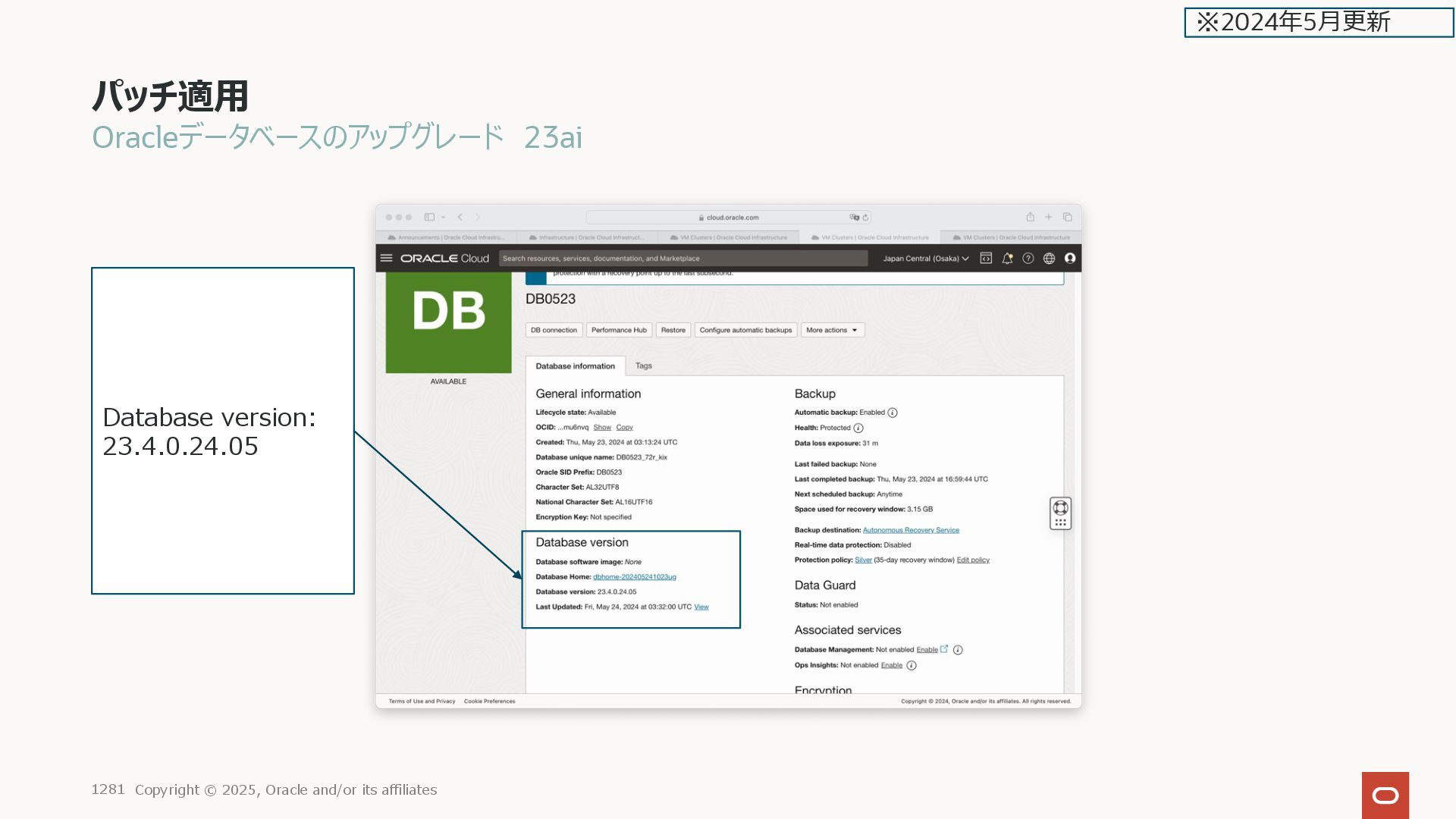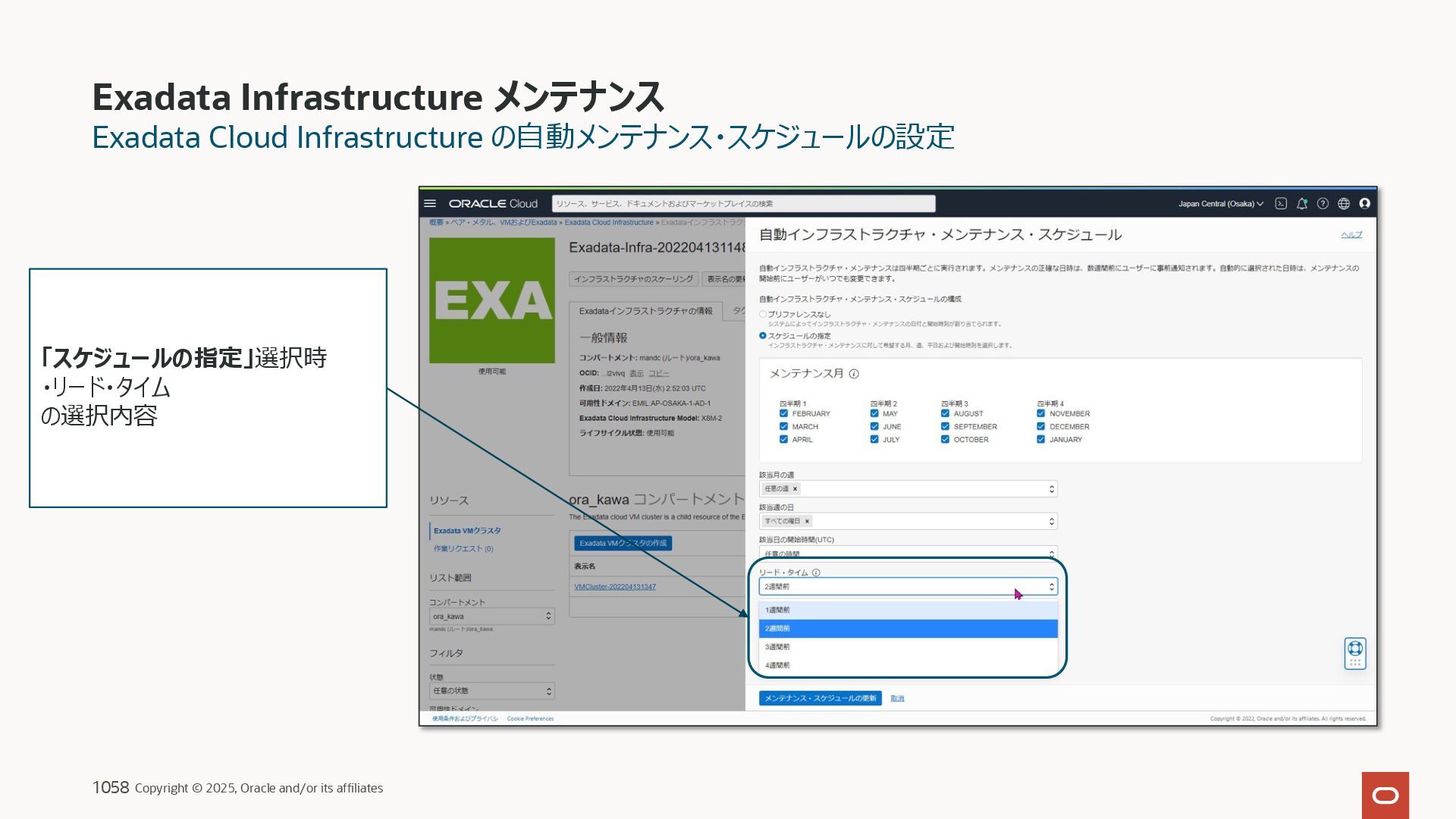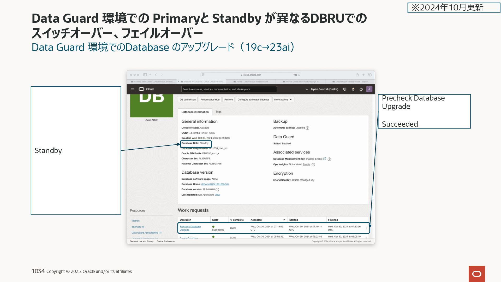 2025-04-03T01:31:51.131744+00:00 SQL> ALTER DISKGROUP DATAC2 DROP DISK 'DATAC2_CD_00_kix101117exdcl10', 'DATAC2_CD_01_kix101117exdcl10', 'DATAC2_CD_02_kix101117exdcl10', 'DATAC2_CD_03_kix101117exdcl10', 'DATAC2_CD_04_kix101117exdcl10', 'DATAC2_CD_05_kix101117exdcl10', 'DATAC2_CD_06_kix101117exdcl10', 'DATAC2_CD_07_kix101117exdcl10', 'DATAC2_CD_08_kix101117exdcl10', 'DATAC2_CD_09_kix101117exdcl10', 'DATAC2_CD_10_kix101117exdcl10', 'DATAC2_CD_11_kix101117exdcl10' REBALANCE POWER 4 略 SUCCESS: ALTER DISKGROUP RECOC2 DROP DISK 'RECOC2_CD_00_kix101117exdcl10', 'RECOC2_CD_01_kix101117exdcl10', 'RECOC2_CD_02_kix101117exdcl10', 'RECOC2_CD_03_kix101117exdcl10', 'RECOC2_CD_04_kix101117exdcl10', 'RECOC2_CD_05_kix101117exdcl10', 'RECOC2_CD_06_kix101117exdcl10', 'RECOC2_CD_07_kix101117exdcl10', 'RECOC2_CD_08_kix101117exdcl10', 'RECOC2_CD_09_kix101117exdcl10', 'RECOC2_CD_10_kix101117exdcl10', 'RECOC2_CD_11_kix101117exdcl10' REBALANCE POWER 4 NOTE: Attempting voting file refresh on diskgroup RECOC2 NOTE: Refresh completed on diskgroup RECOC2. No voting file found. 2025-04-03T01:32:19.466977+00:00 Exadata Infrastructure Copyright © 2025, Oracle and/or its affiliates 132 ※2025年4⽉更新