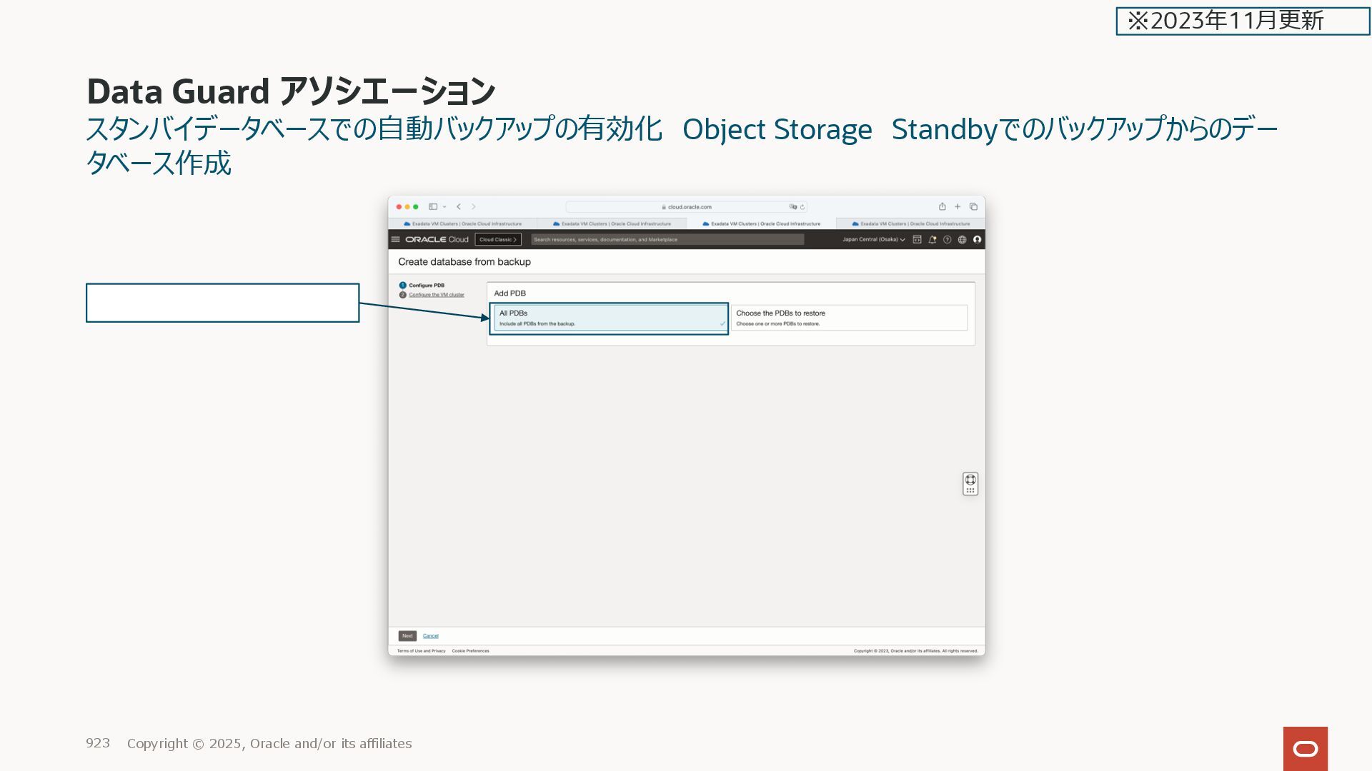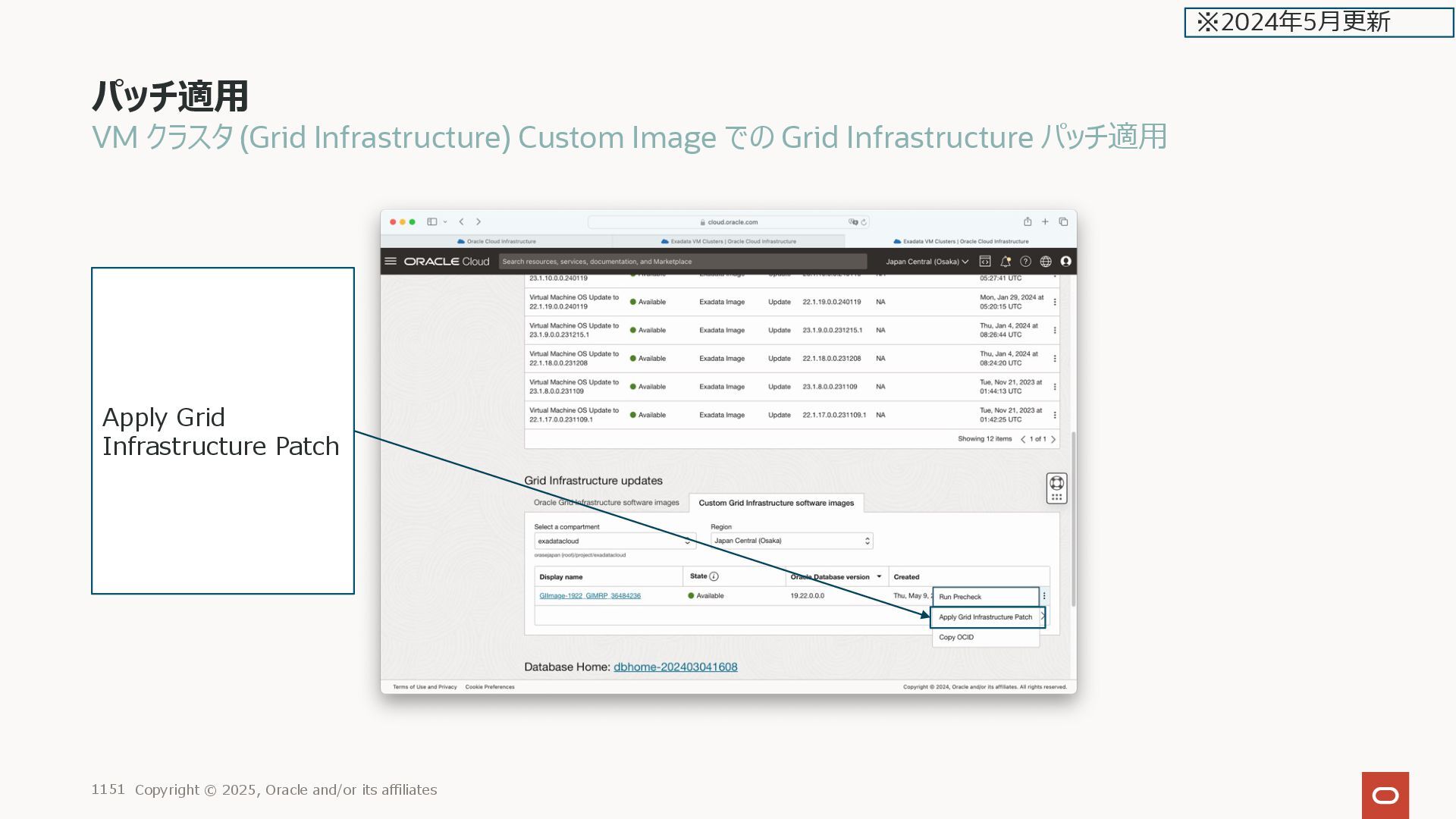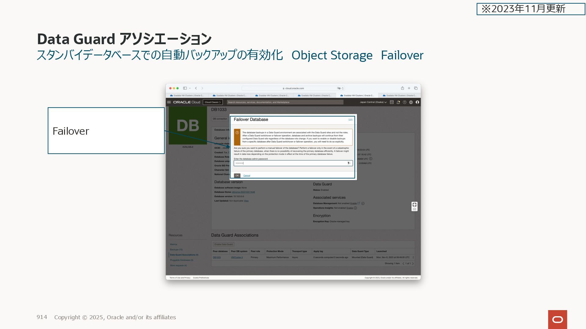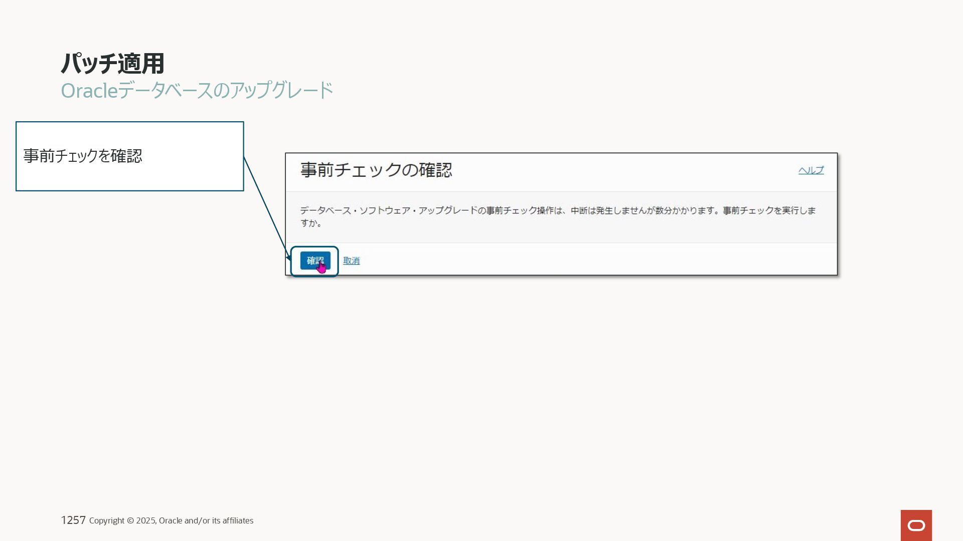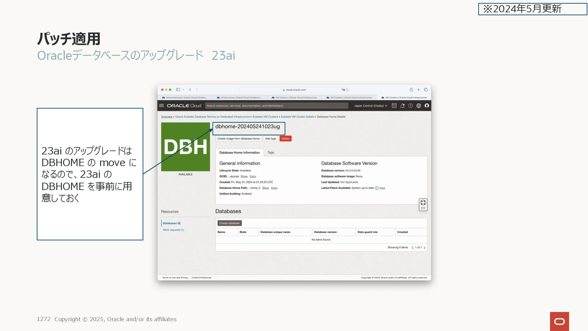 2025-04-03T01:31:51.131744+00:00 SQL> ALTER DISKGROUP DATAC2 DROP DISK 'DATAC2_CD_00_kix101117exdcl10', 'DATAC2_CD_01_kix101117exdcl10', 'DATAC2_CD_02_kix101117exdcl10', 'DATAC2_CD_03_kix101117exdcl10', 'DATAC2_CD_04_kix101117exdcl10', 'DATAC2_CD_05_kix101117exdcl10', 'DATAC2_CD_06_kix101117exdcl10', 'DATAC2_CD_07_kix101117exdcl10', 'DATAC2_CD_08_kix101117exdcl10', 'DATAC2_CD_09_kix101117exdcl10', 'DATAC2_CD_10_kix101117exdcl10', 'DATAC2_CD_11_kix101117exdcl10' REBALANCE POWER 4 略 SUCCESS: ALTER DISKGROUP RECOC2 DROP DISK 'RECOC2_CD_00_kix101117exdcl10', 'RECOC2_CD_01_kix101117exdcl10', 'RECOC2_CD_02_kix101117exdcl10', 'RECOC2_CD_03_kix101117exdcl10', 'RECOC2_CD_04_kix101117exdcl10', 'RECOC2_CD_05_kix101117exdcl10', 'RECOC2_CD_06_kix101117exdcl10', 'RECOC2_CD_07_kix101117exdcl10', 'RECOC2_CD_08_kix101117exdcl10', 'RECOC2_CD_09_kix101117exdcl10', 'RECOC2_CD_10_kix101117exdcl10', 'RECOC2_CD_11_kix101117exdcl10' REBALANCE POWER 4 NOTE: Attempting voting file refresh on diskgroup RECOC2 NOTE: Refresh completed on diskgroup RECOC2. No voting file found. 2025-04-03T01:32:19.466977+00:00 Exadata Infrastructure Copyright © 2025, Oracle and/or its affiliates 132 ※2025年4⽉更新