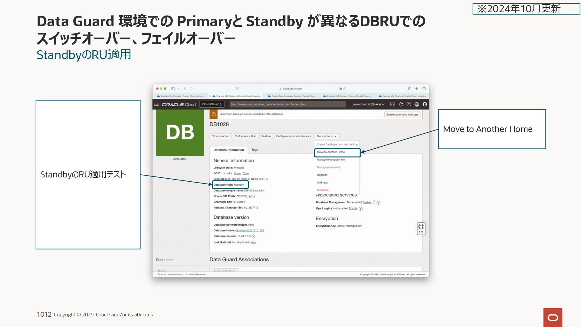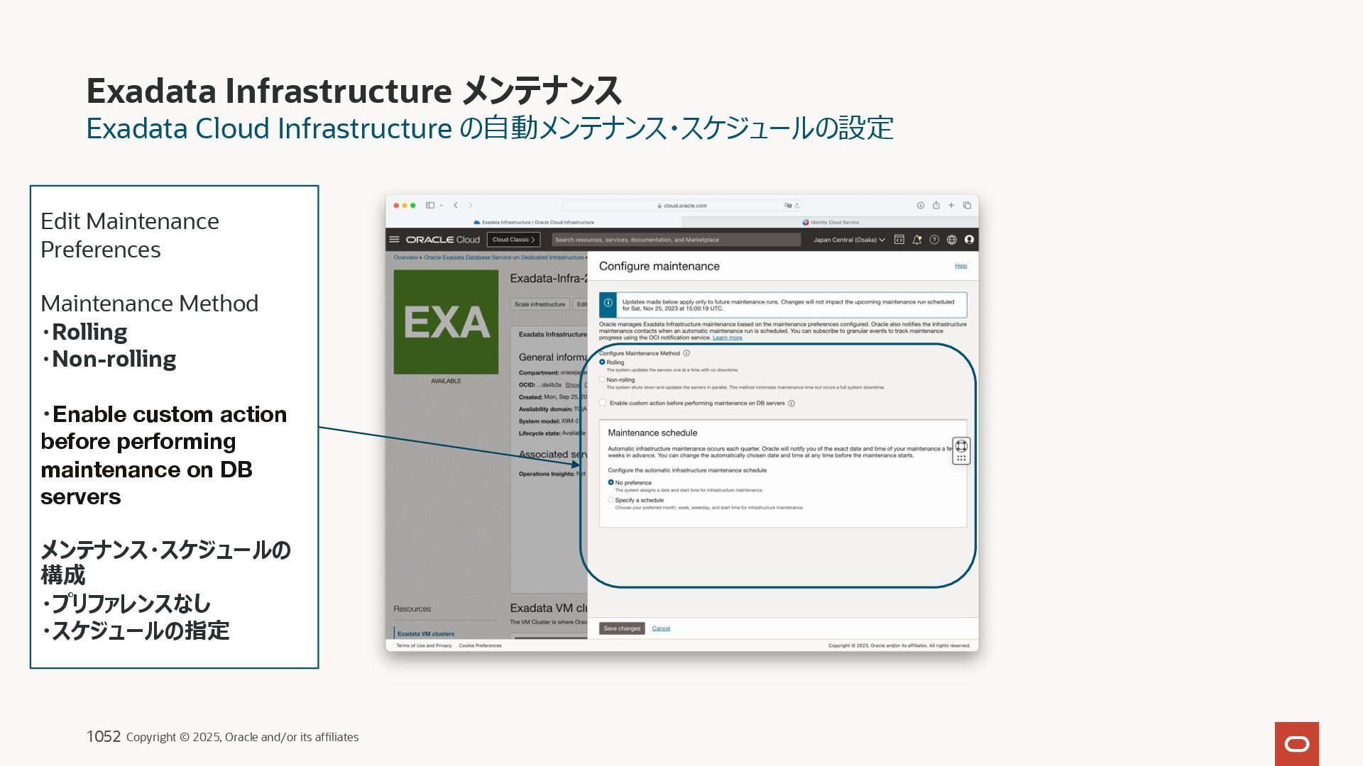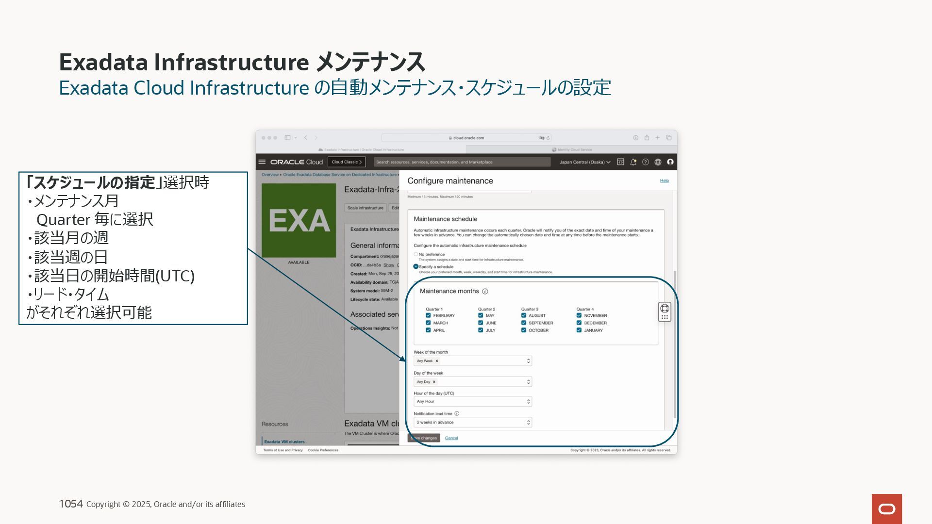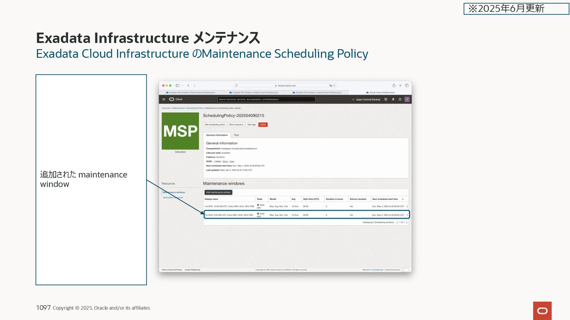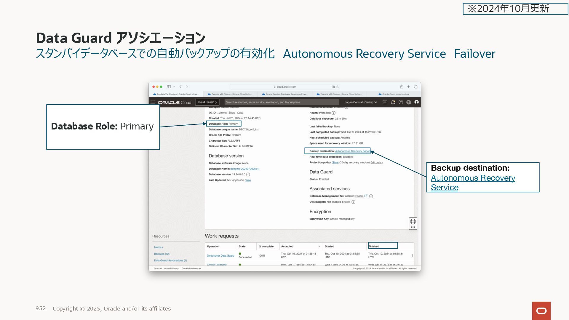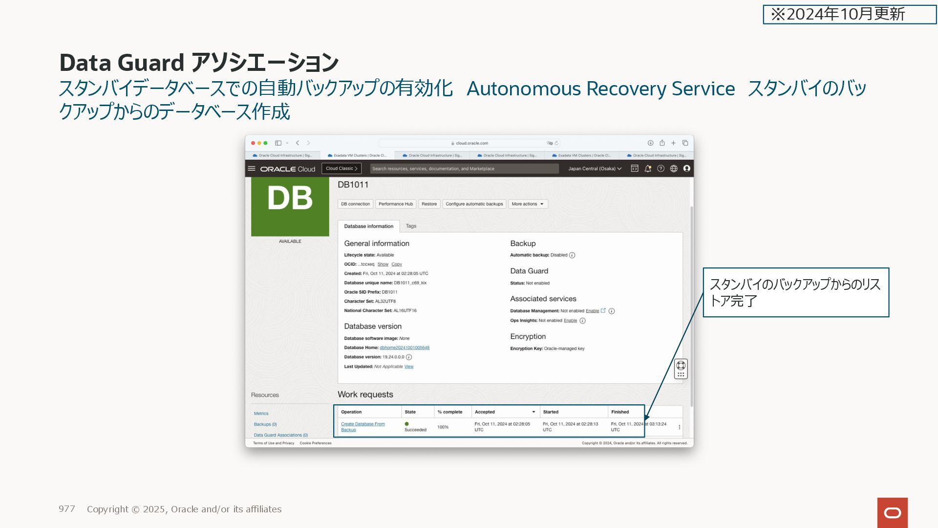 2025-04-03T01:31:51.131744+00:00 SQL> ALTER DISKGROUP DATAC2 DROP DISK 'DATAC2_CD_00_kix101117exdcl10', 'DATAC2_CD_01_kix101117exdcl10', 'DATAC2_CD_02_kix101117exdcl10', 'DATAC2_CD_03_kix101117exdcl10', 'DATAC2_CD_04_kix101117exdcl10', 'DATAC2_CD_05_kix101117exdcl10', 'DATAC2_CD_06_kix101117exdcl10', 'DATAC2_CD_07_kix101117exdcl10', 'DATAC2_CD_08_kix101117exdcl10', 'DATAC2_CD_09_kix101117exdcl10', 'DATAC2_CD_10_kix101117exdcl10', 'DATAC2_CD_11_kix101117exdcl10' REBALANCE POWER 4 略 SUCCESS: ALTER DISKGROUP RECOC2 DROP DISK 'RECOC2_CD_00_kix101117exdcl10', 'RECOC2_CD_01_kix101117exdcl10', 'RECOC2_CD_02_kix101117exdcl10', 'RECOC2_CD_03_kix101117exdcl10', 'RECOC2_CD_04_kix101117exdcl10', 'RECOC2_CD_05_kix101117exdcl10', 'RECOC2_CD_06_kix101117exdcl10', 'RECOC2_CD_07_kix101117exdcl10', 'RECOC2_CD_08_kix101117exdcl10', 'RECOC2_CD_09_kix101117exdcl10', 'RECOC2_CD_10_kix101117exdcl10', 'RECOC2_CD_11_kix101117exdcl10' REBALANCE POWER 4 NOTE: Attempting voting file refresh on diskgroup RECOC2 NOTE: Refresh completed on diskgroup RECOC2. No voting file found. 2025-04-03T01:32:19.466977+00:00 Exadata Infrastructure Copyright © 2025, Oracle and/or its affiliates 132 ※2025年4⽉更新