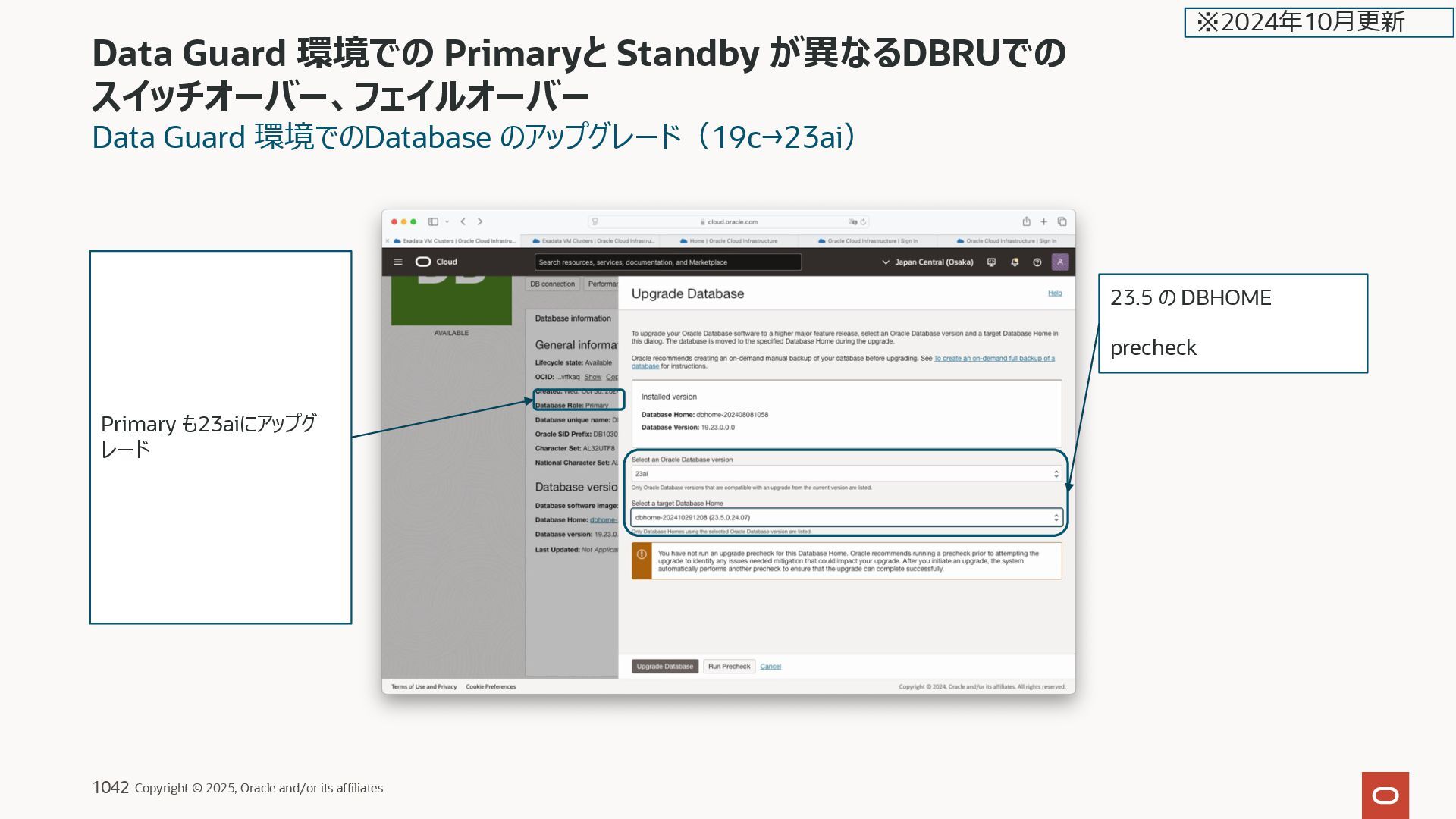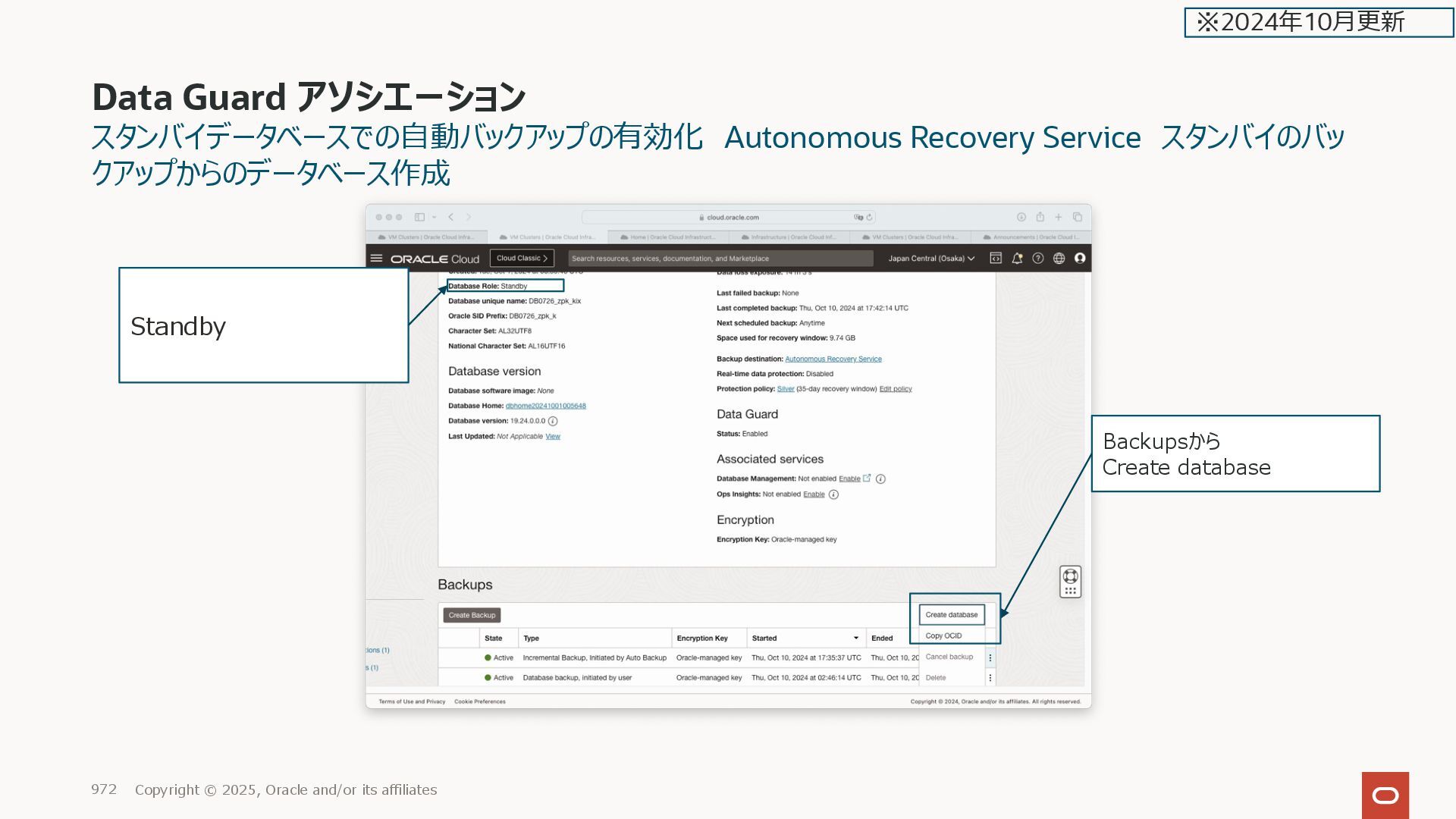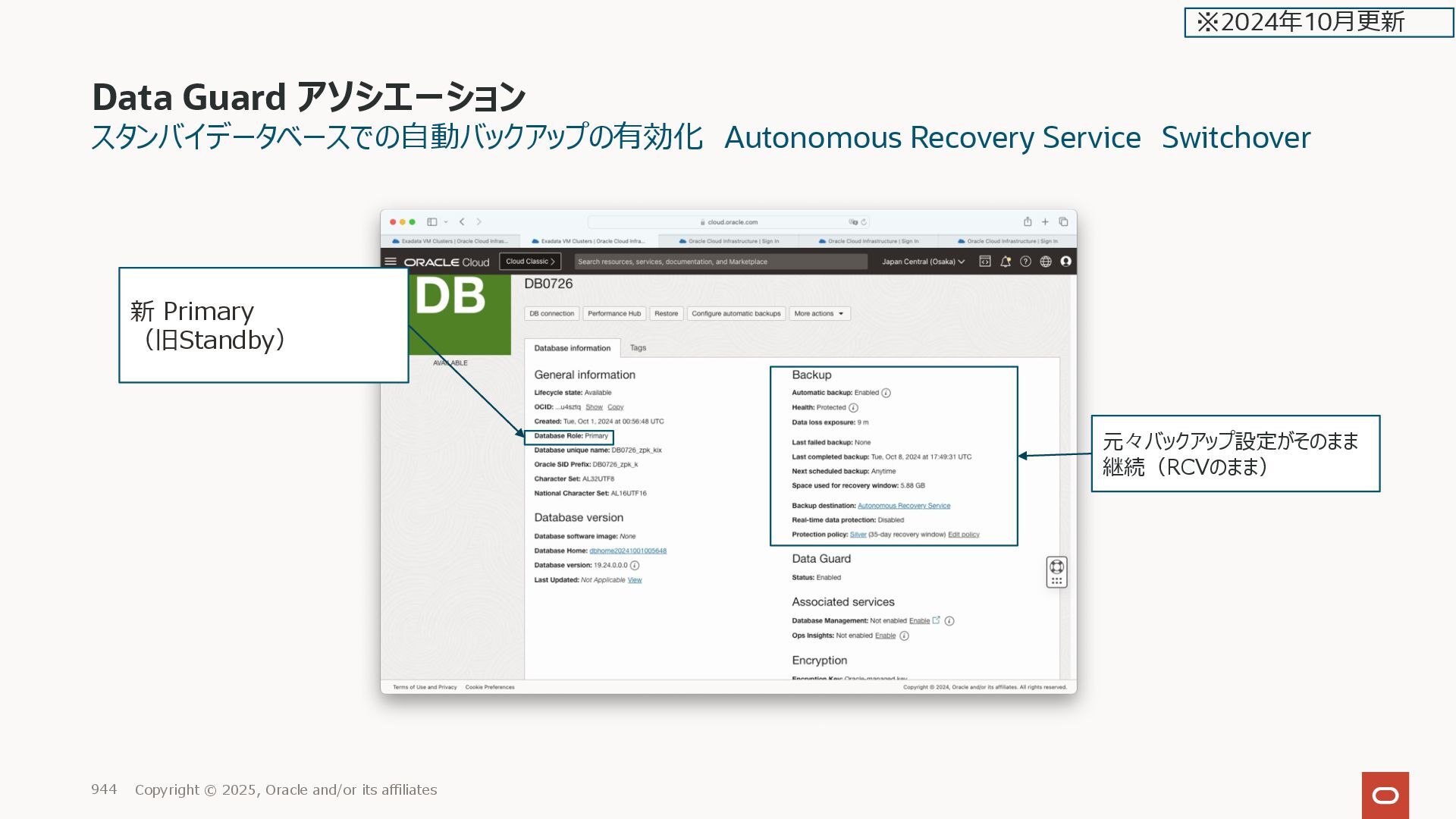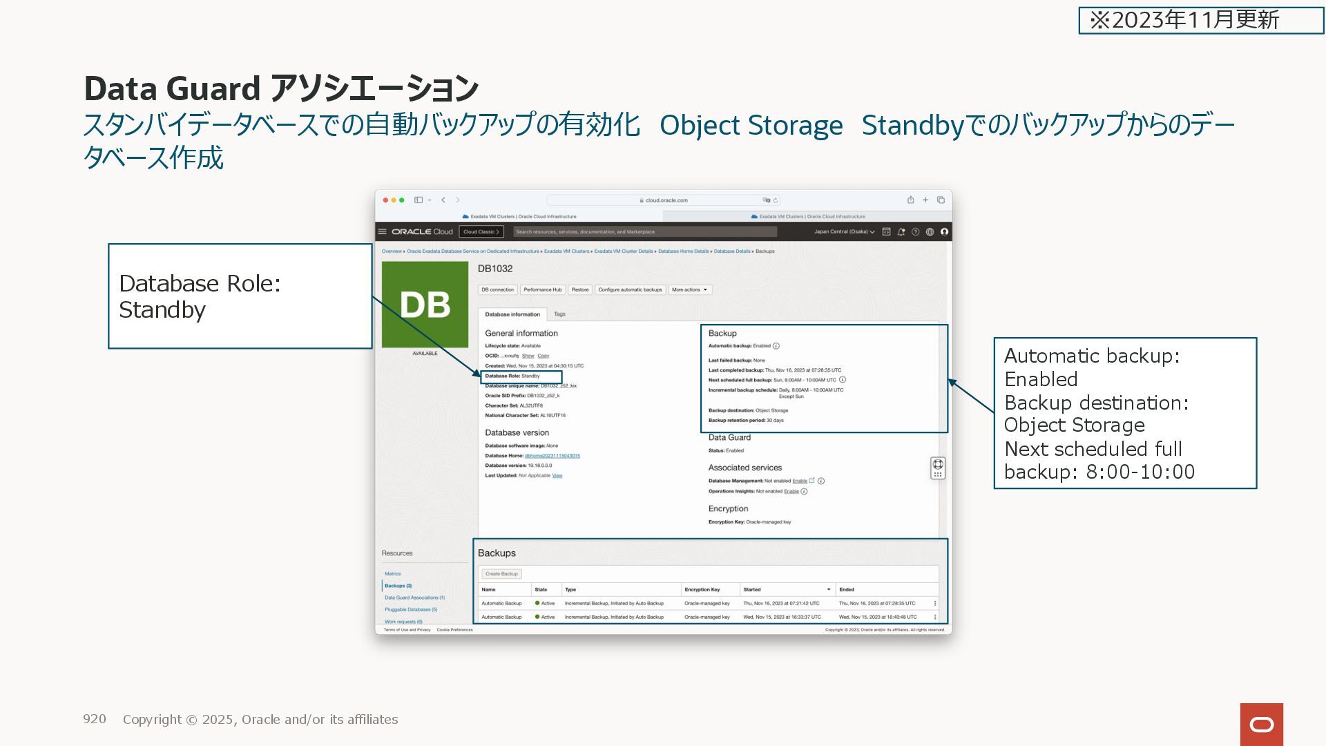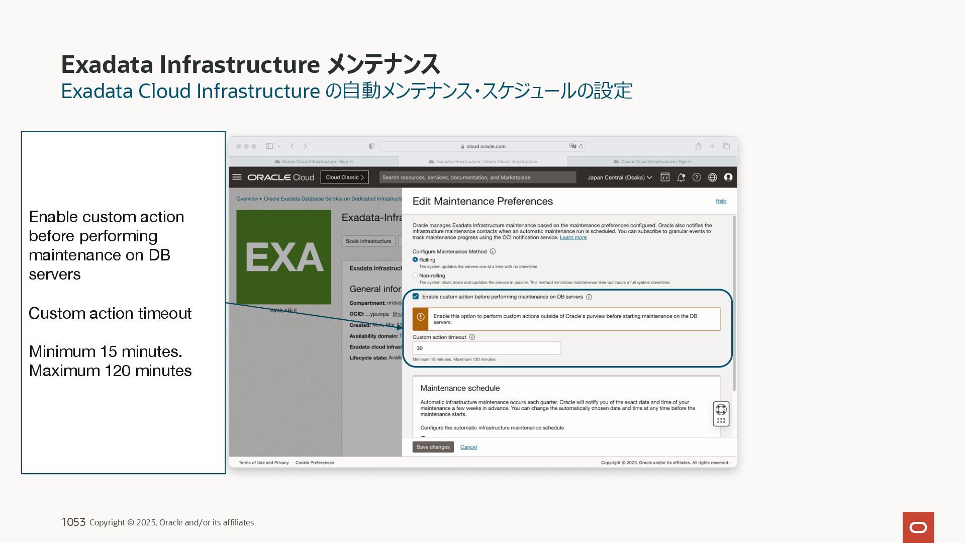 2025-04-03T01:31:51.131744+00:00 SQL> ALTER DISKGROUP DATAC2 DROP DISK 'DATAC2_CD_00_kix101117exdcl10', 'DATAC2_CD_01_kix101117exdcl10', 'DATAC2_CD_02_kix101117exdcl10', 'DATAC2_CD_03_kix101117exdcl10', 'DATAC2_CD_04_kix101117exdcl10', 'DATAC2_CD_05_kix101117exdcl10', 'DATAC2_CD_06_kix101117exdcl10', 'DATAC2_CD_07_kix101117exdcl10', 'DATAC2_CD_08_kix101117exdcl10', 'DATAC2_CD_09_kix101117exdcl10', 'DATAC2_CD_10_kix101117exdcl10', 'DATAC2_CD_11_kix101117exdcl10' REBALANCE POWER 4 略 SUCCESS: ALTER DISKGROUP RECOC2 DROP DISK 'RECOC2_CD_00_kix101117exdcl10', 'RECOC2_CD_01_kix101117exdcl10', 'RECOC2_CD_02_kix101117exdcl10', 'RECOC2_CD_03_kix101117exdcl10', 'RECOC2_CD_04_kix101117exdcl10', 'RECOC2_CD_05_kix101117exdcl10', 'RECOC2_CD_06_kix101117exdcl10', 'RECOC2_CD_07_kix101117exdcl10', 'RECOC2_CD_08_kix101117exdcl10', 'RECOC2_CD_09_kix101117exdcl10', 'RECOC2_CD_10_kix101117exdcl10', 'RECOC2_CD_11_kix101117exdcl10' REBALANCE POWER 4 NOTE: Attempting voting file refresh on diskgroup RECOC2 NOTE: Refresh completed on diskgroup RECOC2. No voting file found. 2025-04-03T01:32:19.466977+00:00 Exadata Infrastructure Copyright © 2025, Oracle and/or its affiliates 132 ※2025年4⽉更新