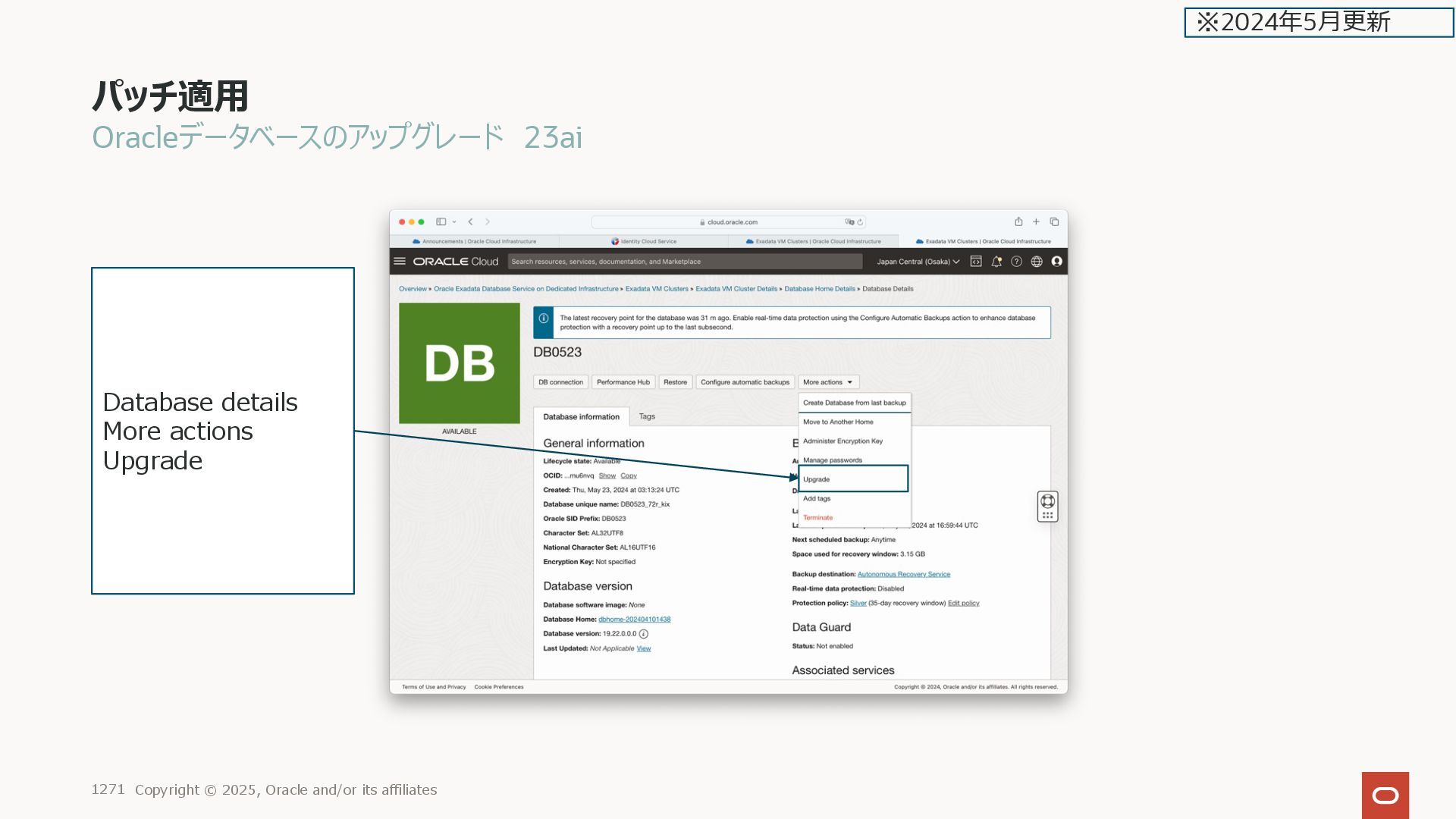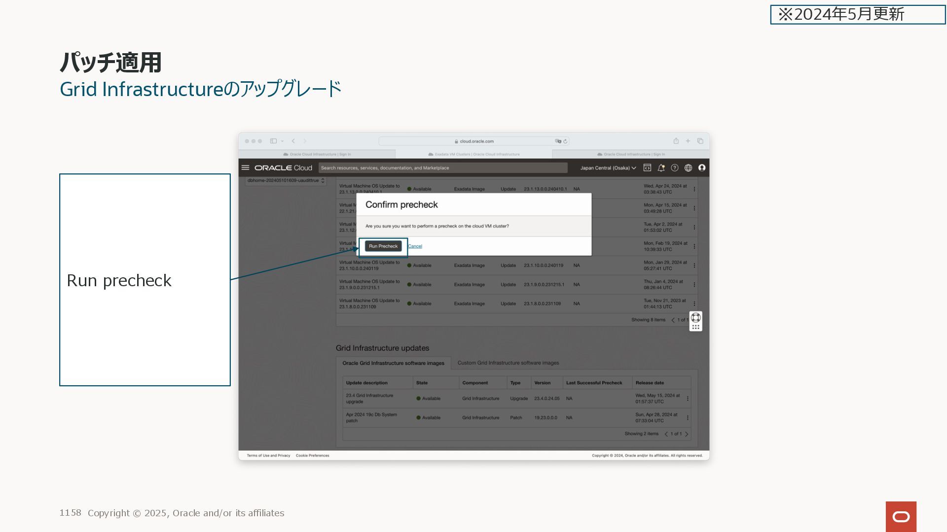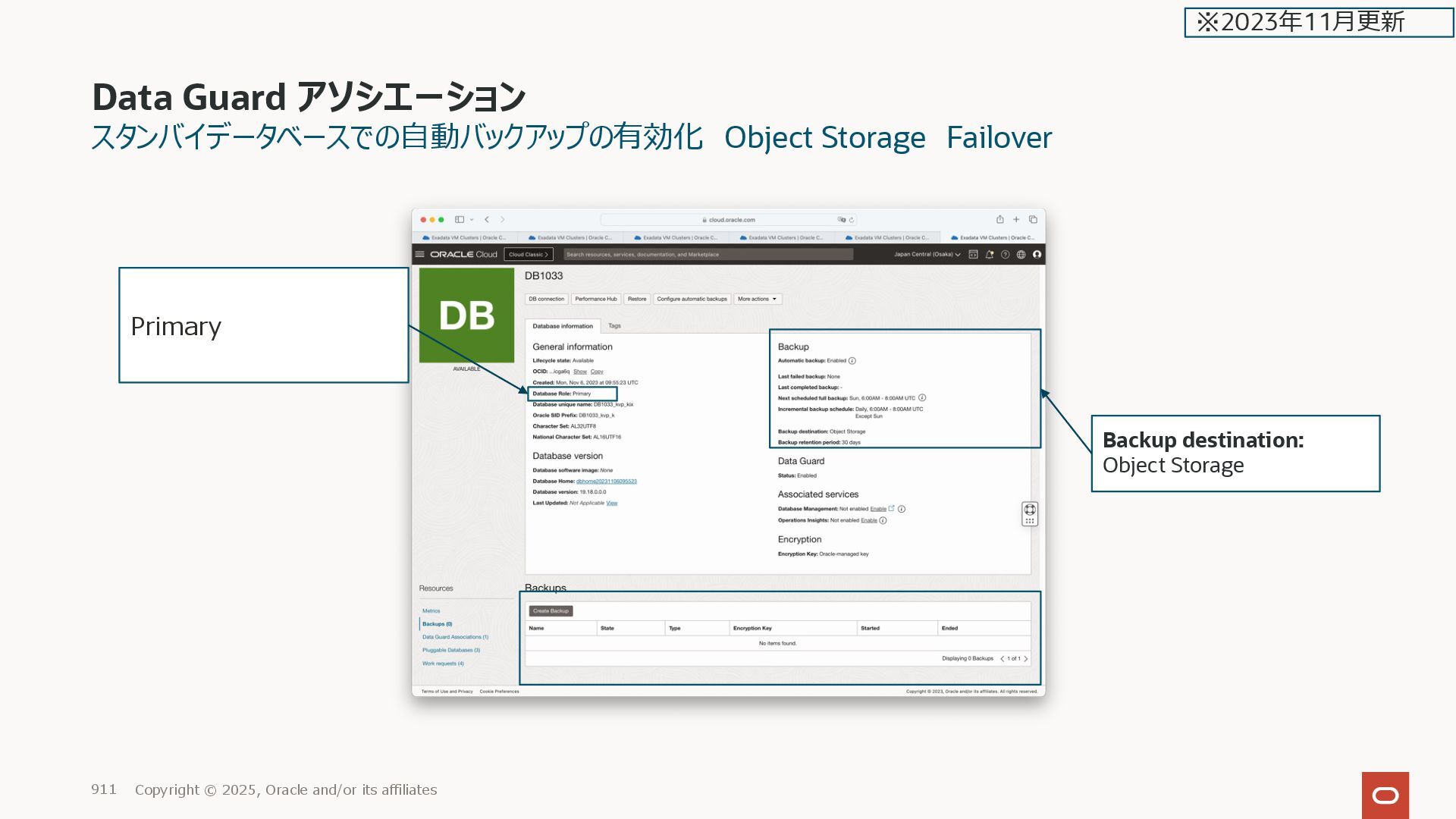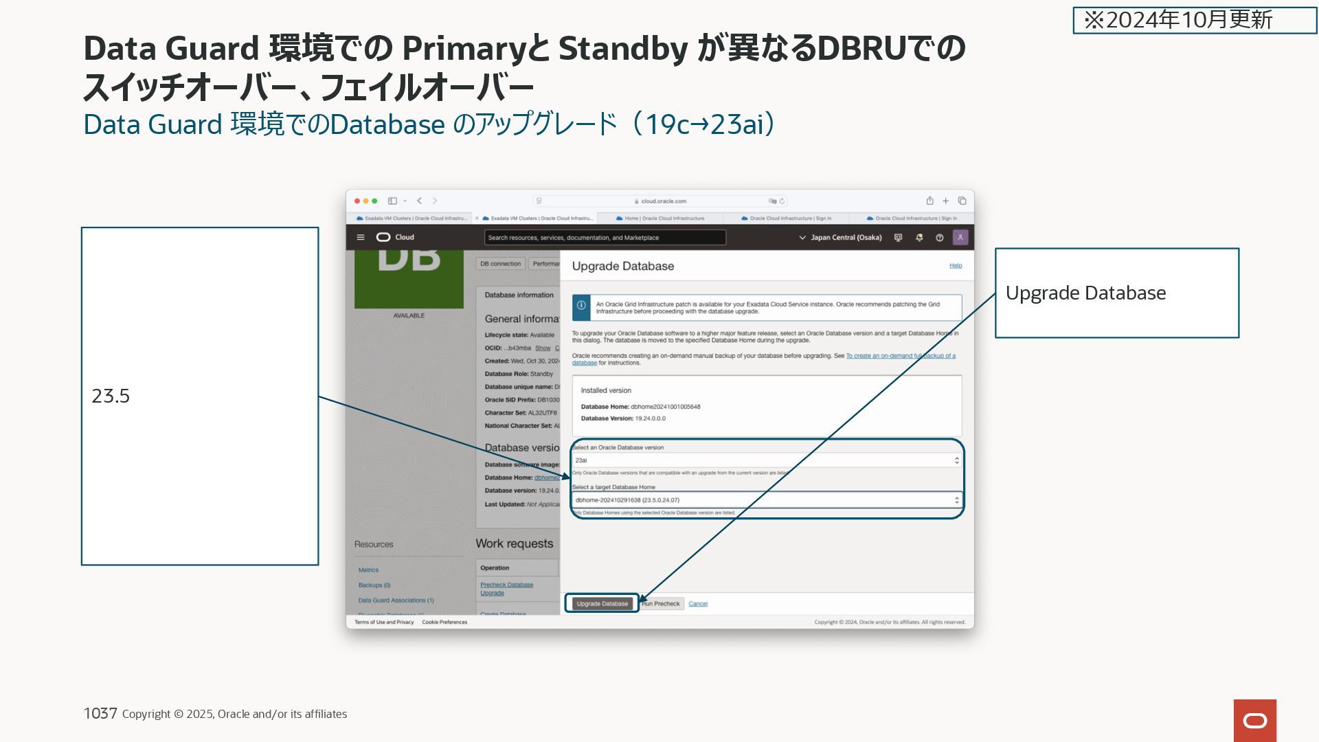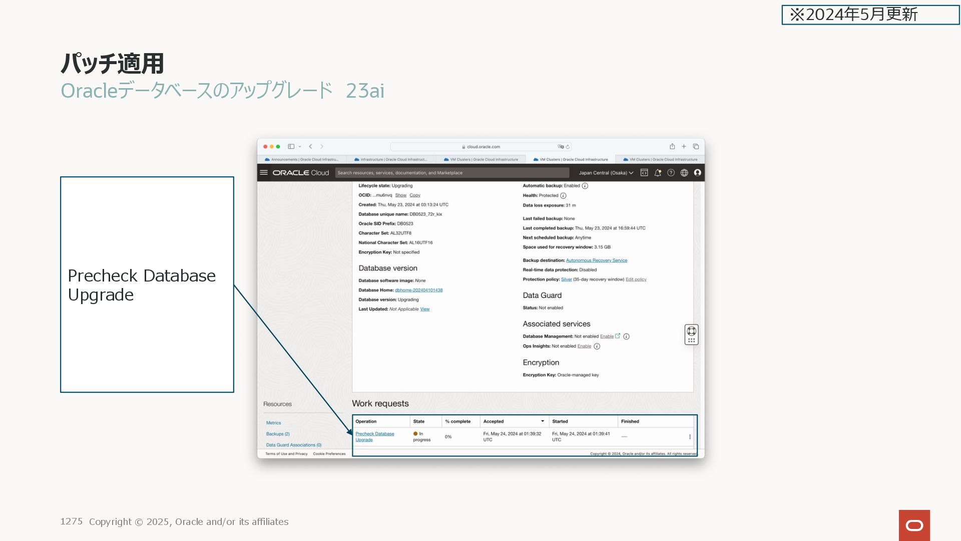 2025-04-03T01:31:51.131744+00:00 SQL> ALTER DISKGROUP DATAC2 DROP DISK 'DATAC2_CD_00_kix101117exdcl10', 'DATAC2_CD_01_kix101117exdcl10', 'DATAC2_CD_02_kix101117exdcl10', 'DATAC2_CD_03_kix101117exdcl10', 'DATAC2_CD_04_kix101117exdcl10', 'DATAC2_CD_05_kix101117exdcl10', 'DATAC2_CD_06_kix101117exdcl10', 'DATAC2_CD_07_kix101117exdcl10', 'DATAC2_CD_08_kix101117exdcl10', 'DATAC2_CD_09_kix101117exdcl10', 'DATAC2_CD_10_kix101117exdcl10', 'DATAC2_CD_11_kix101117exdcl10' REBALANCE POWER 4 略 SUCCESS: ALTER DISKGROUP RECOC2 DROP DISK 'RECOC2_CD_00_kix101117exdcl10', 'RECOC2_CD_01_kix101117exdcl10', 'RECOC2_CD_02_kix101117exdcl10', 'RECOC2_CD_03_kix101117exdcl10', 'RECOC2_CD_04_kix101117exdcl10', 'RECOC2_CD_05_kix101117exdcl10', 'RECOC2_CD_06_kix101117exdcl10', 'RECOC2_CD_07_kix101117exdcl10', 'RECOC2_CD_08_kix101117exdcl10', 'RECOC2_CD_09_kix101117exdcl10', 'RECOC2_CD_10_kix101117exdcl10', 'RECOC2_CD_11_kix101117exdcl10' REBALANCE POWER 4 NOTE: Attempting voting file refresh on diskgroup RECOC2 NOTE: Refresh completed on diskgroup RECOC2. No voting file found. 2025-04-03T01:32:19.466977+00:00 Exadata Infrastructure Copyright © 2025, Oracle and/or its affiliates 132 ※2025年4⽉更新