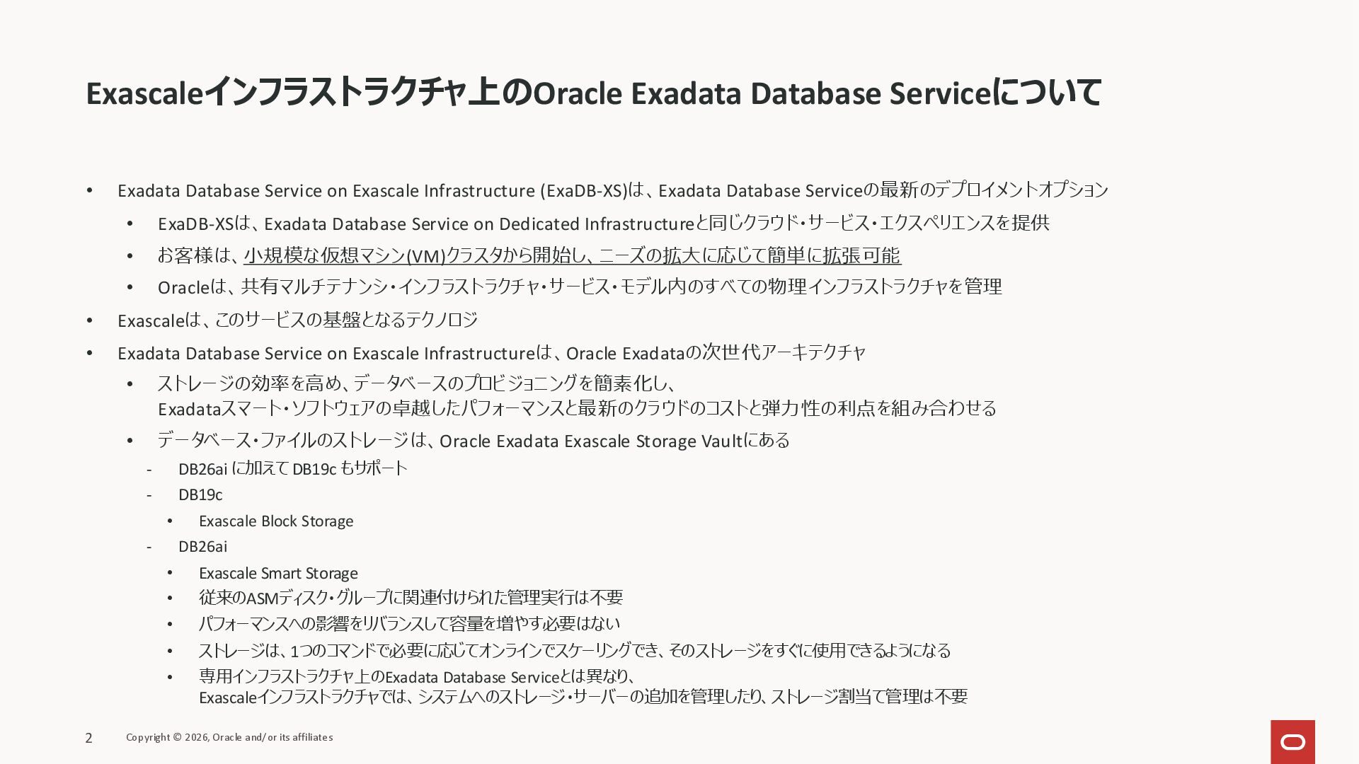 • ExaDB-XSは、Exadata Database Service on Dedicated Infrastructureと同じクラウド・サービス・エクスペリエンスを提供 • お客様は、小規模な仮想マシン(VM)クラスタから開始し、ニーズの拡大に応じて簡単に拡張可能 • Oracleは、共有マルチテナンシ・インフラストラクチャ・サービス・モデル内のすべての物理インフラストラクチャを管理 • Exascaleは、このサービスの基盤となるテクノロジ • Exadata Database Service on Exascale Infrastructureは、Oracle Exadataの次世代アーキテクチャ • ストレージの効率を高め、データベースのプロビジョニングを簡素化し、 Exadataスマート・ソフトウェアの卓越したパフォーマンスと最新のクラウドのコストと弾力性の利点を組み合わせる • データベース・ファイルのストレージは、Oracle Exadata Exascale Storage Vaultにある - DB26ai に加えて DB19c もサポート - DB19c • Exascale Block Storage - DB26ai • Exascale Smart Storage • 従来のASMディスク・グループに関連付けられた管理実行は不要 • パフォーマンスへの影響をリバランスして容量を増やす必要はない • ストレージは、1つのコマンドで必要に応じてオンラインでスケーリングでき、そのストレージをすぐに使用できるようになる • 専用インフラストラクチャ上のExadata Database Serviceとは異なり、 Exascaleインフラストラクチャでは、システムへのストレージ・サーバーの追加を管理したり、ストレージ割当て管理は不要 Exascaleインフラストラクチャ上のOracle Exadata Database Serviceについて Copyright © 2026, Oracle and/or its affiliates 2