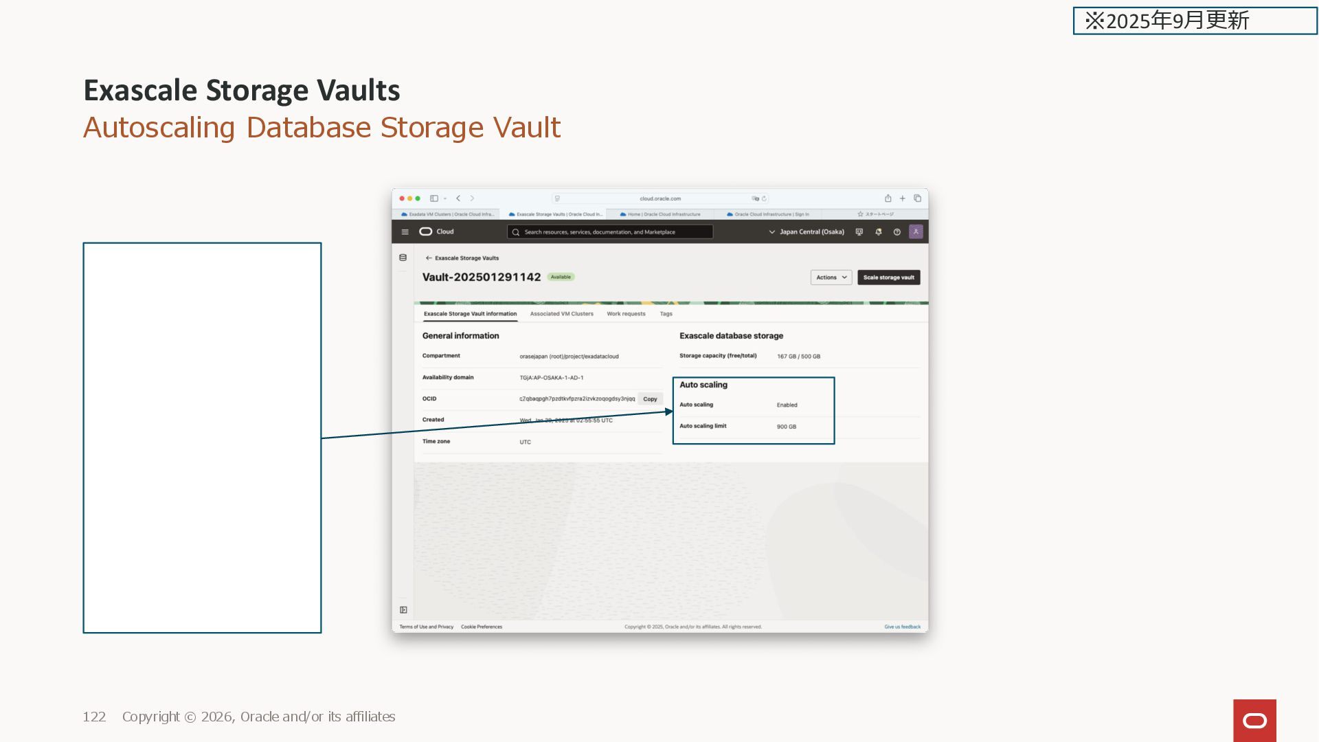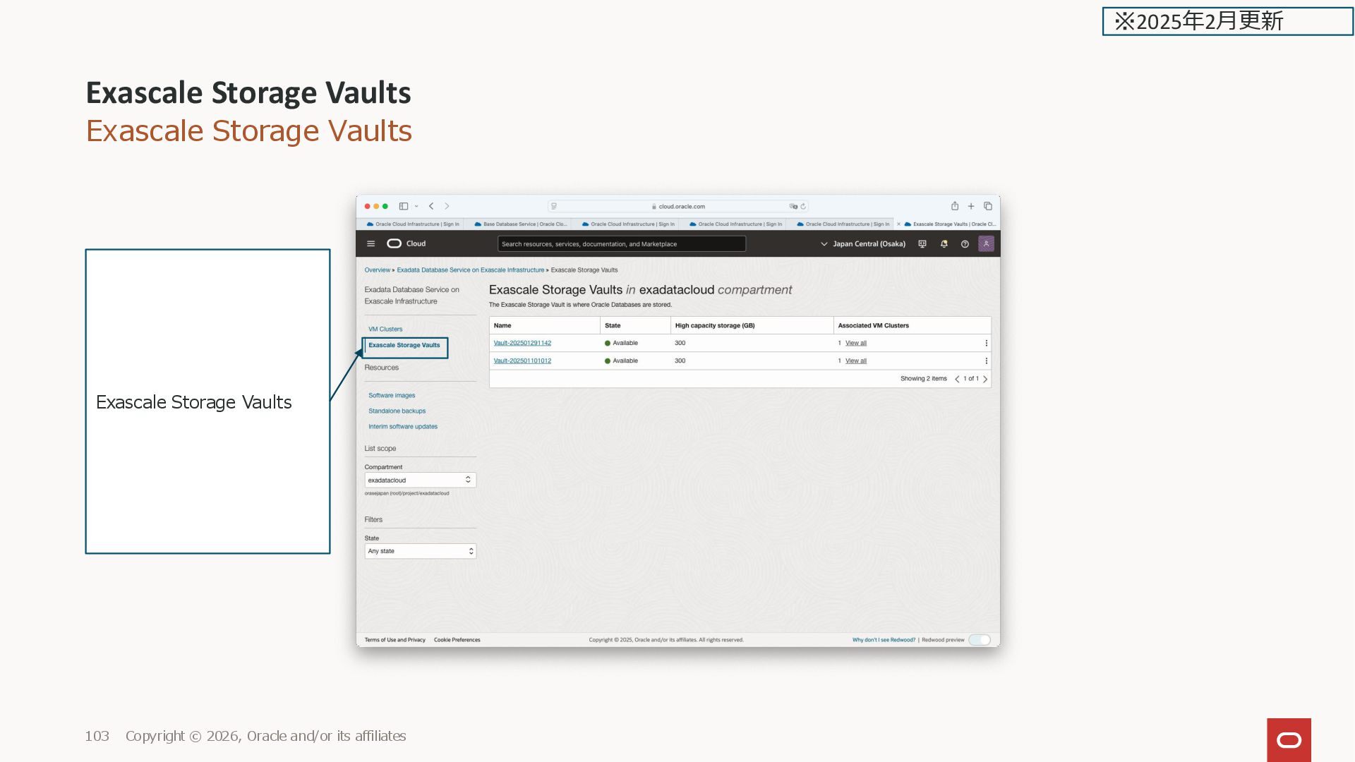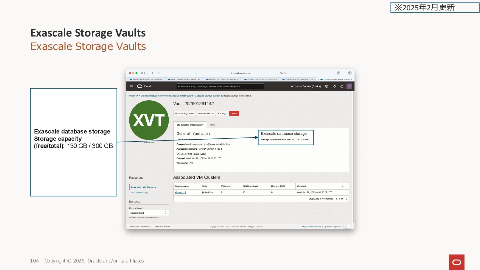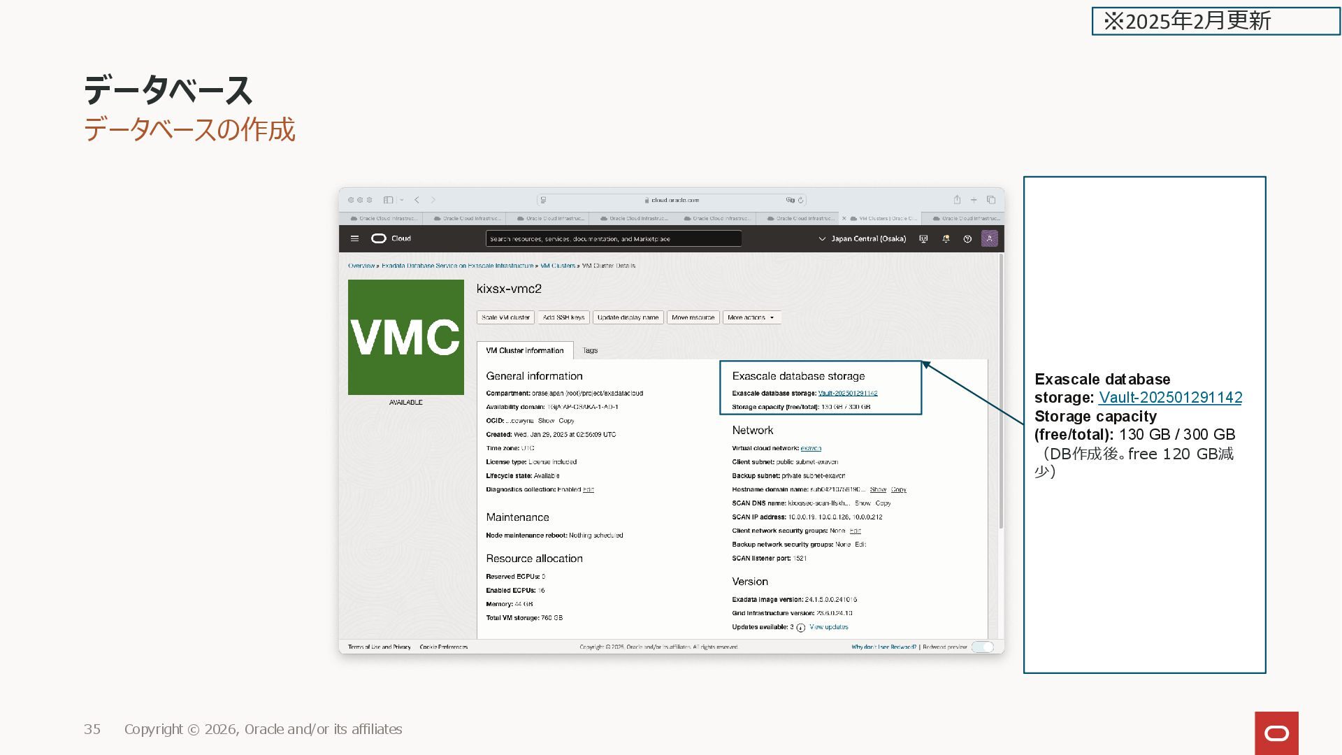 ※2025年2月更新 Exascale database storage: Vault-202501291142 Storage capacity (free/total): 130 GB / 300 GB (DB作成後。free 120 GB減 少)