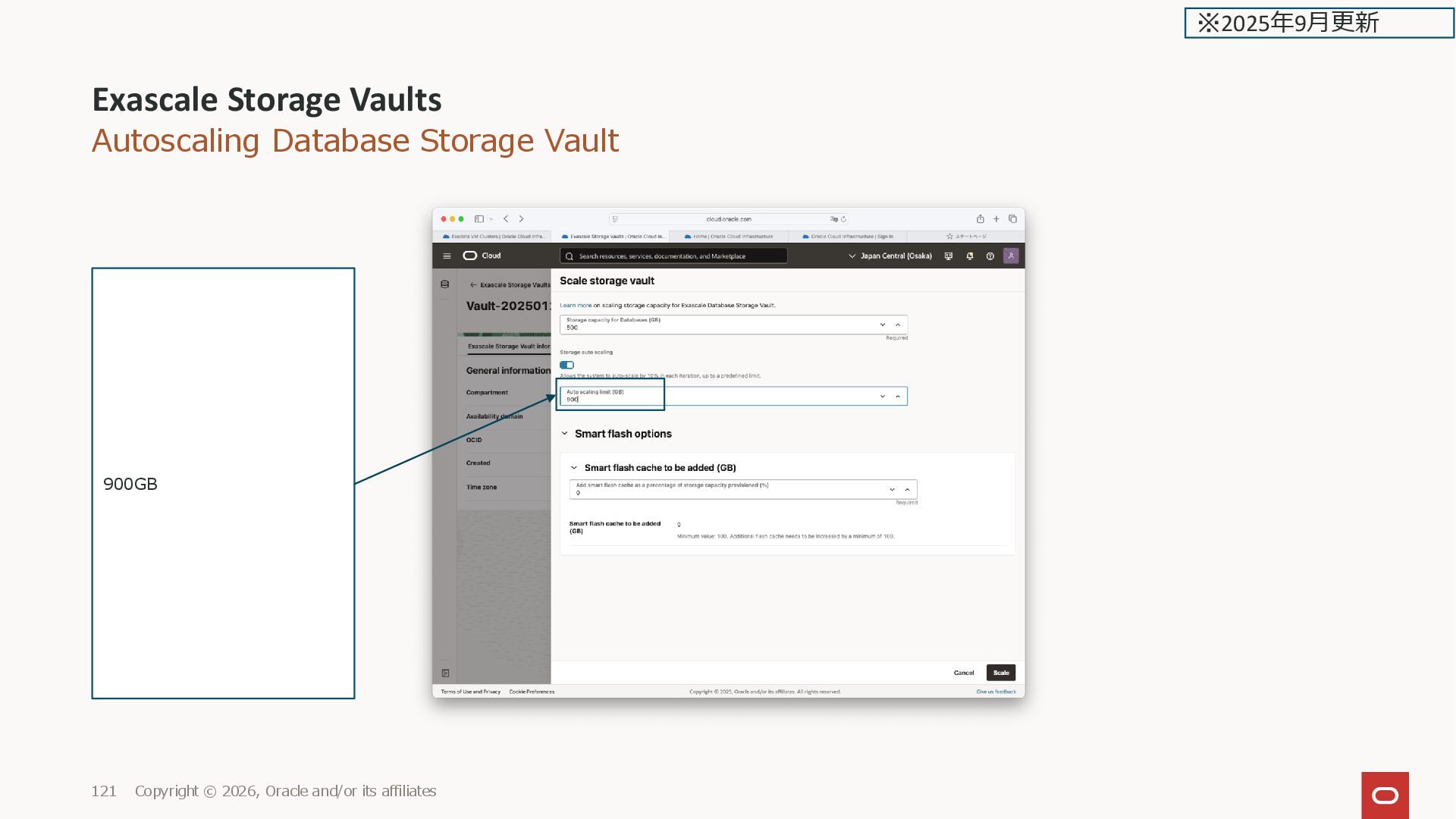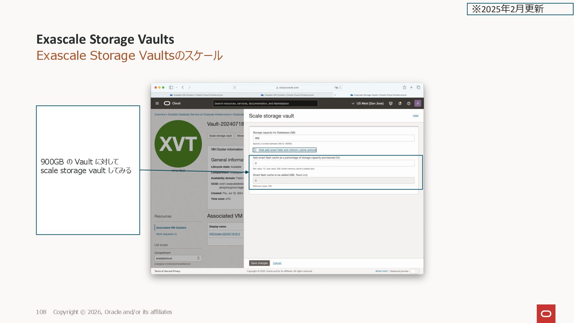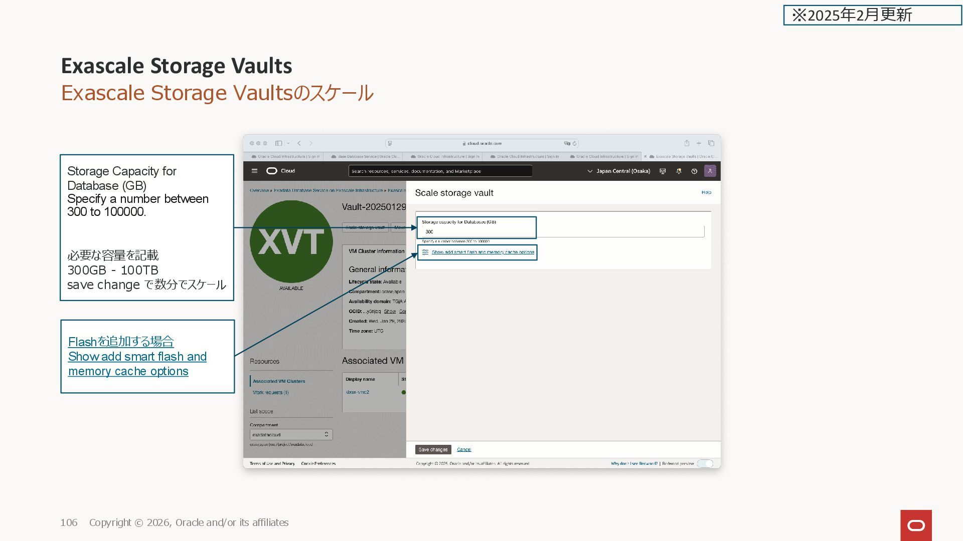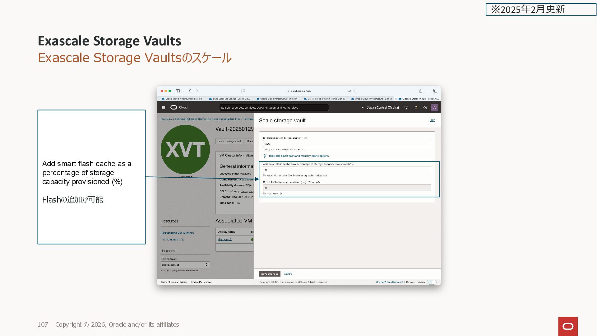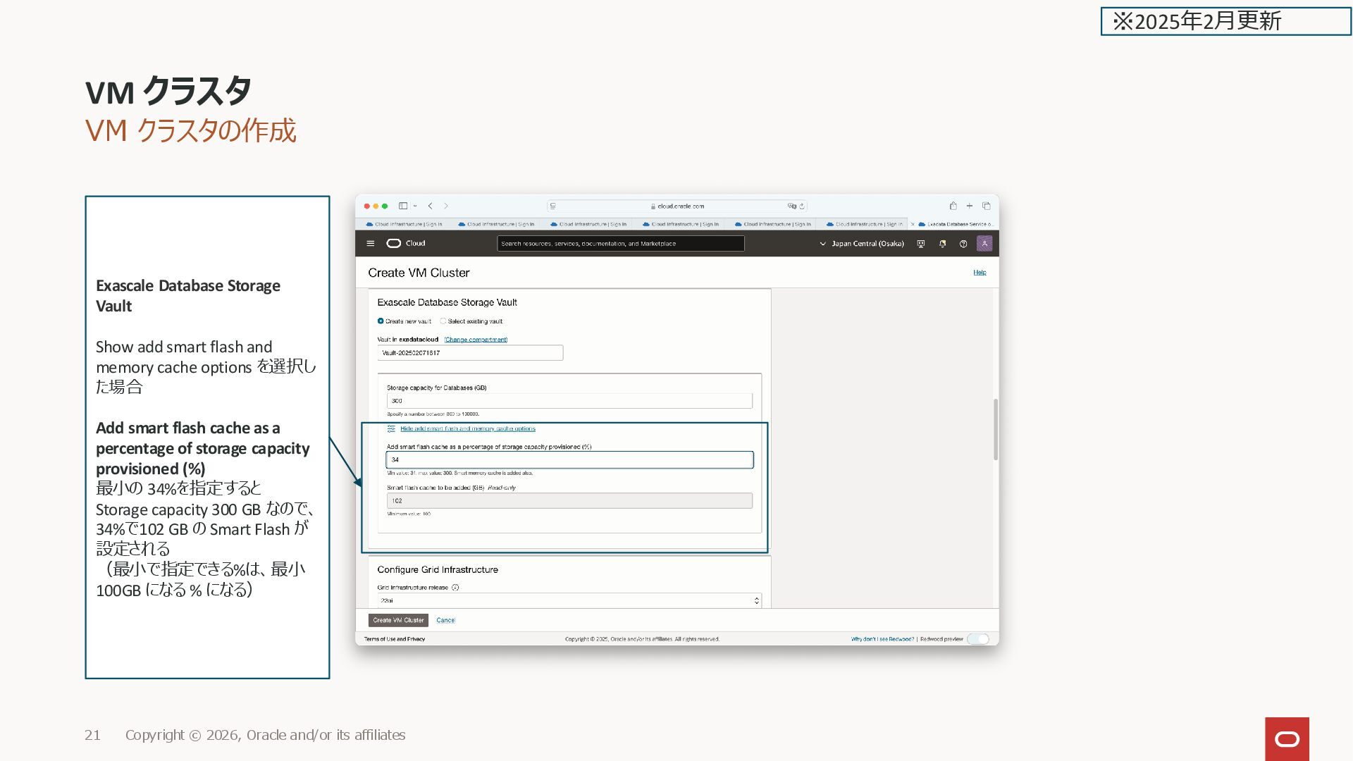 affiliates 21 ※2025年2月更新 Exascale Database Storage Vault Show add smart flash and memory cache options を選択し た場合 Add smart flash cache as a percentage of storage capacity provisioned (%) 最小の 34%を指定すると Storage capacity 300 GB なので、 34%で102 GB の Smart Flash が 設定される (最小で指定できる%は、最小 100GB になる % になる)