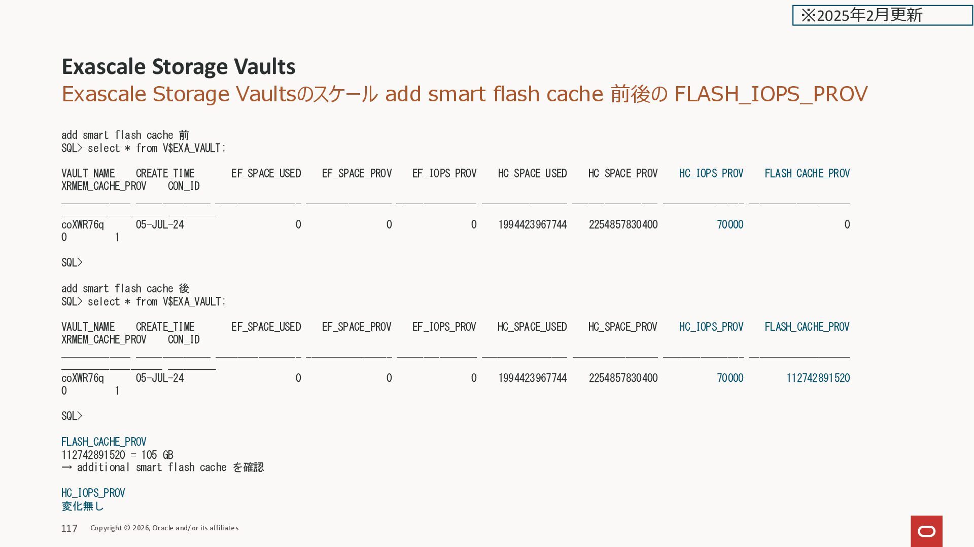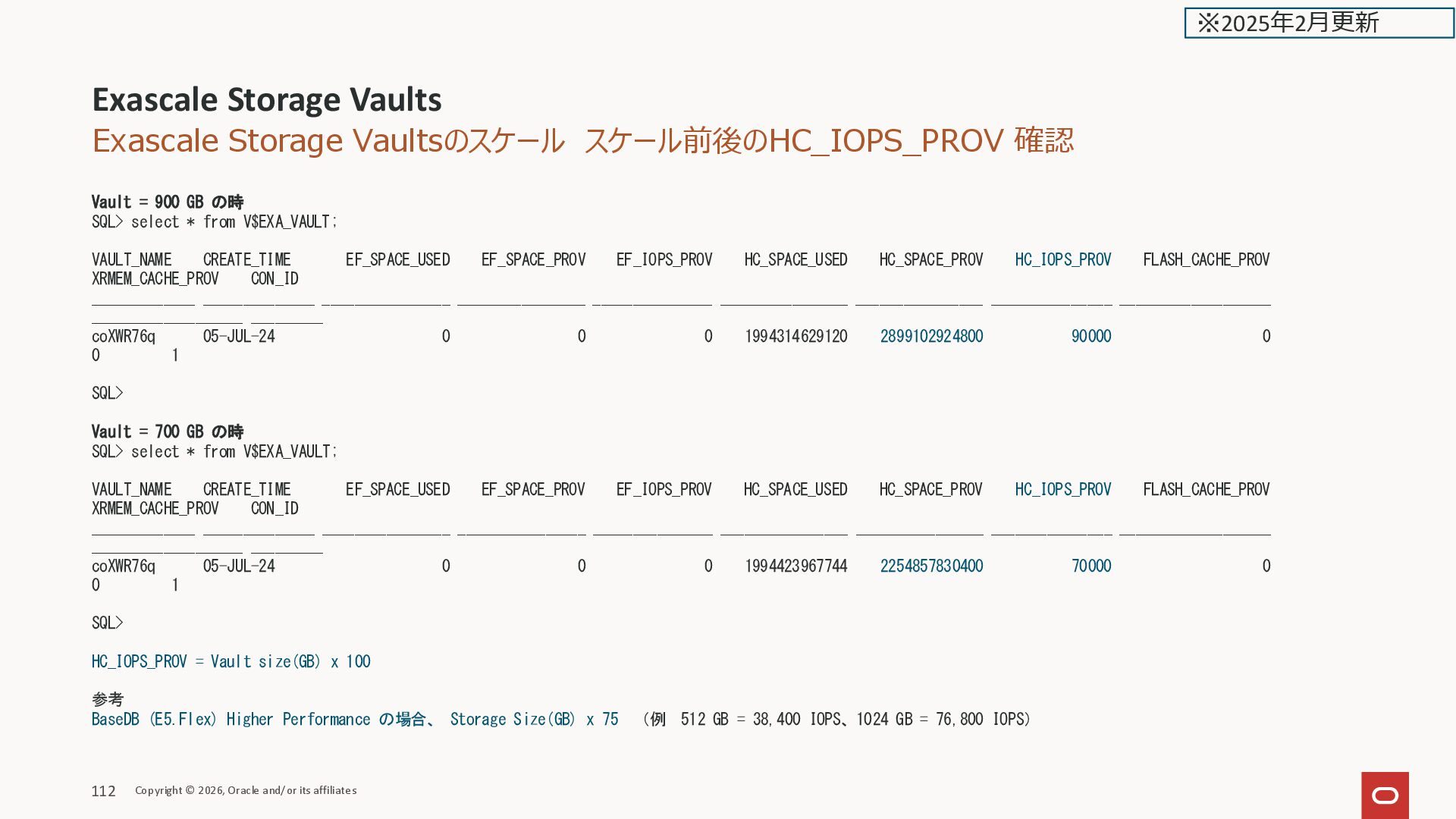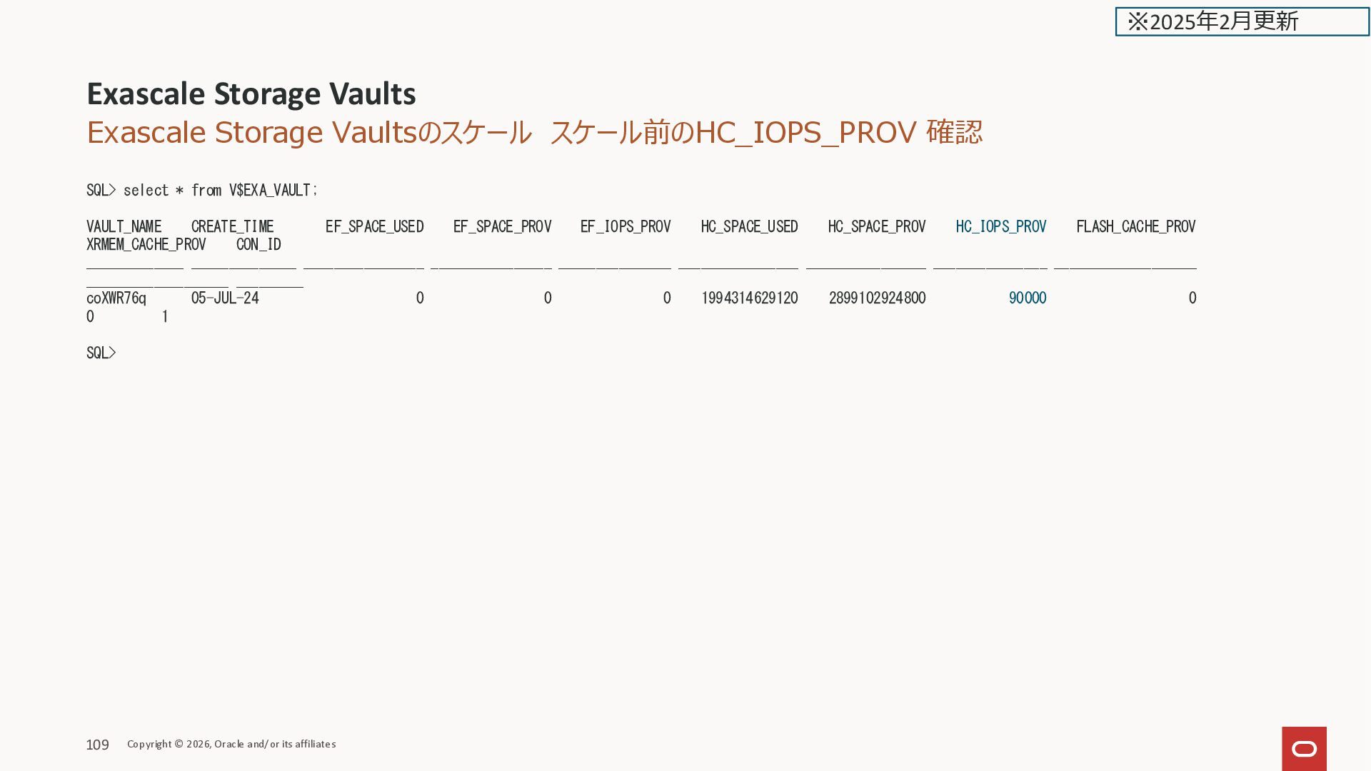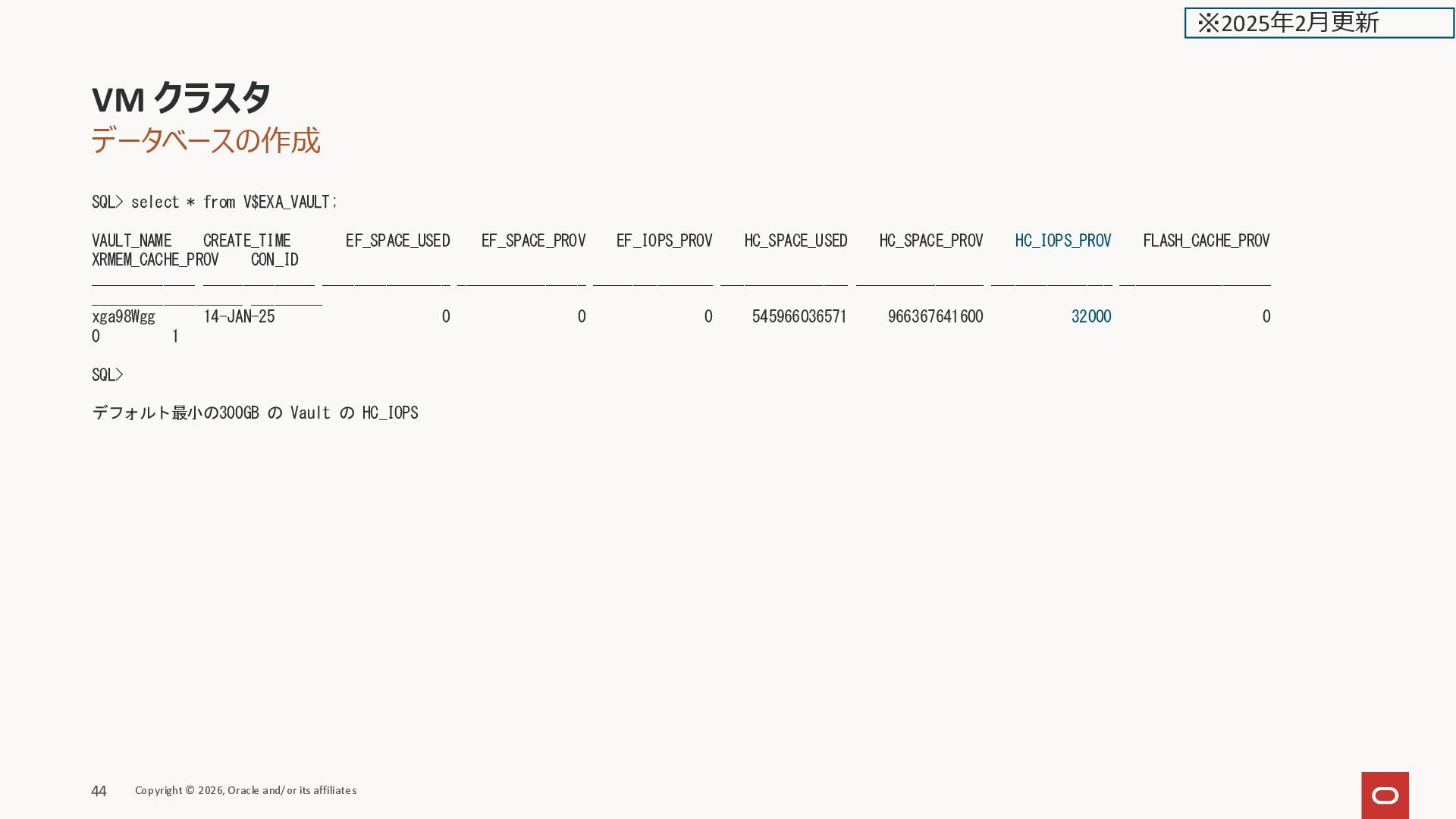 EF_IOPS_PROV HC_SPACE_USED HC_SPACE_PROV HC_IOPS_PROV FLASH_CACHE_PROV XRMEM_CACHE_PROV CON_ID _____________ ______________ ________________ ________________ _______________ ________________ ________________ _______________ ___________________ ___________________ _________ xga98Wgg 14-JAN-25 0 0 0 545966036571 966367641600 32000 0 0 1 SQL> デフォルト最小の300GB の Vault の HC_IOPS VM クラスタ Copyright © 2026, Oracle and/or its affiliates 44 ※2025年2月更新