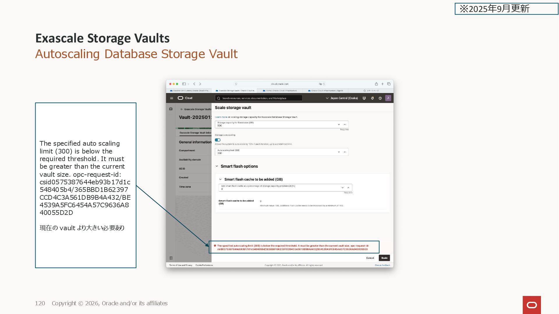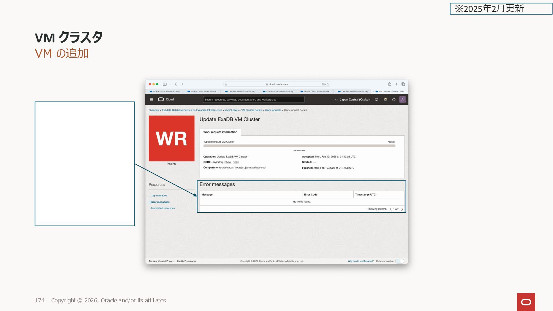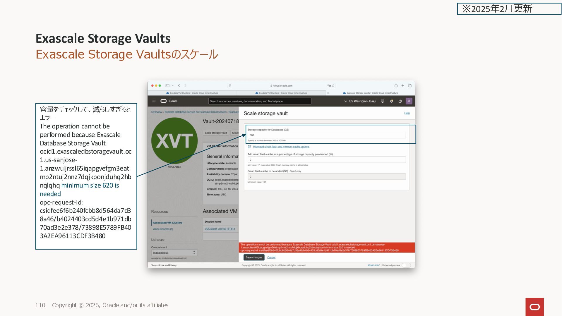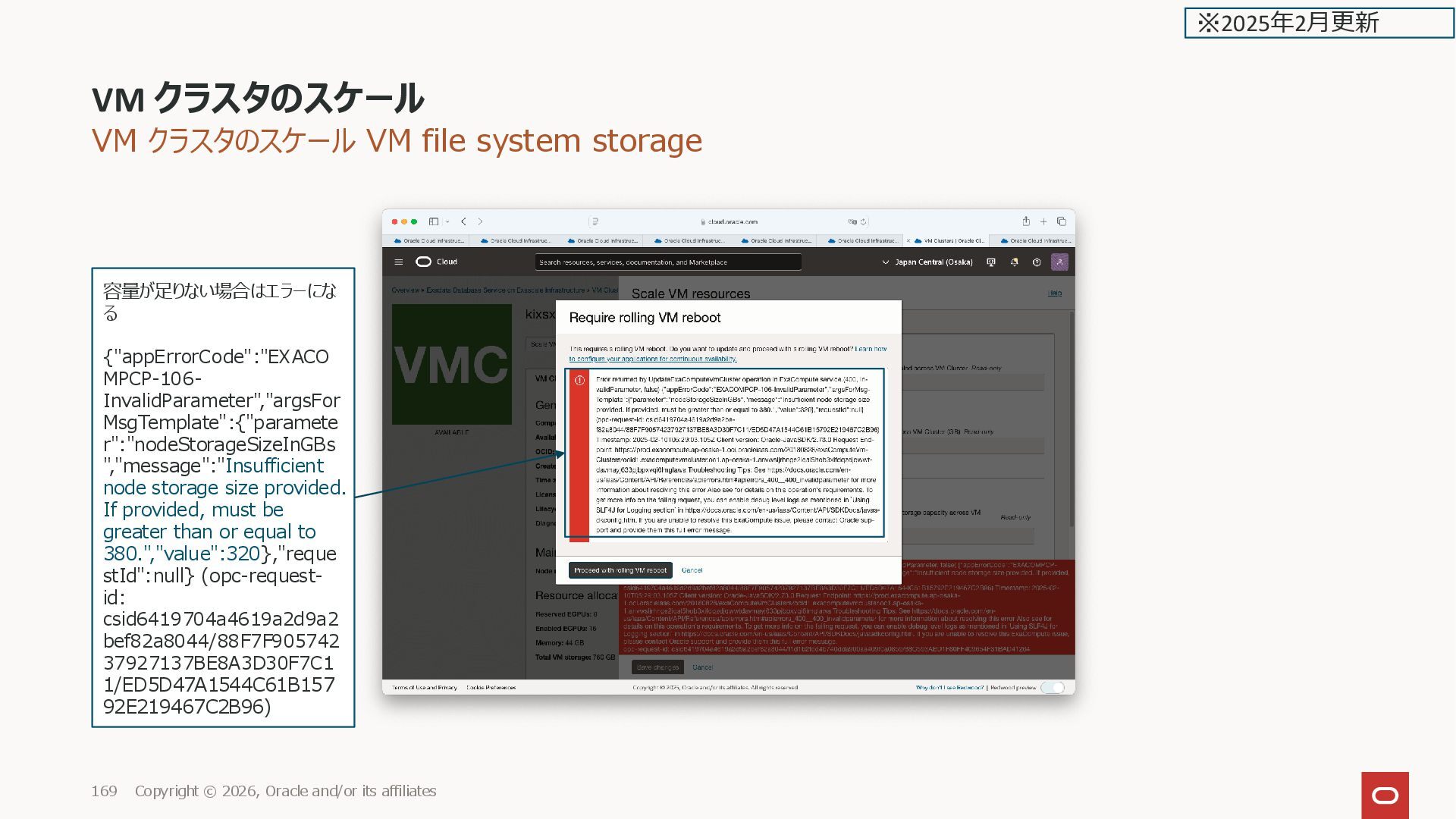 2026, Oracle and/or its affiliates 169 容量が足りない場合はエラーにな る {"appErrorCode":"EXACO MPCP-106- InvalidParameter","argsFor MsgTemplate":{"paramete r":"nodeStorageSizeInGBs ","message":"Insufficient node storage size provided. If provided, must be greater than or equal to 380.","value":320},"reque stId":null} (opc-request- id: csid6419704a4619a2d9a2 bef82a8044/88F7F905742 37927137BE8A3D30F7C1 1/ED5D47A1544C61B157 92E219467C2B96) ※2025年2月更新