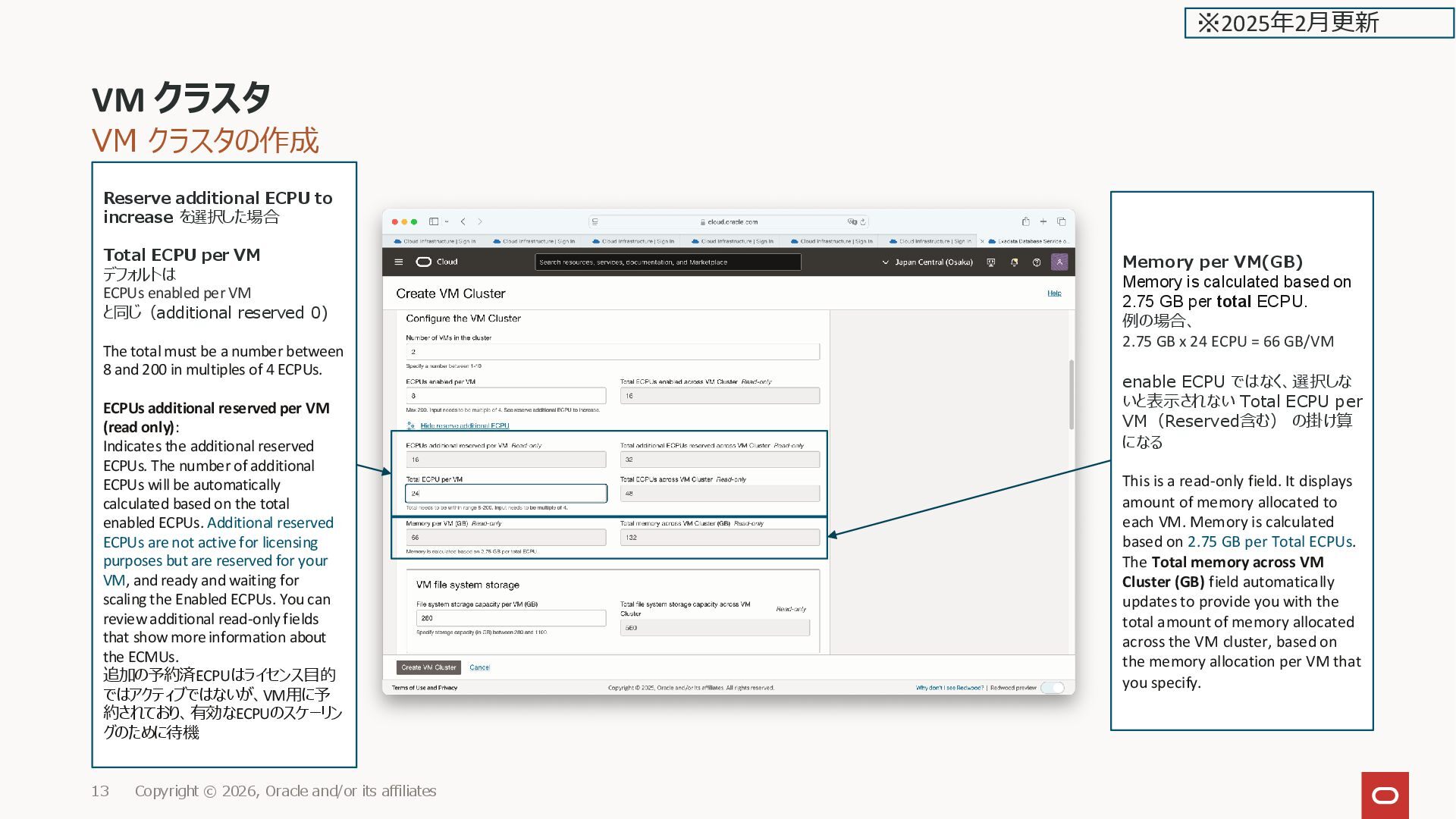 affiliates 12 Configure the VM Cluster Number of VMs in the cluster 1〜10 (物理ノード数、最大10ノードクラ スタ) ECPUs enabled per VM VMごとの ECPU数 The minimum ECPUs is 8. The maximum number of ECPUs is 200 per VM, or limited by the number of total ECPUs you have specified for the VM. The value you select must be a multiple of 4. You can open the reserve additional ECPU section to reserve additional ECPUs. 最小8ECPU、最大200ECPU、 4の倍数(1OCPU = 4 ECPUの ため)(OCPU でいうと2OCPU〜 50OCPU 構成) Reserve additional ECPU to increase を選択した場合は次 ページ ※2025年2月更新