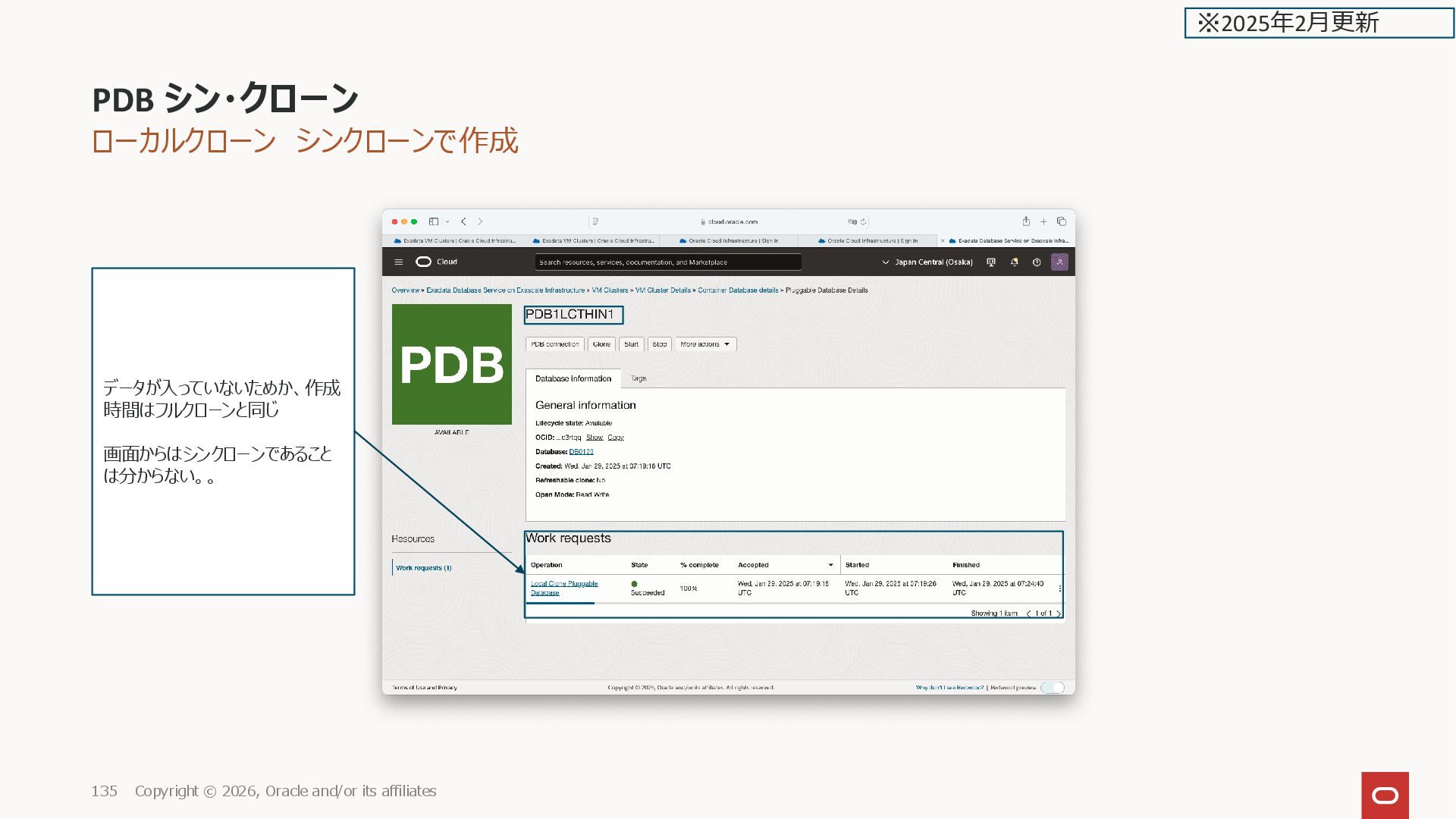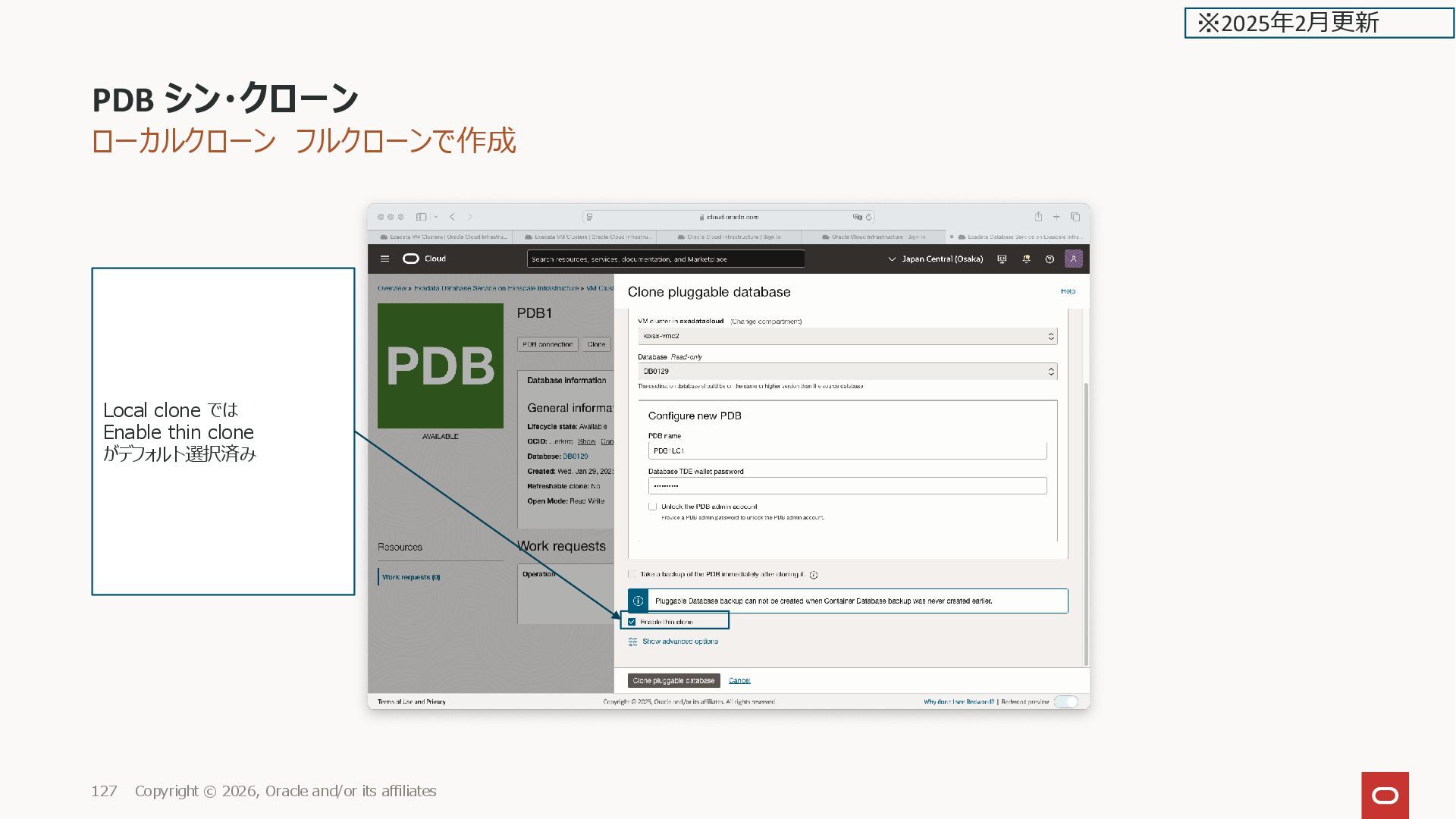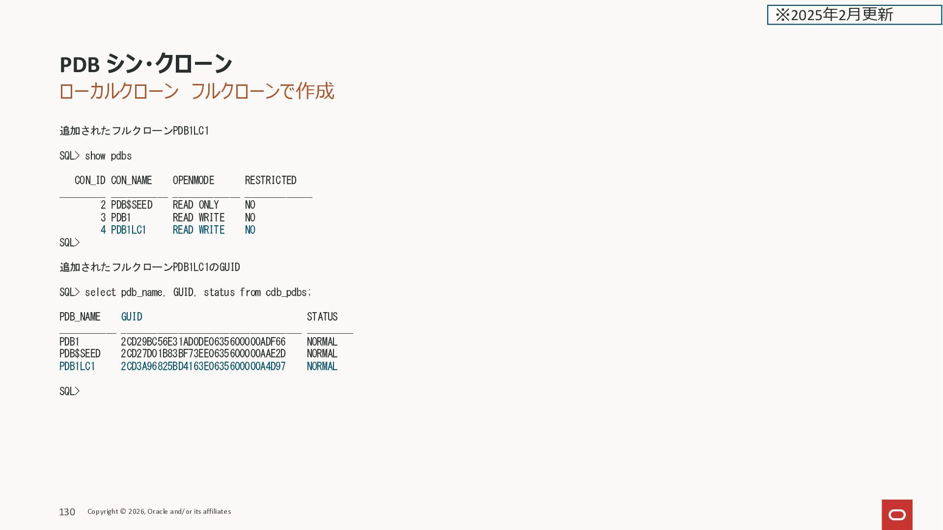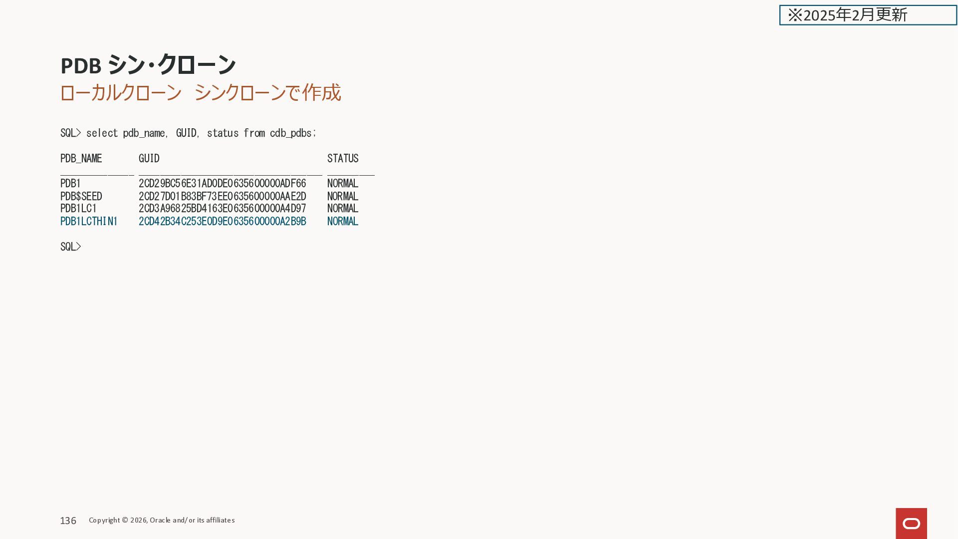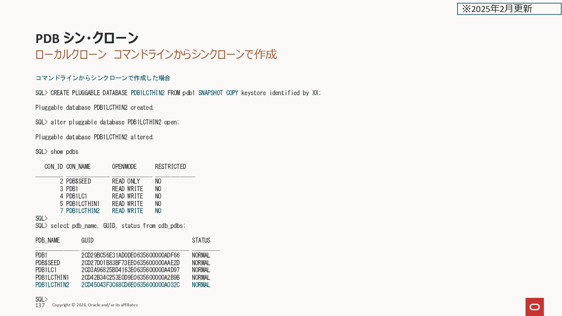 GUID STATUS ______________ ___________________________________ _________ PDB1 2CD29BC56E31AD0DE0635600000ADF66 NORMAL PDB$SEED 2CD27D01B83BF73EE0635600000AAE2D NORMAL PDB1LC1 2CD3A96825BD4163E0635600000A4D97 NORMAL PDB1LCTHIN1 2CD42B34C253E0D9E0635600000A2B9B NORMAL SQL> PDB シン・クローン Copyright © 2026, Oracle and/or its affiliates 136 ※2025年2月更新
