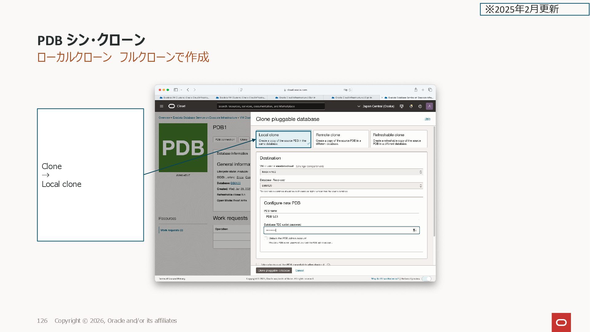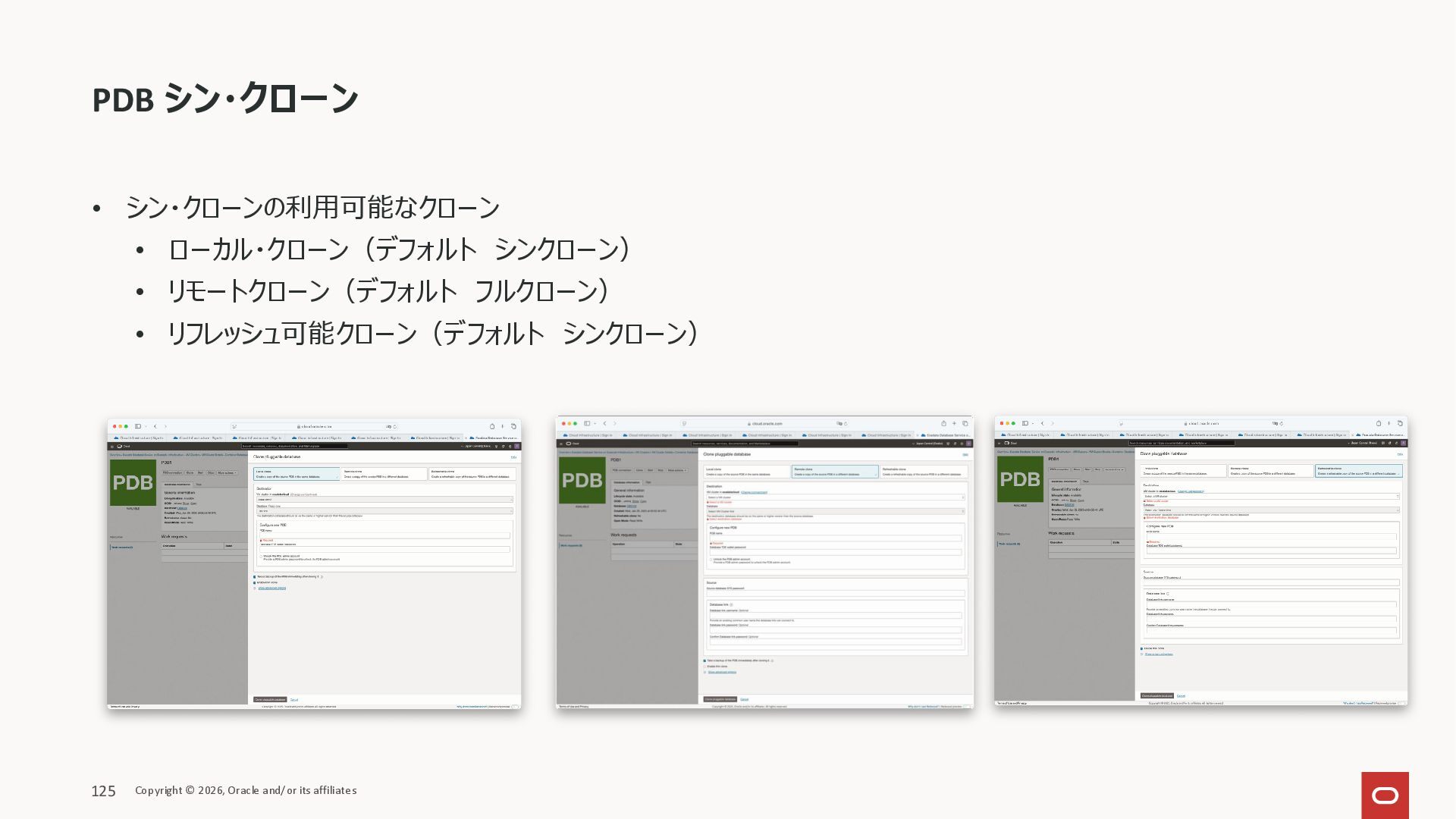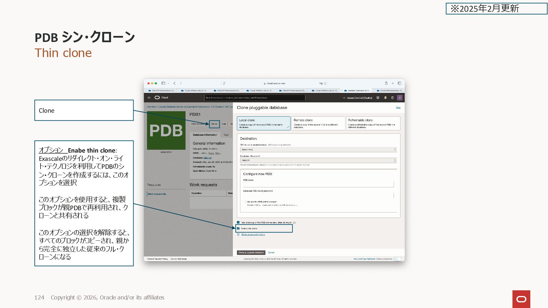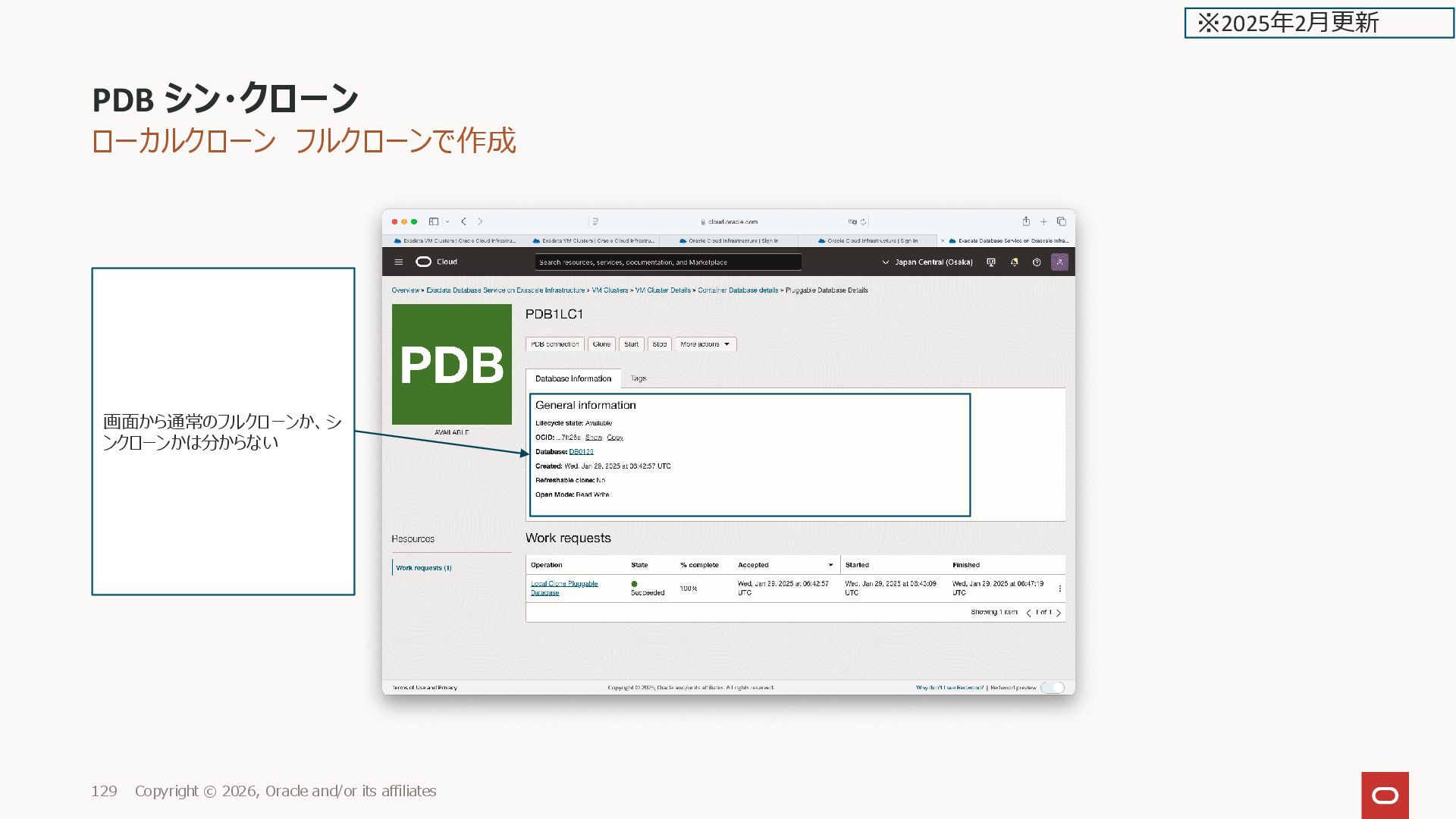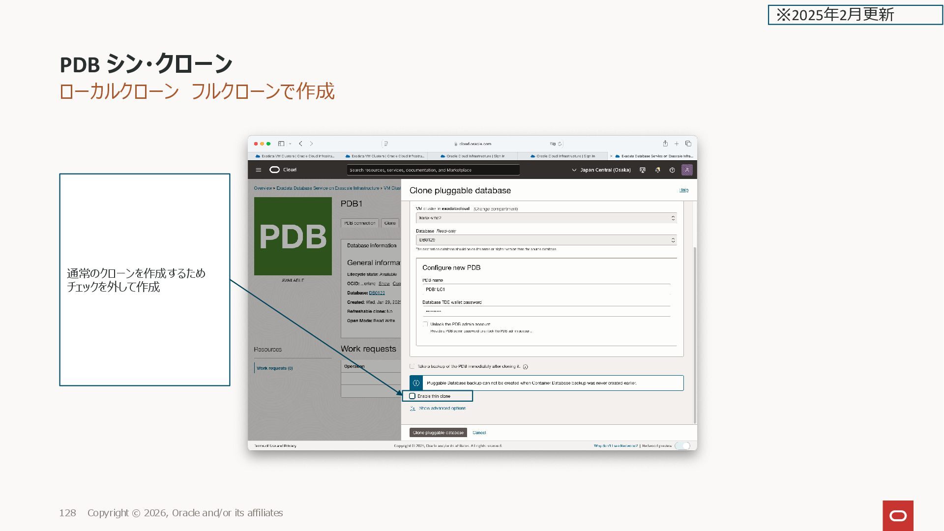 GUID STATUS ______________ ___________________________________ _________ PDB1 2CD29BC56E31AD0DE0635600000ADF66 NORMAL PDB$SEED 2CD27D01B83BF73EE0635600000AAE2D NORMAL PDB1LC1 2CD3A96825BD4163E0635600000A4D97 NORMAL PDB1LCTHIN1 2CD42B34C253E0D9E0635600000A2B9B NORMAL SQL> PDB シン・クローン Copyright © 2026, Oracle and/or its affiliates 136 ※2025年2月更新