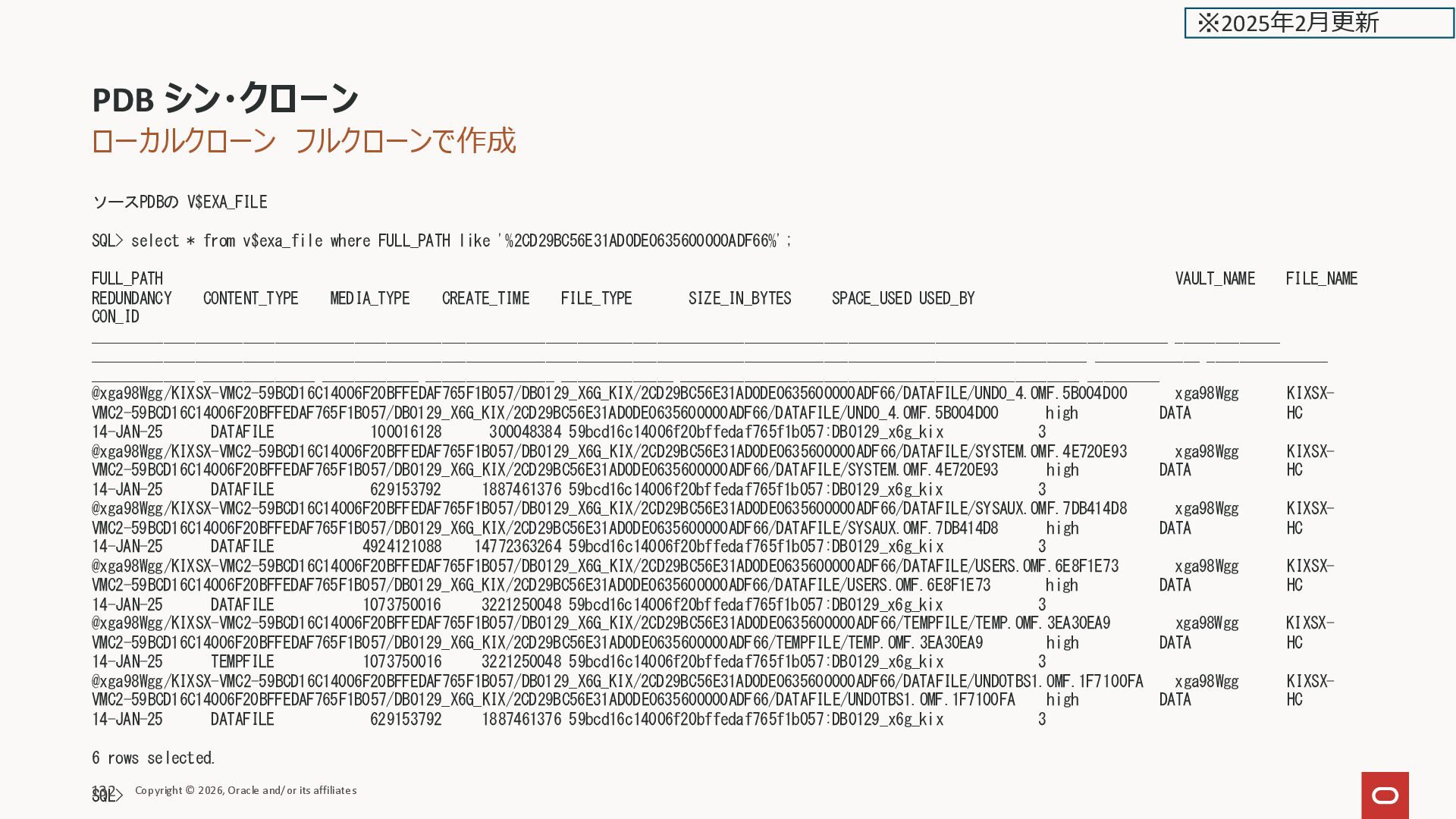 like '%2CD45043F3C68CD6E0635600000A032C%'; FULL_PATH VAULT_NAME FILE_NAME REDUNDANCY CONTENT_TYPE MEDIA_TYPE CREATE_TIME FILE_TYPE SIZE_IN_BYTES SPACE_USED USED_BY CON_ID _______________________________________________________________________________________________________________________________________ _____________ _____________________________________________________________________________________________________________________________ _____________ _______________ _____________ ______________ ____________ ________________ _____________ __________________________________________________ _________ @xga98Wgg/KIXSX-VMC2-59BCD16C14006F20BFFEDAF765F1B057/DB0129_X6G_KIX/2CD45043F3C68CD6E0635600000A032C/DATAFILE/SYSTEM.OMF.4E720E93 xga98Wgg KIXSX- VMC2-59BCD16C14006F20BFFEDAF765F1B057/DB0129_X6G_KIX/2CD45043F3C68CD6E0635600000A032C/DATAFILE/SYSTEM.OMF.4E720E93 high DATA HC 14-JAN-25 DATAFILE 629153792 188967321 59bcd16c14006f20bffedaf765f1b057:DB0129_x6g_kix 7 @xga98Wgg/KIXSX-VMC2-59BCD16C14006F20BFFEDAF765F1B057/DB0129_X6G_KIX/2CD45043F3C68CD6E0635600000A032C/DATAFILE/UNDOTBS1.OMF.1F7100FA xga98Wgg KIXSX- VMC2-59BCD16C14006F20BFFEDAF765F1B057/DB0129_X6G_KIX/2CD45043F3C68CD6E0635600000A032C/DATAFILE/UNDOTBS1.OMF.1F7100FA high DATA HC 14-JAN-25 DATAFILE 629153792 188783001 59bcd16c14006f20bffedaf765f1b057:DB0129_x6g_kix 7 @xga98Wgg/KIXSX-VMC2-59BCD16C14006F20BFFEDAF765F1B057/DB0129_X6G_KIX/2CD45043F3C68CD6E0635600000A032C/TEMPFILE/TEMP.OMF.729802AD xga98Wgg KIXSX- VMC2-59BCD16C14006F20BFFEDAF765F1B057/DB0129_X6G_KIX/2CD45043F3C68CD6E0635600000A032C/TEMPFILE/TEMP.OMF.729802AD high DATA HC 14-JAN-25 TEMPFILE 1073750016 3221250048 59bcd16c14006f20bffedaf765f1b057:DB0129_x6g_kix 7 @xga98Wgg/KIXSX-VMC2-59BCD16C14006F20BFFEDAF765F1B057/DB0129_X6G_KIX/2CD45043F3C68CD6E0635600000A032C/DATAFILE/USERS.OMF.6E8F1E73 xga98Wgg KIXSX- VMC2-59BCD16C14006F20BFFEDAF765F1B057/DB0129_X6G_KIX/2CD45043F3C68CD6E0635600000A032C/DATAFILE/USERS.OMF.6E8F1E73 high DATA HC 14-JAN-25 DATAFILE 1073750016 322161867 59bcd16c14006f20bffedaf765f1b057:DB0129_x6g_kix 7 @xga98Wgg/KIXSX-VMC2-59BCD16C14006F20BFFEDAF765F1B057/DB0129_X6G_KIX/2CD45043F3C68CD6E0635600000A032C/DATAFILE/SYSAUX.OMF.7DB414D8 xga98Wgg KIXSX- VMC2-59BCD16C14006F20BFFEDAF765F1B057/DB0129_X6G_KIX/2CD45043F3C68CD6E0635600000A032C/DATAFILE/SYSAUX.OMF.7DB414D8 high DATA HC 14-JAN-25 DATAFILE 629153792 189888921 59bcd16c14006f20bffedaf765f1b057:DB0129_x6g_kix 7 @xga98Wgg/KIXSX-VMC2-59BCD16C14006F20BFFEDAF765F1B057/DB0129_X6G_KIX/2CD45043F3C68CD6E0635600000A032C/DATAFILE/UNDO_4.OMF.5B004D00 xga98Wgg KIXSX- VMC2-59BCD16C14006F20BFFEDAF765F1B057/DB0129_X6G_KIX/2CD45043F3C68CD6E0635600000A032C/DATAFILE/UNDO_4.OMF.5B004D00 high DATA HC 14-JAN-25 DATAFILE 100016128 30041700 59bcd16c14006f20bffedaf765f1b057:DB0129_x6g_kix 7 6 rows selected. SQL> PDB シン・クローン Copyright © 2026, Oracle and/or its affiliates 138 ※2025年2月更新
