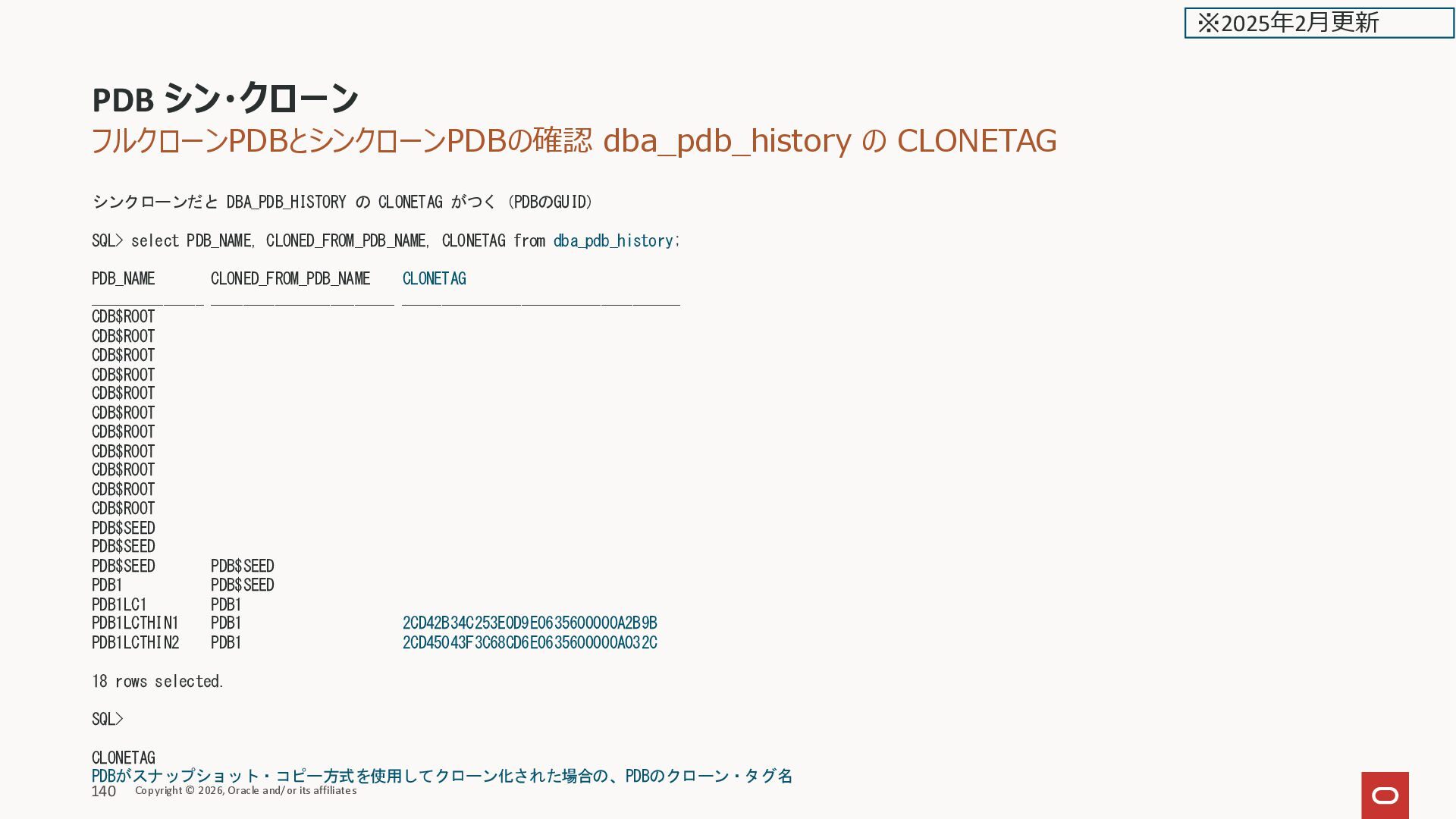 select PDB_NAME, CLONED_FROM_PDB_NAME, CLONETAG from dba_pdb_history; PDB_NAME CLONED_FROM_PDB_NAME CLONETAG ______________ _______________________ ___________________________________ CDB$ROOT CDB$ROOT CDB$ROOT CDB$ROOT CDB$ROOT CDB$ROOT CDB$ROOT CDB$ROOT CDB$ROOT CDB$ROOT CDB$ROOT PDB$SEED PDB$SEED PDB$SEED PDB$SEED PDB1 PDB$SEED PDB1LC1 PDB1 PDB1LCTHIN1 PDB1 2CD42B34C253E0D9E0635600000A2B9B PDB1LCTHIN2 PDB1 2CD45043F3C68CD6E0635600000A032C 18 rows selected. SQL> CLONETAG PDBがスナップショット・コピー方式を使用してクローン化された場合の、PDBのクローン・タグ名 PDB シン・クローン Copyright © 2026, Oracle and/or its affiliates 140 ※2025年2月更新