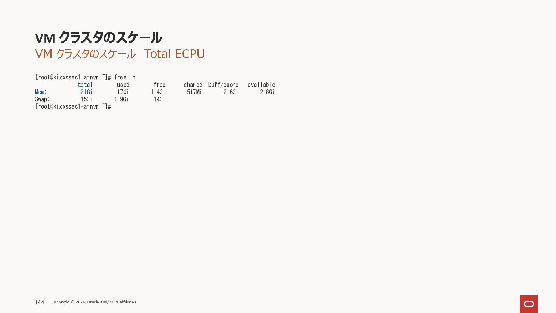 free shared buff/cache available Mem: 21Gi 17Gi 1.4Gi 517Mi 2.6Gi 2.8Gi Swap: 15Gi 1.9Gi 14Gi [root@kixxssec1-ahnvr ~]# VM クラスタのスケール Copyright © 2026, Oracle and/or its affiliates 144