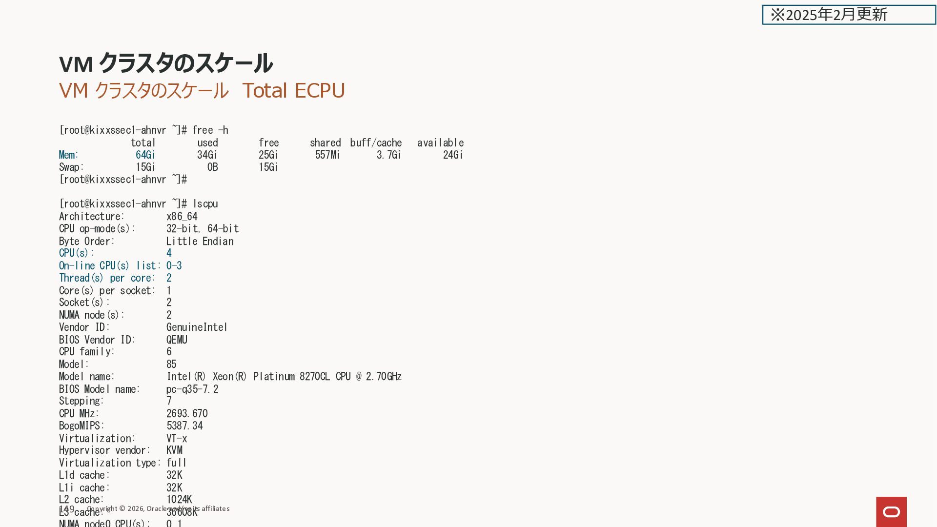 free shared buff/cache available Mem: 64Gi 34Gi 25Gi 557Mi 3.7Gi 24Gi Swap: 15Gi 0B 15Gi [root@kixxssec1-ahnvr ~]# [root@kixxssec1-ahnvr ~]# lscpu Architecture: x86_64 CPU op-mode(s): 32-bit, 64-bit Byte Order: Little Endian CPU(s): 4 On-line CPU(s) list: 0-3 Thread(s) per core: 2 Core(s) per socket: 1 Socket(s): 2 NUMA node(s): 2 Vendor ID: GenuineIntel BIOS Vendor ID: QEMU CPU family: 6 Model: 85 Model name: Intel(R) Xeon(R) Platinum 8270CL CPU @ 2.70GHz BIOS Model name: pc-q35-7.2 Stepping: 7 CPU MHz: 2693.670 BogoMIPS: 5387.34 Virtualization: VT-x Hypervisor vendor: KVM Virtualization type: full L1d cache: 32K L1i cache: 32K L2 cache: 1024K L3 cache: 36608K VM クラスタのスケール Copyright © 2026, Oracle and/or its affiliates 149 ※2025年2月更新