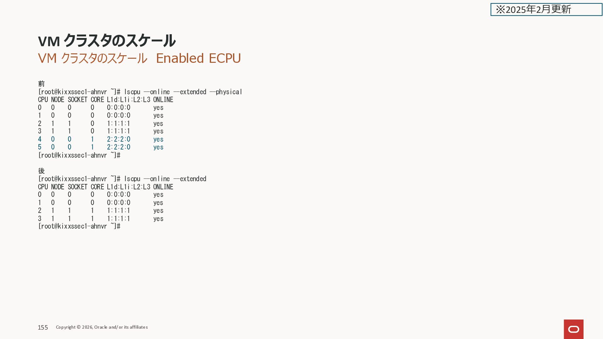 --physical CPU NODE SOCKET CORE L1d:L1i:L2:L3 ONLINE 0 0 0 0 0:0:0:0 yes 1 0 0 0 0:0:0:0 yes 2 1 1 0 1:1:1:1 yes 3 1 1 0 1:1:1:1 yes 4 0 0 1 2:2:2:0 yes 5 0 0 1 2:2:2:0 yes [root@kixxssec1-ahnvr ~]# 後 [root@kixxssec1-ahnvr ~]# lscpu --online --extended CPU NODE SOCKET CORE L1d:L1i:L2:L3 ONLINE 0 0 0 0 0:0:0:0 yes 1 0 0 0 0:0:0:0 yes 2 1 1 1 1:1:1:1 yes 3 1 1 1 1:1:1:1 yes [root@kixxssec1-ahnvr ~]# VM クラスタのスケール Copyright © 2026, Oracle and/or its affiliates 155 ※2025年2月更新