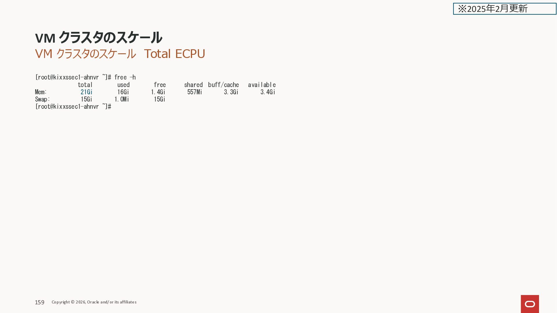 free shared buff/cache available Mem: 21Gi 16Gi 1.4Gi 557Mi 3.3Gi 3.4Gi Swap: 15Gi 1.0Mi 15Gi [root@kixxssec1-ahnvr ~]# VM クラスタのスケール Copyright © 2026, Oracle and/or its affiliates 159 ※2025年2月更新