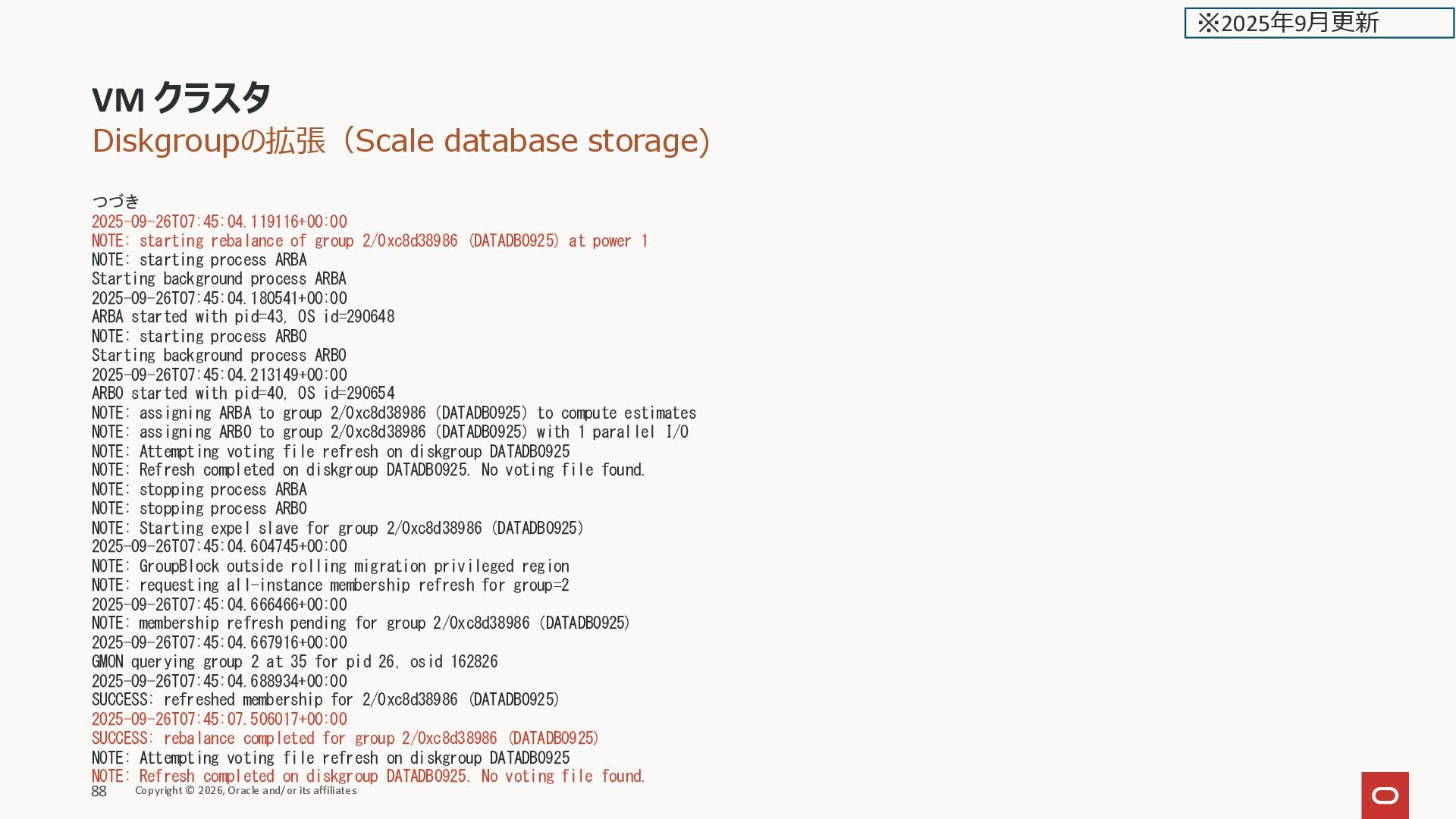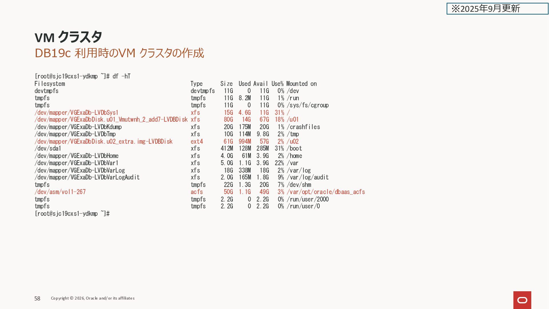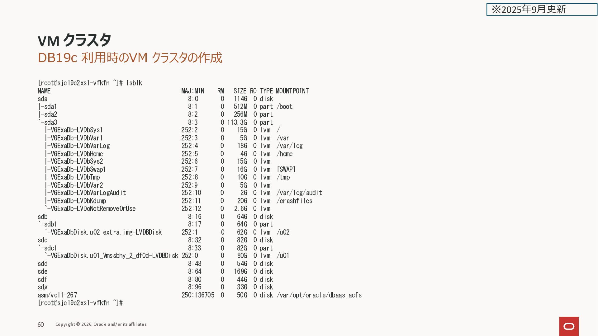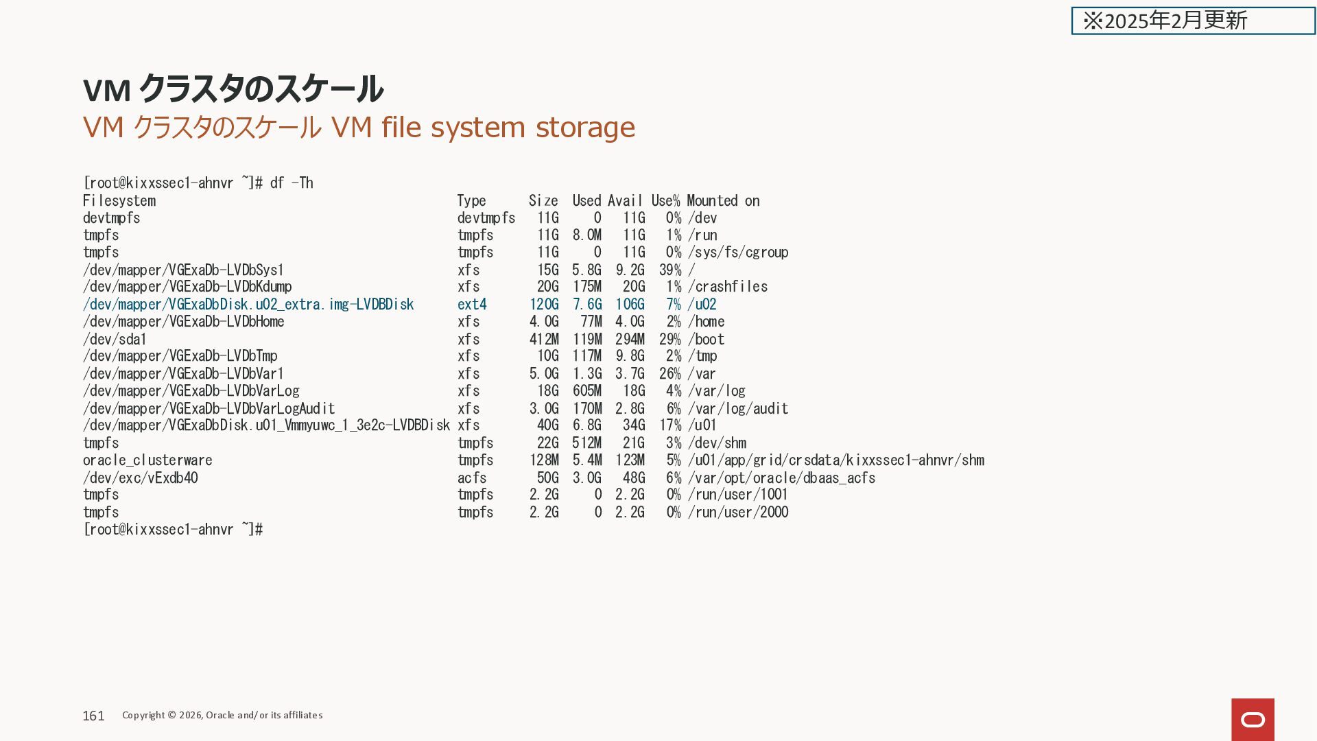 Filesystem Type Size Used Avail Use% Mounted on devtmpfs devtmpfs 11G 0 11G 0% /dev tmpfs tmpfs 11G 8.0M 11G 1% /run tmpfs tmpfs 11G 0 11G 0% /sys/fs/cgroup /dev/mapper/VGExaDb-LVDbSys1 xfs 15G 5.8G 9.2G 39% / /dev/mapper/VGExaDb-LVDbKdump xfs 20G 175M 20G 1% /crashfiles /dev/mapper/VGExaDbDisk.u02_extra.img-LVDBDisk ext4 218G 7.6G 201G 4% /u02 /dev/mapper/VGExaDb-LVDbHome xfs 4.0G 77M 4.0G 2% /home /dev/sda1 xfs 412M 119M 294M 29% /boot /dev/mapper/VGExaDb-LVDbTmp xfs 10G 117M 9.8G 2% /tmp /dev/mapper/VGExaDb-LVDbVar1 xfs 5.0G 1.3G 3.7G 26% /var /dev/mapper/VGExaDb-LVDbVarLog xfs 18G 605M 18G 4% /var/log /dev/mapper/VGExaDb-LVDbVarLogAudit xfs 3.0G 173M 2.8G 6% /var/log/audit /dev/mapper/VGExaDbDisk.u01_Vmmyuwc_1_3e2c-LVDBDisk xfs 40G 6.8G 34G 18% /u01 tmpfs tmpfs 22G 512M 21G 3% /dev/shm oracle_clusterware tmpfs 128M 5.4M 123M 5% /u01/app/grid/crsdata/kixxssec1-ahnvr/shm /dev/exc/vExdb40 acfs 50G 3.0G 48G 6% /var/opt/oracle/dbaas_acfs tmpfs tmpfs 2.2G 0 2.2G 0% /run/user/1001 tmpfs tmpfs 2.2G 0 2.2G 0% /run/user/2000 [root@kixxssec1-ahnvr ~]# マニュアルより Any extra capacity selected beyond system minimums will go into /u02. VM file system storage 拡張時は /u02 だけが拡張される VM クラスタのスケール Copyright © 2026, Oracle and/or its affiliates 165 ※2025年2月更新