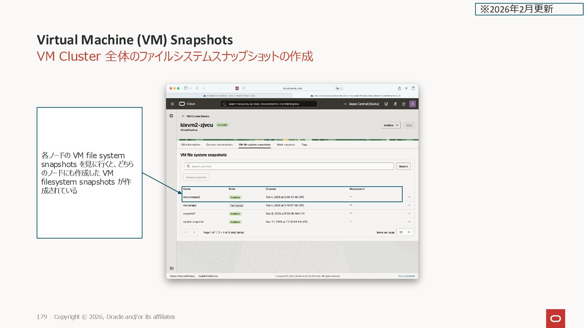 Oracle and/or its affiliates 179 各ノードの VM file system snapshots を見に行くと、どちら のノードにも作成した VM filesystem snapshots が作 成されている ※2026年2月更新