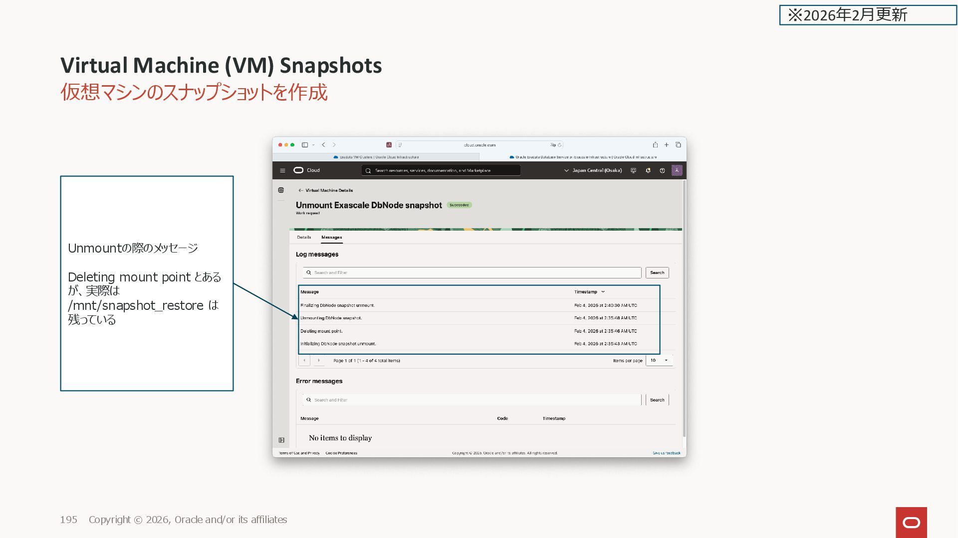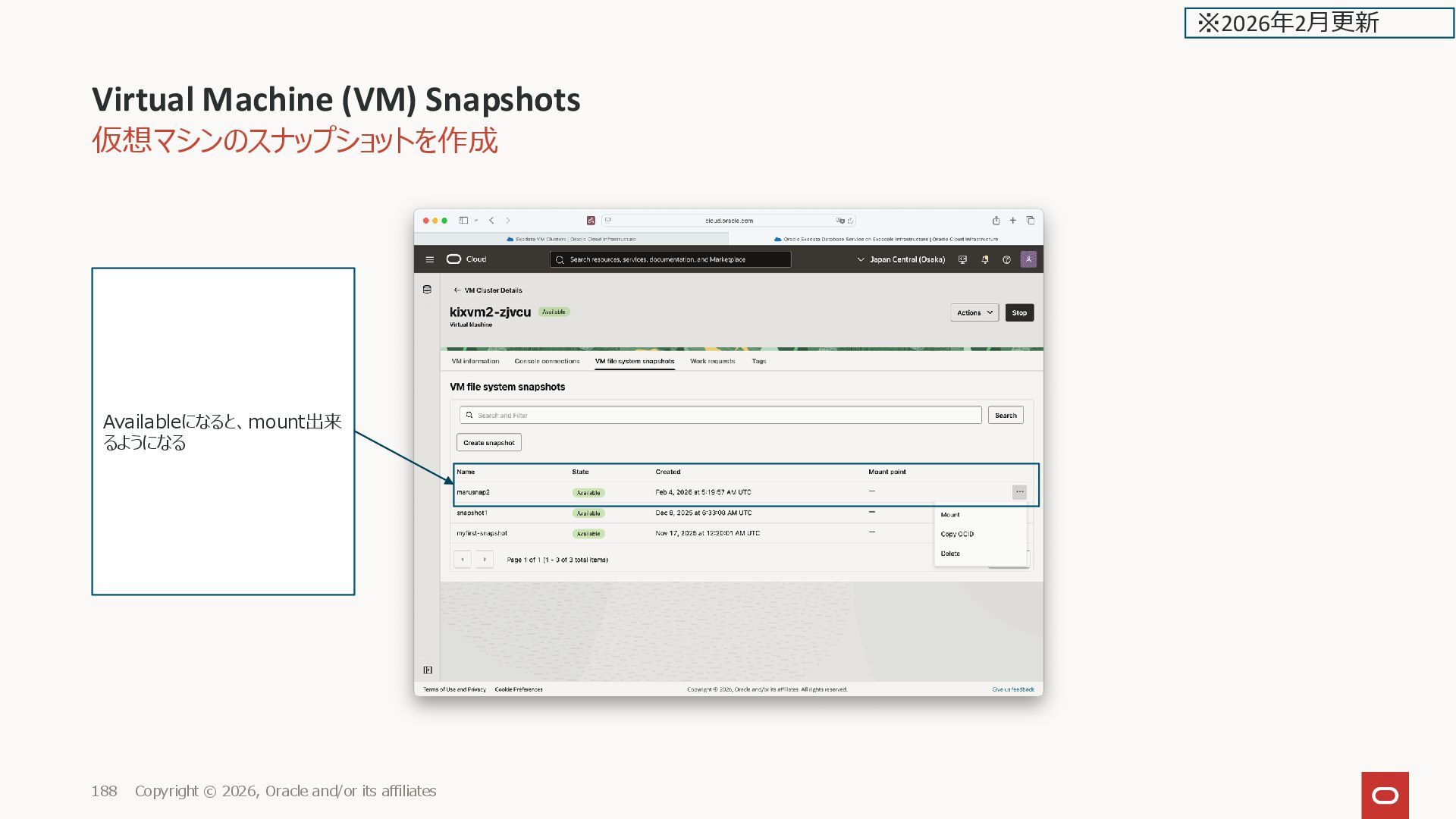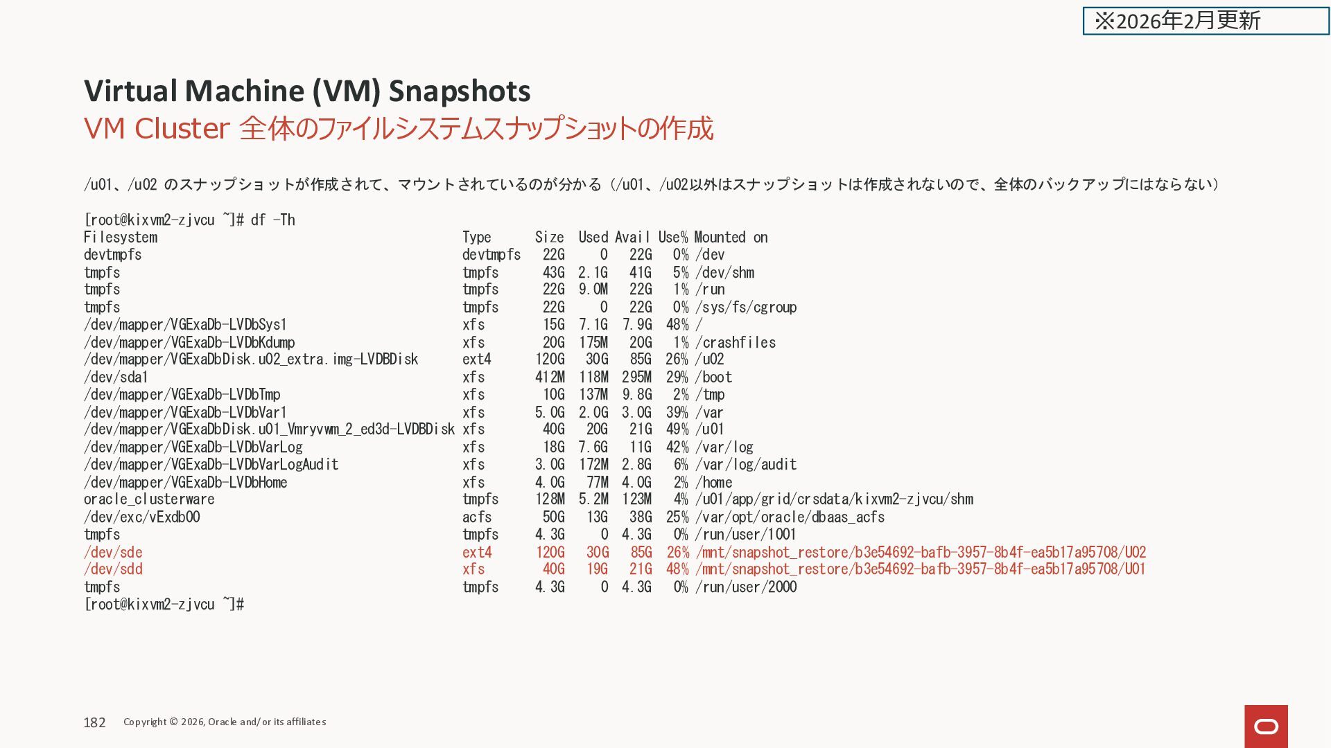 Oracle and/or its affiliates 181 Mounted でマウントされる マウントポイントが表示される (初回に /mnt/snapshot_restore の マウントポイントが自動作成され る) ※2026年2月更新