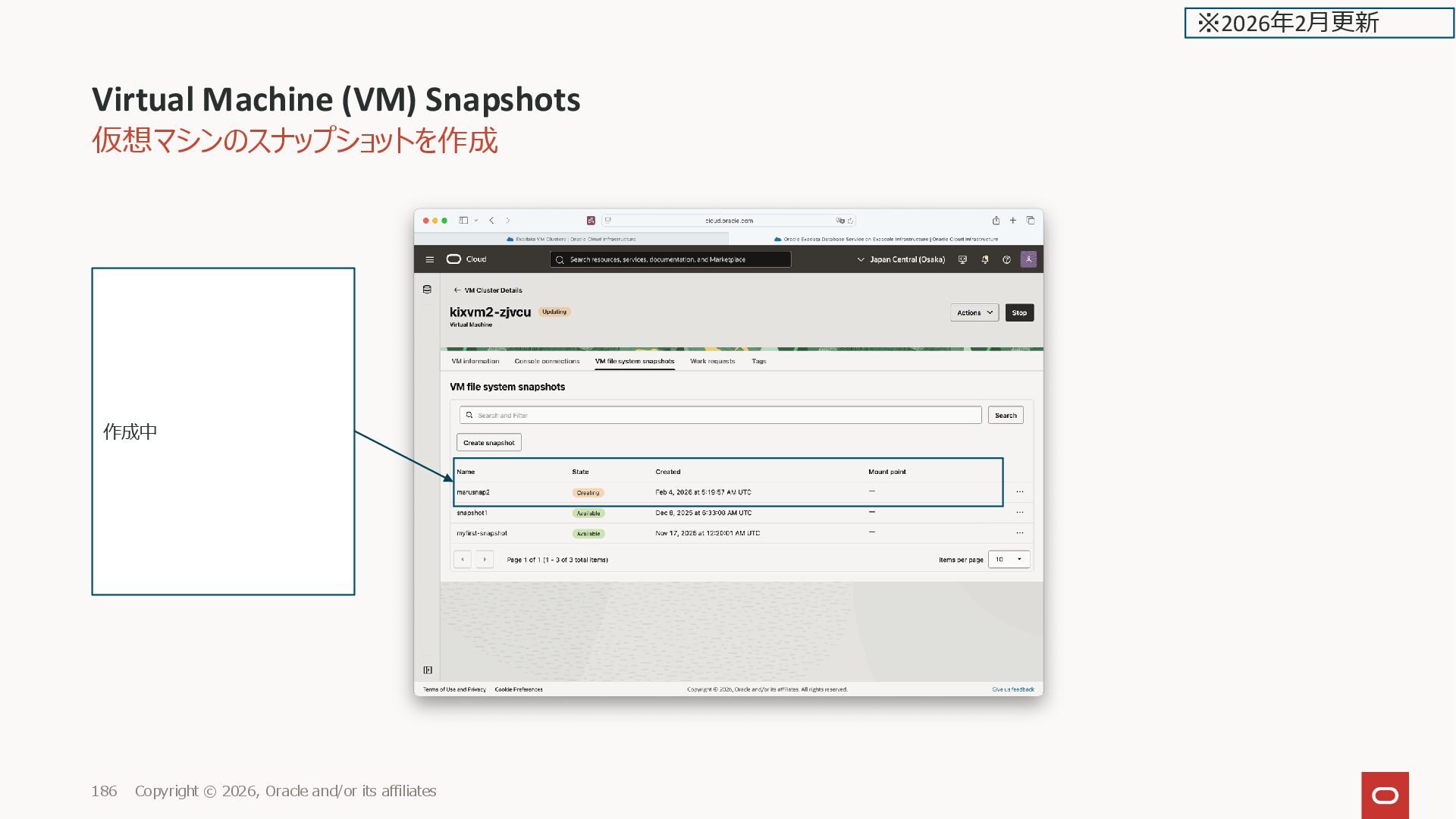 161. 仮想マシンのスナップショットを作成 Virtual Machine (VM) Snapshots Copyright © 2026, Oracle and/or