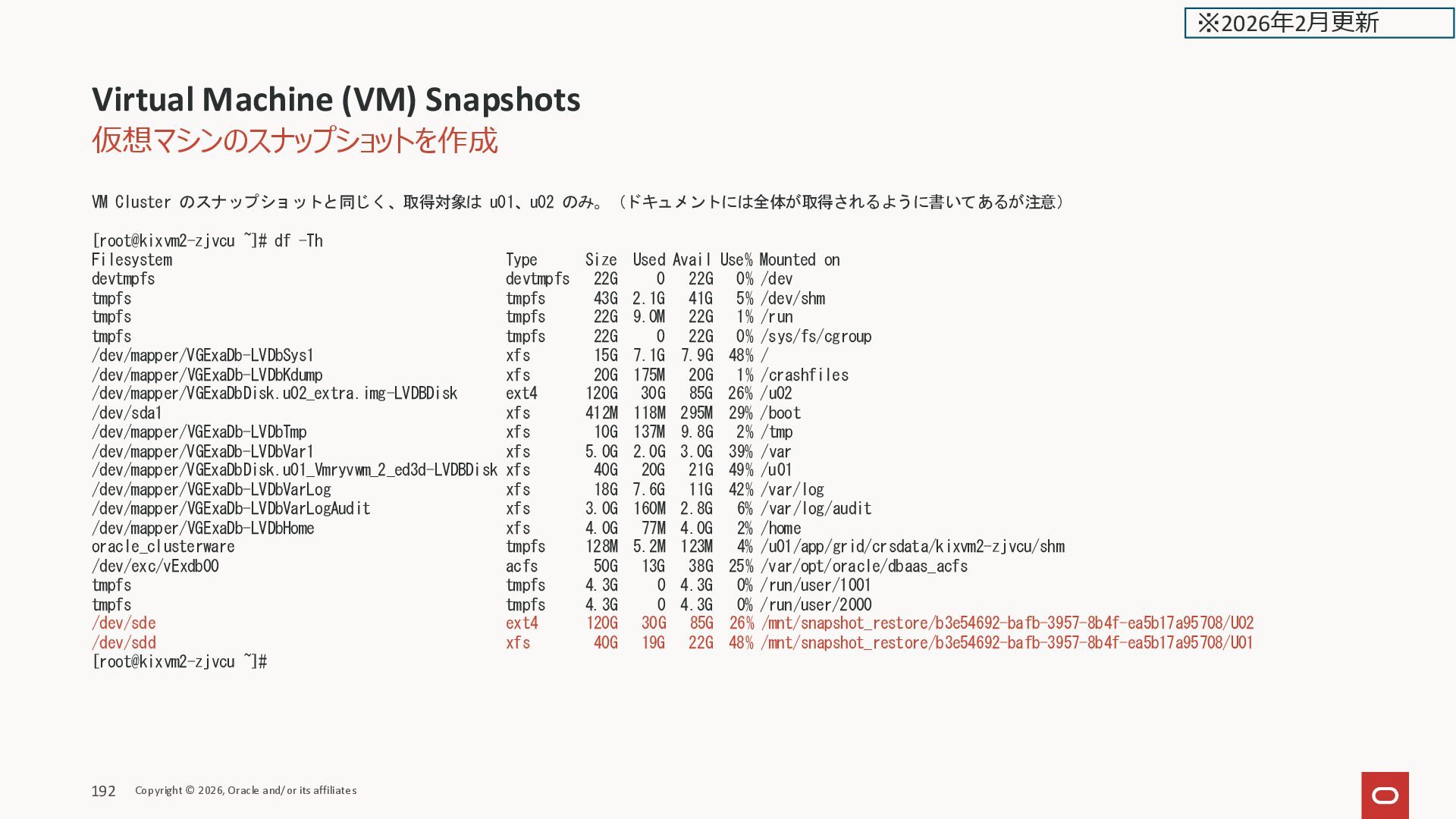 Filesystem Type Size Used Avail Use% Mounted on devtmpfs devtmpfs 22G 0 22G 0% /dev tmpfs tmpfs 43G 2.1G 41G 5% /dev/shm tmpfs tmpfs 22G 9.0M 22G 1% /run tmpfs tmpfs 22G 0 22G 0% /sys/fs/cgroup /dev/mapper/VGExaDb-LVDbSys1 xfs 15G 7.1G 7.9G 48% / /dev/mapper/VGExaDb-LVDbKdump xfs 20G 175M 20G 1% /crashfiles /dev/mapper/VGExaDbDisk.u02_extra.img-LVDBDisk ext4 120G 30G 85G 26% /u02 /dev/sda1 xfs 412M 118M 295M 29% /boot /dev/mapper/VGExaDb-LVDbTmp xfs 10G 137M 9.8G 2% /tmp /dev/mapper/VGExaDb-LVDbVar1 xfs 5.0G 2.0G 3.0G 39% /var /dev/mapper/VGExaDbDisk.u01_Vmryvwm_2_ed3d-LVDBDisk xfs 40G 20G 21G 49% /u01 /dev/mapper/VGExaDb-LVDbVarLog xfs 18G 7.6G 11G 42% /var/log /dev/mapper/VGExaDb-LVDbVarLogAudit xfs 3.0G 160M 2.8G 6% /var/log/audit /dev/mapper/VGExaDb-LVDbHome xfs 4.0G 77M 4.0G 2% /home oracle_clusterware tmpfs 128M 5.2M 123M 4% /u01/app/grid/crsdata/kixvm2-zjvcu/shm /dev/exc/vExdb00 acfs 50G 13G 38G 25% /var/opt/oracle/dbaas_acfs tmpfs tmpfs 4.3G 0 4.3G 0% /run/user/1001 tmpfs tmpfs 4.3G 0 4.3G 0% /run/user/2000 /dev/sde ext4 120G 30G 85G 26% /mnt/snapshot_restore/b3e54692-bafb-3957-8b4f-ea5b17a95708/U02 /dev/sdd xfs 40G 19G 22G 48% /mnt/snapshot_restore/b3e54692-bafb-3957-8b4f-ea5b17a95708/U01 [root@kixvm2-zjvcu ~]# Virtual Machine (VM) Snapshots Copyright © 2026, Oracle and/or its affiliates 192 ※2026年2月更新