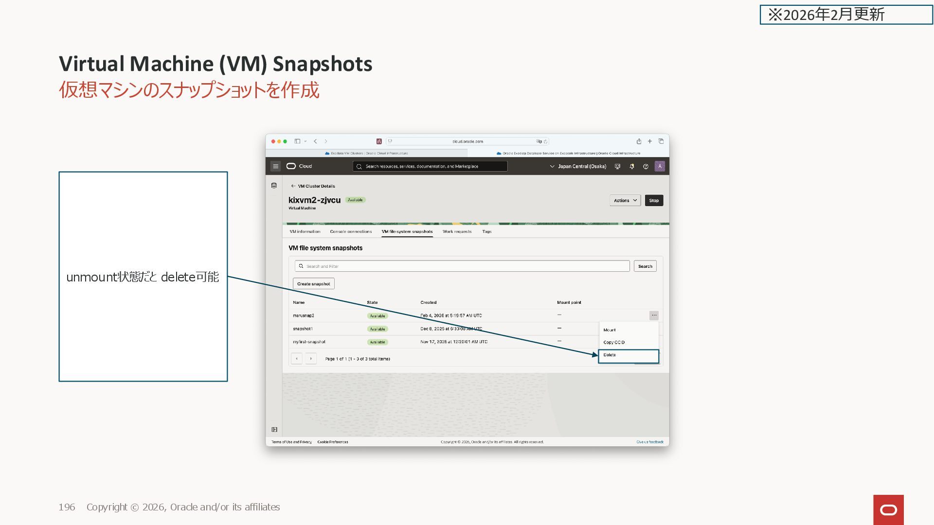 160. 仮想マシンのスナップショットを作成 Virtual Machine (VM) Snapshots Copyright © 2026, Oracle and/or