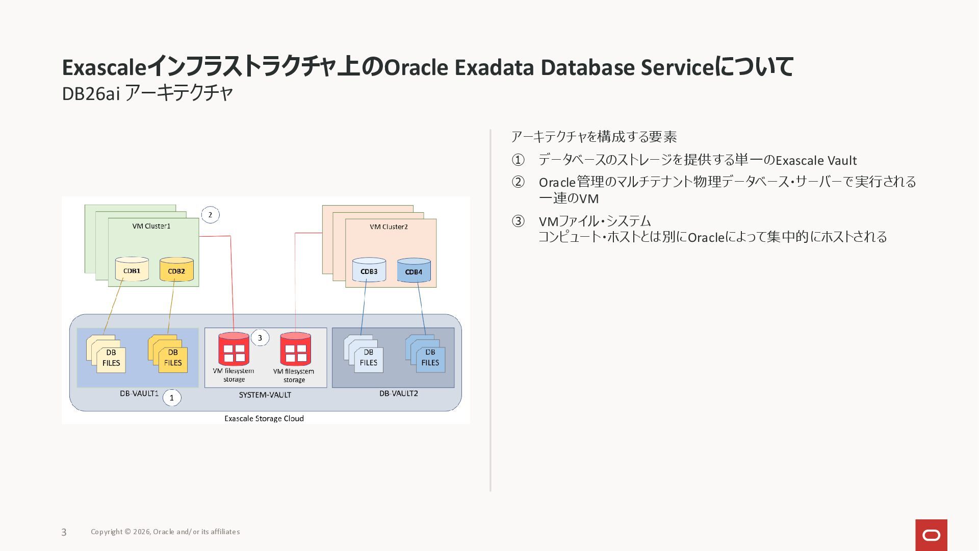 2. DB26ai アーキテクチャ アーキテクチャを構成する要素 ① データベースのストレージを提供する単一のExascale Vault ② Oracle管理のマルチテナント物理データベース・サーバーで実行される 一連のVM ③
