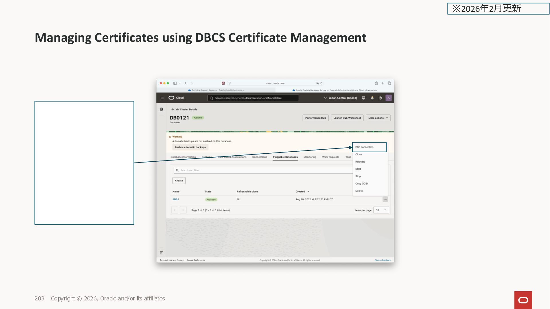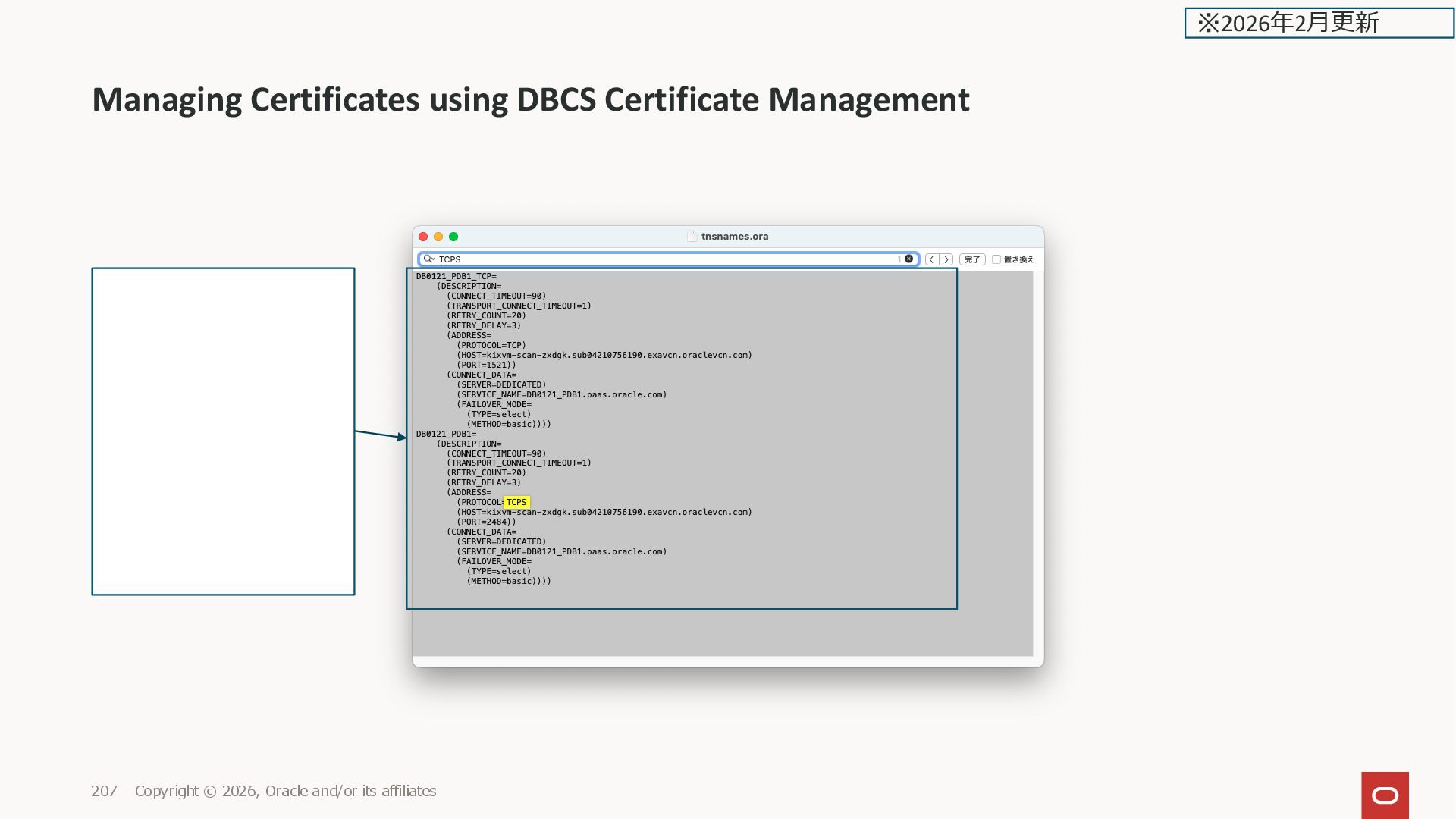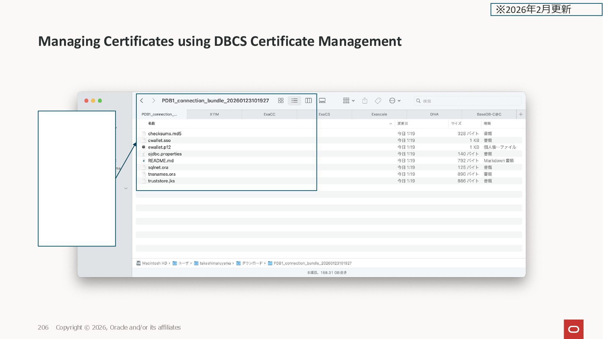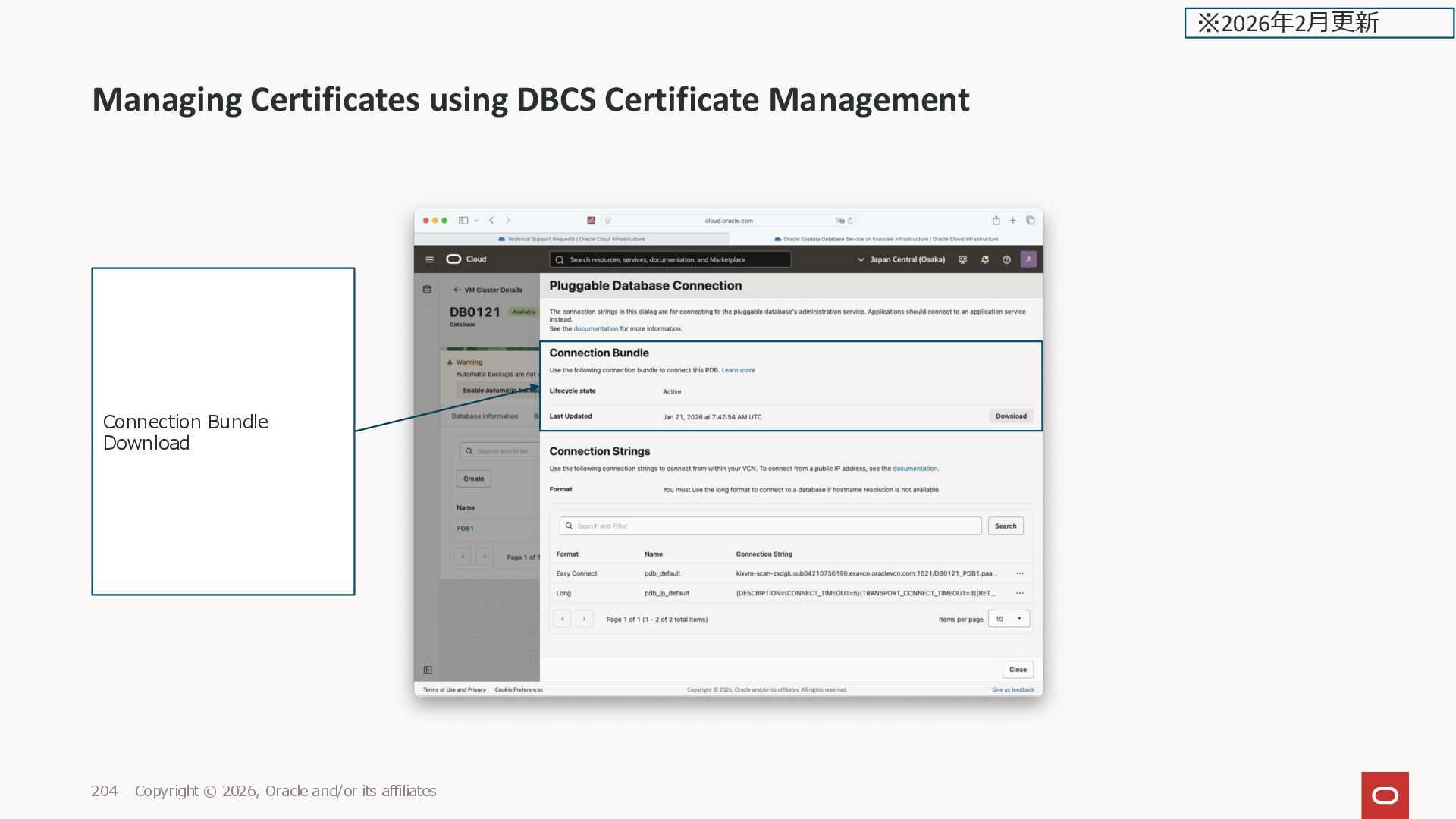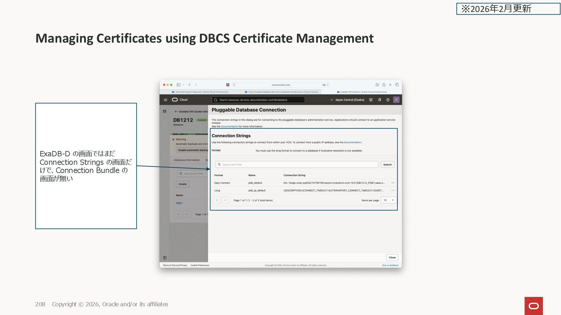 and/or its affiliates 208 ExaDB-D の画面ではまだ Connection Strings の画面だ けで、Connection Bundle の 画面が無い ※2026年2月更新