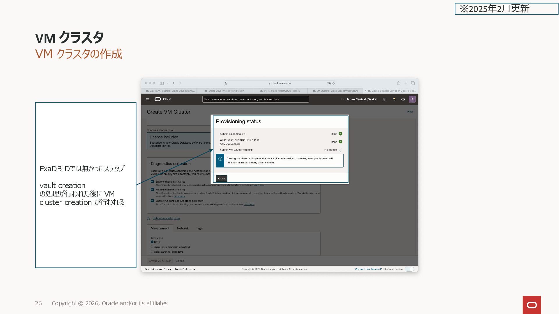 affiliates 26 ※2025年2月更新 ExaDB-Dでは無かったステップ vault creation の処理が行われた後に VM cluster creation が行われる