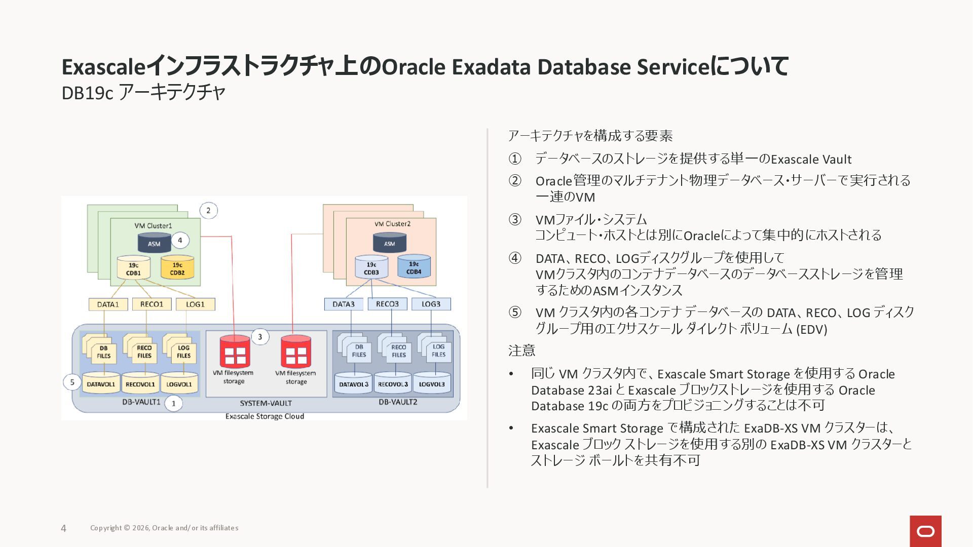 VMファイル・システム コンピュート・ホストとは別にOracleによって集中的にホストされる Exascaleインフラストラクチャ上のOracle Exadata Database Serviceについて Copyright © 2026, Oracle and/or its affiliates 3