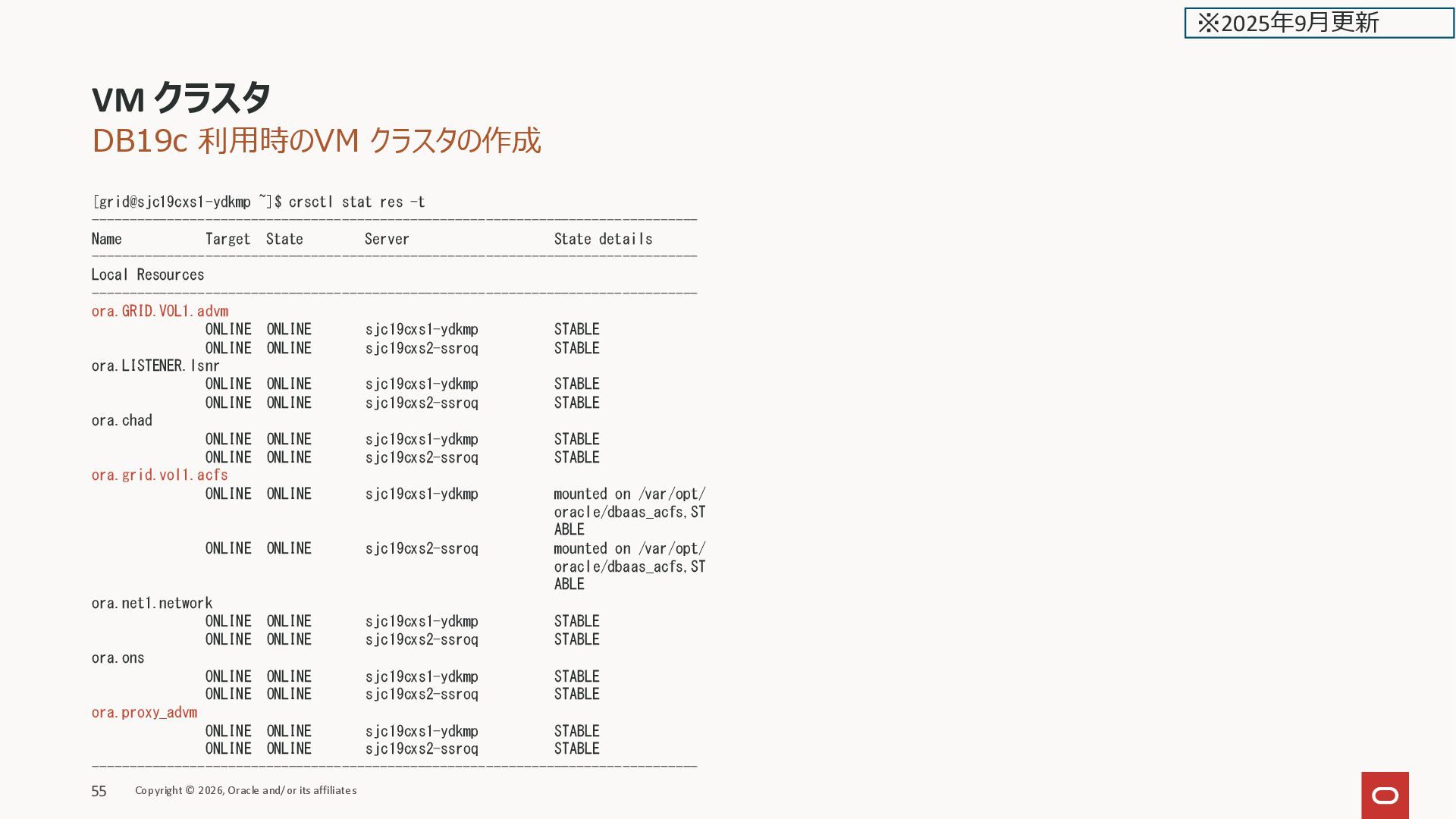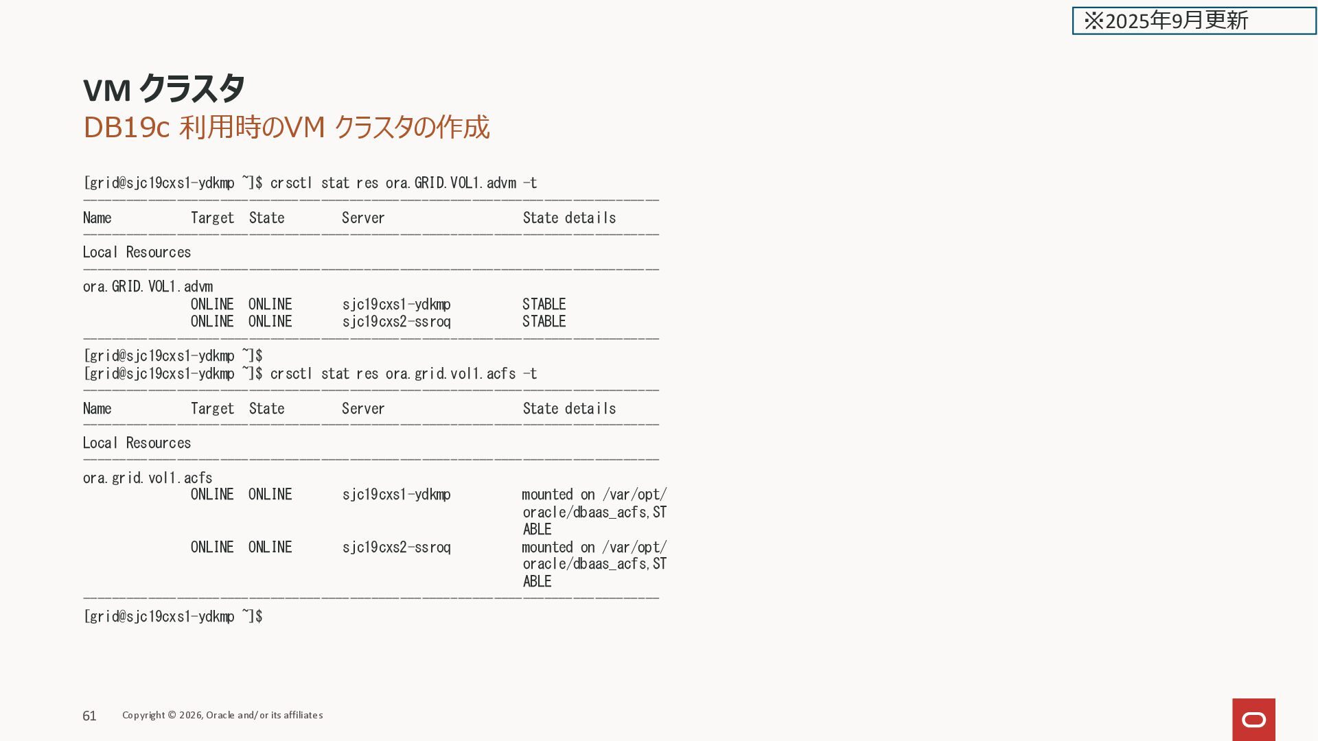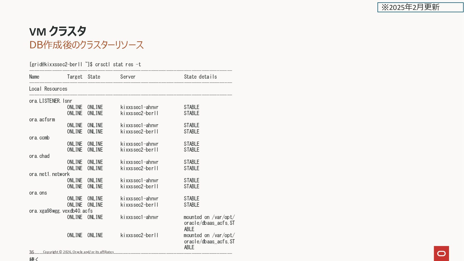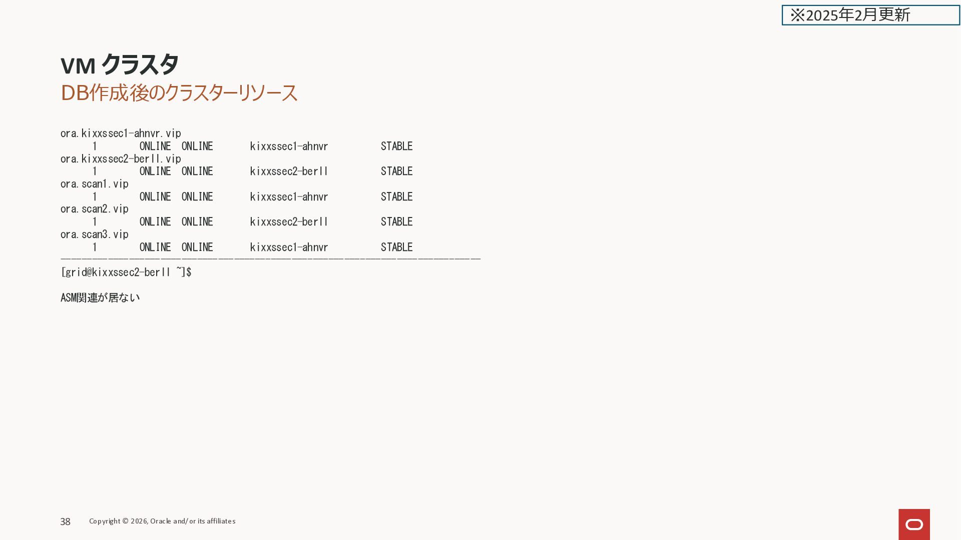 ONLINE kixxssec2-berll STABLE ora.scan1.vip 1 ONLINE ONLINE kixxssec1-ahnvr STABLE ora.scan2.vip 1 ONLINE ONLINE kixxssec2-berll STABLE ora.scan3.vip 1 ONLINE ONLINE kixxssec1-ahnvr STABLE -------------------------------------------------------------------------------- [grid@kixxssec2-berll ~]$ ASM関連が居ない VM クラスタ Copyright © 2026, Oracle and/or its affiliates 38 ※2025年2月更新