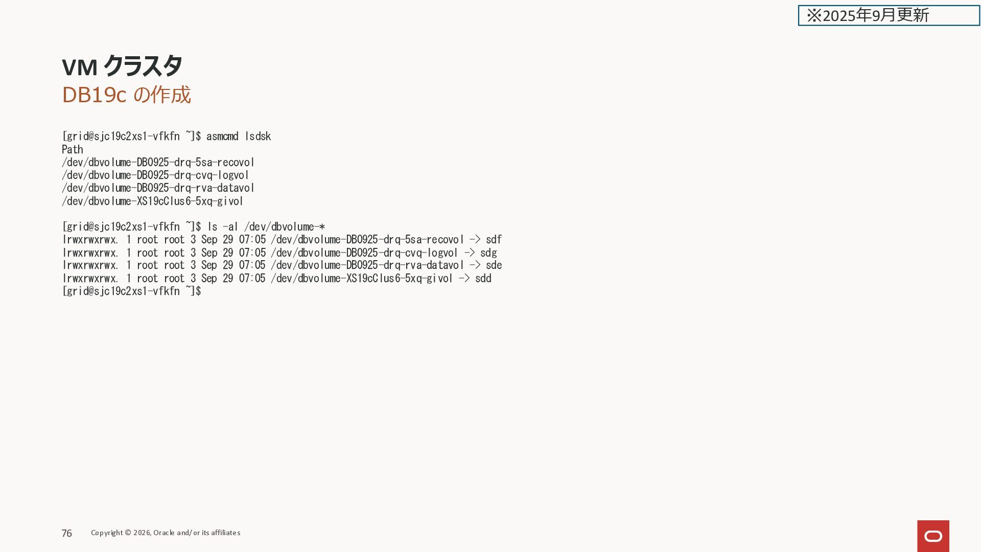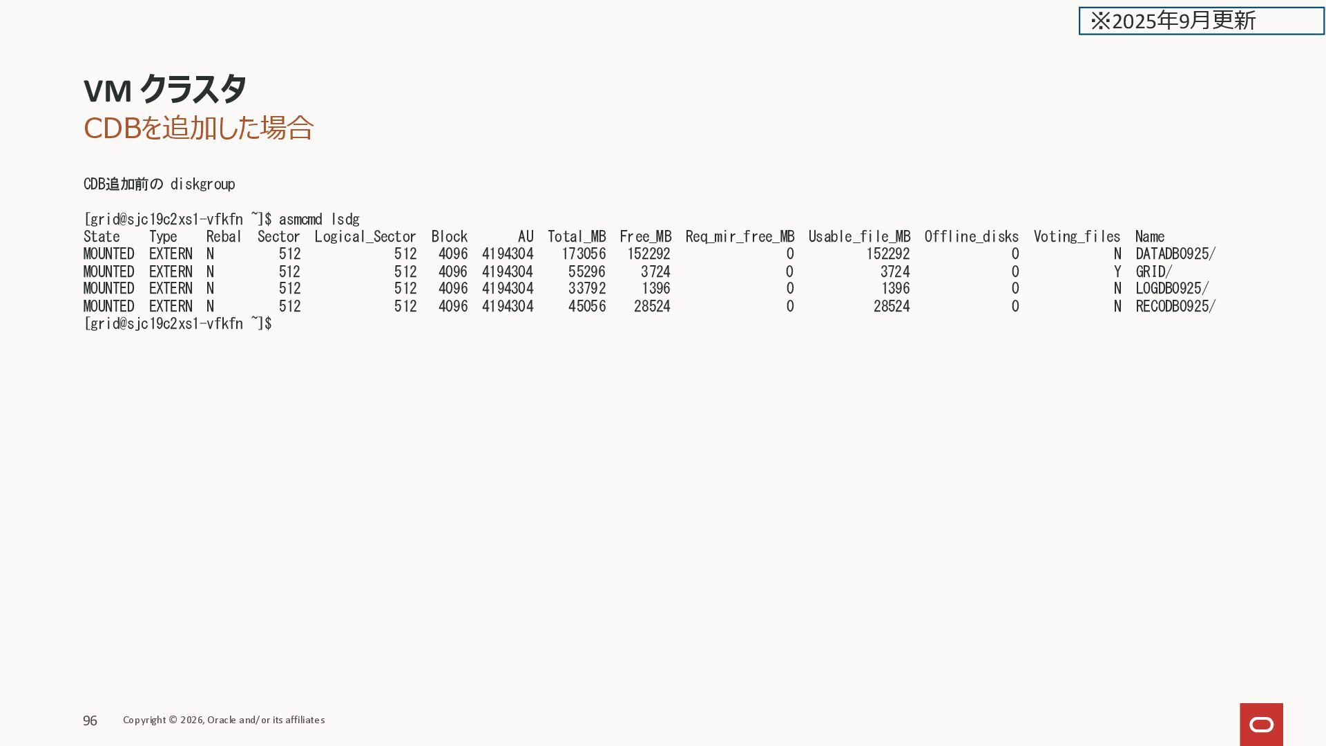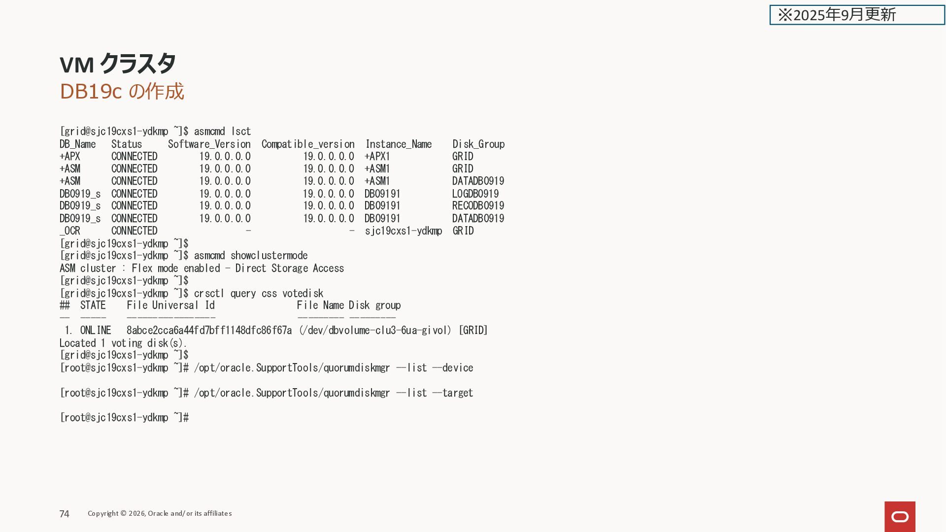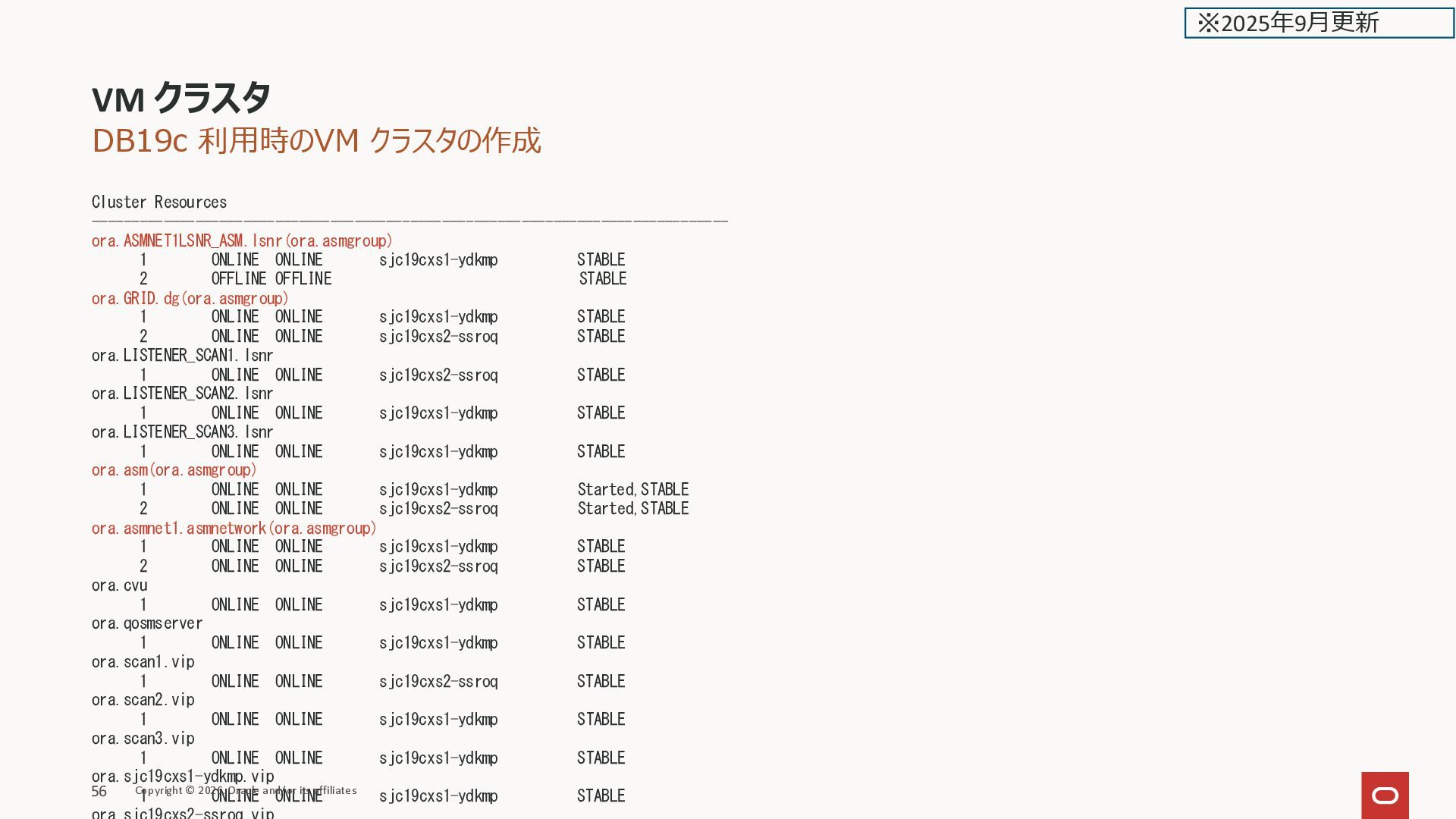 ONLINE kixxssec2-berll STABLE ora.scan1.vip 1 ONLINE ONLINE kixxssec1-ahnvr STABLE ora.scan2.vip 1 ONLINE ONLINE kixxssec2-berll STABLE ora.scan3.vip 1 ONLINE ONLINE kixxssec1-ahnvr STABLE -------------------------------------------------------------------------------- [grid@kixxssec2-berll ~]$ ASM関連が居ない VM クラスタ Copyright © 2026, Oracle and/or its affiliates 38 ※2025年2月更新