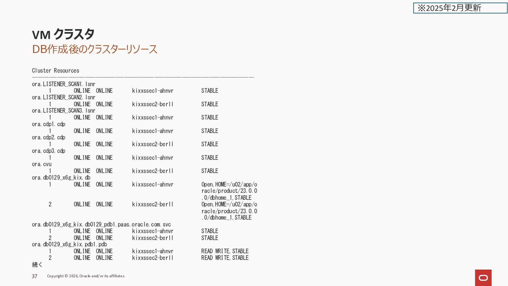 State Server State details -------------------------------------------------------------------------------- Local Resources -------------------------------------------------------------------------------- ora.LISTENER.lsnr ONLINE ONLINE kixxssec1-ahnvr STABLE ONLINE ONLINE kixxssec2-berll STABLE ora.acfsrm ONLINE ONLINE kixxssec1-ahnvr STABLE ONLINE ONLINE kixxssec2-berll STABLE ora.ccmb ONLINE ONLINE kixxssec1-ahnvr STABLE ONLINE ONLINE kixxssec2-berll STABLE ora.chad ONLINE ONLINE kixxssec1-ahnvr STABLE ONLINE ONLINE kixxssec2-berll STABLE ora.net1.network ONLINE ONLINE kixxssec1-ahnvr STABLE ONLINE ONLINE kixxssec2-berll STABLE ora.ons ONLINE ONLINE kixxssec1-ahnvr STABLE ONLINE ONLINE kixxssec2-berll STABLE ora.xga98wgg.vexdb40.acfs ONLINE ONLINE kixxssec1-ahnvr mounted on /var/opt/ oracle/dbaas_acfs,ST ABLE ONLINE ONLINE kixxssec2-berll mounted on /var/opt/ oracle/dbaas_acfs,ST ABLE -------------------------------------------------------------------------------- VM クラスタ Copyright © 2026, Oracle and/or its affiliates 36 ※2025年2月更新