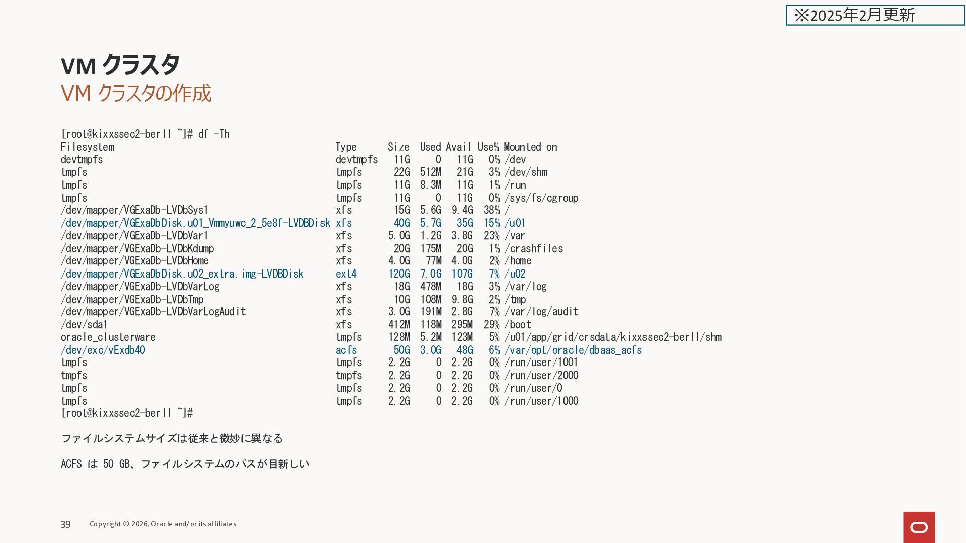 Avail Use% Mounted on devtmpfs devtmpfs 11G 0 11G 0% /dev tmpfs tmpfs 22G 512M 21G 3% /dev/shm tmpfs tmpfs 11G 8.3M 11G 1% /run tmpfs tmpfs 11G 0 11G 0% /sys/fs/cgroup /dev/mapper/VGExaDb-LVDbSys1 xfs 15G 5.6G 9.4G 38% / /dev/mapper/VGExaDbDisk.u01_Vmmyuwc_2_5e8f-LVDBDisk xfs 40G 5.7G 35G 15% /u01 /dev/mapper/VGExaDb-LVDbVar1 xfs 5.0G 1.2G 3.8G 23% /var /dev/mapper/VGExaDb-LVDbKdump xfs 20G 175M 20G 1% /crashfiles /dev/mapper/VGExaDb-LVDbHome xfs 4.0G 77M 4.0G 2% /home /dev/mapper/VGExaDbDisk.u02_extra.img-LVDBDisk ext4 120G 7.0G 107G 7% /u02 /dev/mapper/VGExaDb-LVDbVarLog xfs 18G 478M 18G 3% /var/log /dev/mapper/VGExaDb-LVDbTmp xfs 10G 108M 9.8G 2% /tmp /dev/mapper/VGExaDb-LVDbVarLogAudit xfs 3.0G 191M 2.8G 7% /var/log/audit /dev/sda1 xfs 412M 118M 295M 29% /boot oracle_clusterware tmpfs 128M 5.2M 123M 5% /u01/app/grid/crsdata/kixxssec2-berll/shm /dev/exc/vExdb40 acfs 50G 3.0G 48G 6% /var/opt/oracle/dbaas_acfs tmpfs tmpfs 2.2G 0 2.2G 0% /run/user/1001 tmpfs tmpfs 2.2G 0 2.2G 0% /run/user/2000 tmpfs tmpfs 2.2G 0 2.2G 0% /run/user/0 tmpfs tmpfs 2.2G 0 2.2G 0% /run/user/1000 [root@kixxssec2-berll ~]# ファイルシステムサイズは従来と微妙に異なる ACFS は 50 GB、ファイルシステムのパスが目新しい VM クラスタ Copyright © 2026, Oracle and/or its affiliates 39 ※2025年2月更新