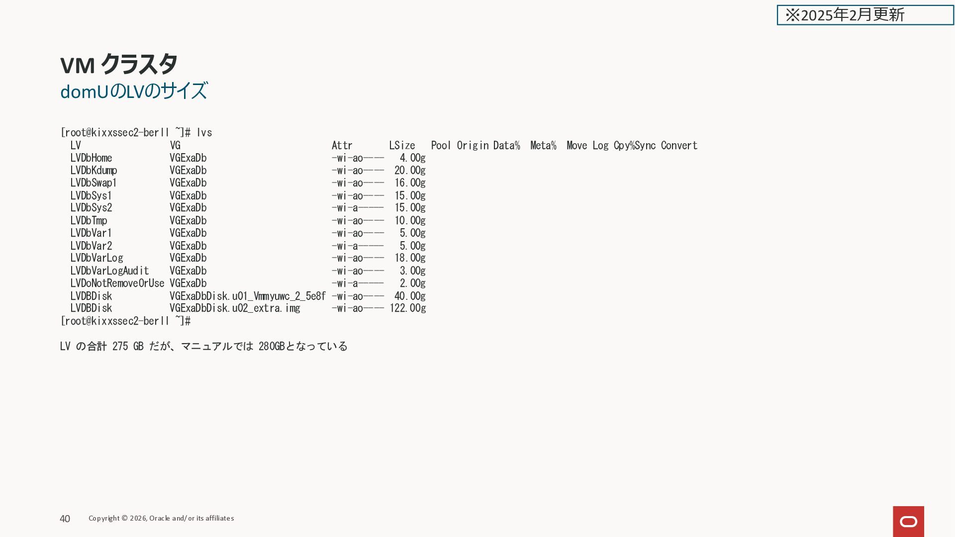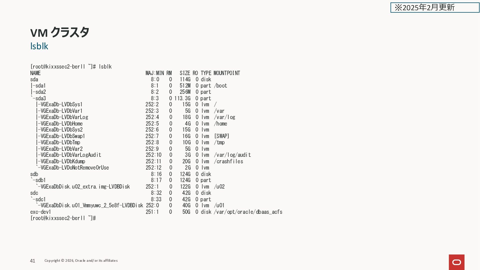 Data% Meta% Move Log Cpy%Sync Convert LVDbHome VGExaDb -wi-ao---- 4.00g LVDbKdump VGExaDb -wi-ao---- 20.00g LVDbSwap1 VGExaDb -wi-ao---- 16.00g LVDbSys1 VGExaDb -wi-ao---- 15.00g LVDbSys2 VGExaDb -wi-a----- 15.00g LVDbTmp VGExaDb -wi-ao---- 10.00g LVDbVar1 VGExaDb -wi-ao---- 5.00g LVDbVar2 VGExaDb -wi-a----- 5.00g LVDbVarLog VGExaDb -wi-ao---- 18.00g LVDbVarLogAudit VGExaDb -wi-ao---- 3.00g LVDoNotRemoveOrUse VGExaDb -wi-a----- 2.00g LVDBDisk VGExaDbDisk.u01_Vmmyuwc_2_5e8f -wi-ao---- 40.00g LVDBDisk VGExaDbDisk.u02_extra.img -wi-ao---- 122.00g [root@kixxssec2-berll ~]# LV の合計 275 GB だが、マニュアルでは 280GBとなっている VM クラスタ Copyright © 2026, Oracle and/or its affiliates 40 ※2025年2月更新