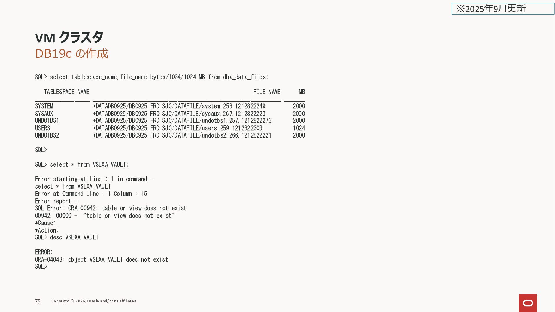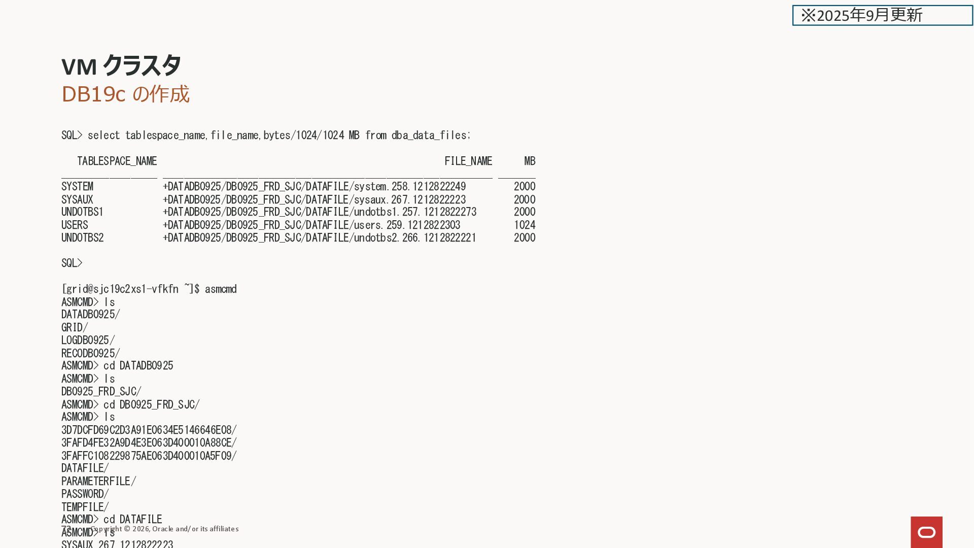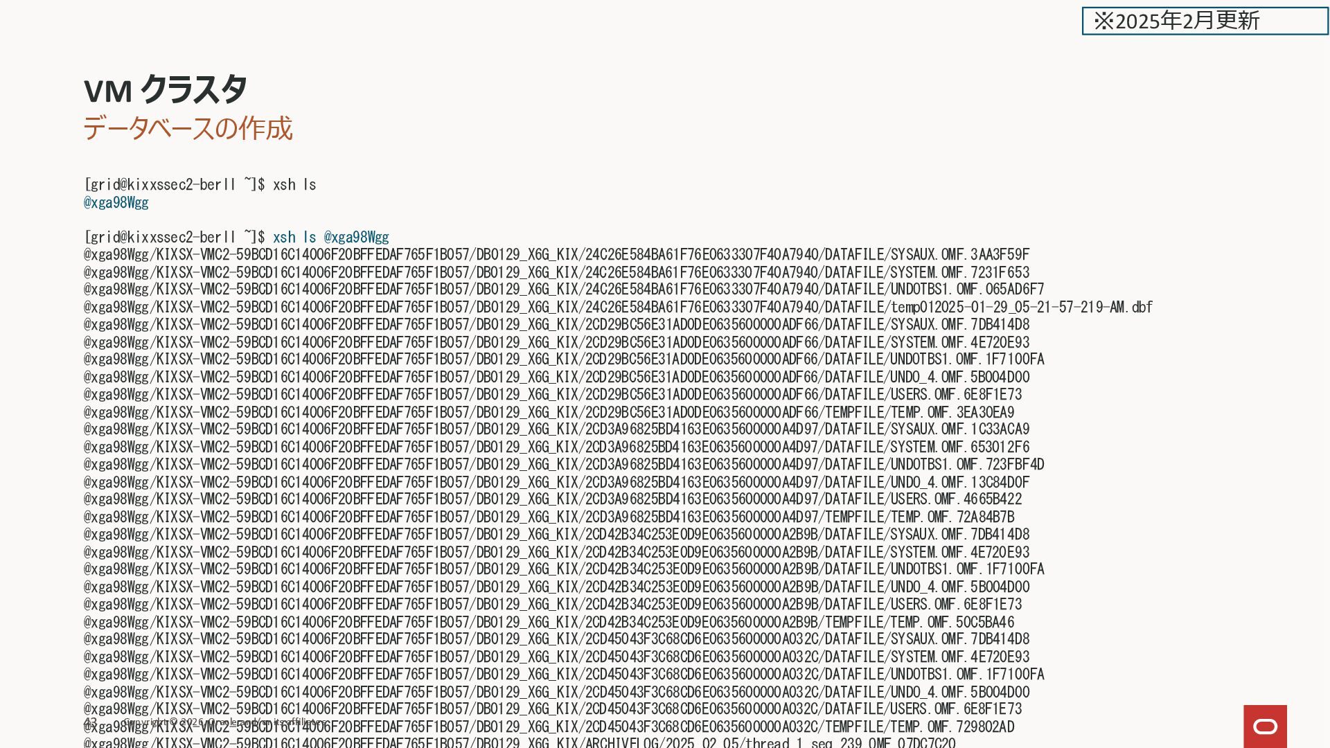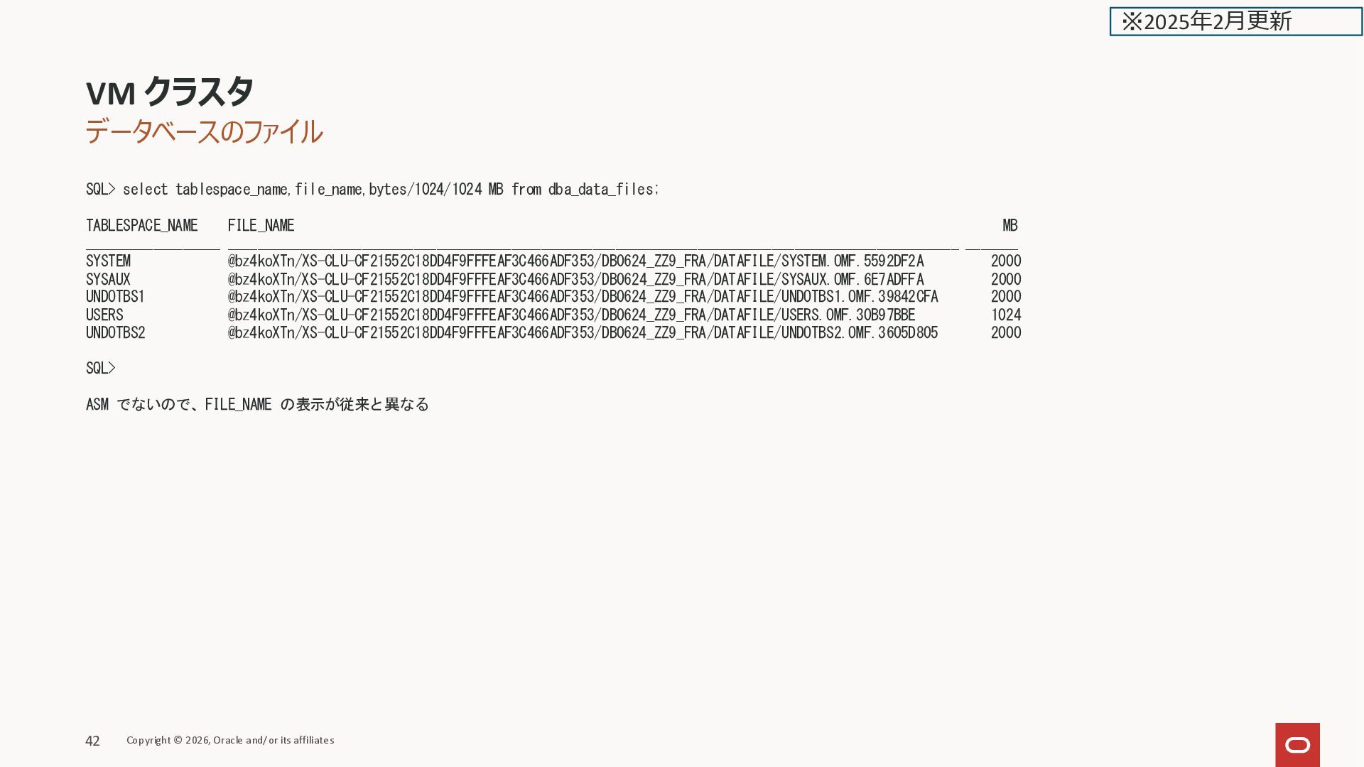 __________________ __________________________________________________________________________________________________ _______ SYSTEM @bz4koXTn/XS-CLU-CF21552C18DD4F9FFFEAF3C466ADF353/DB0624_ZZ9_FRA/DATAFILE/SYSTEM.OMF.5592DF2A 2000 SYSAUX @bz4koXTn/XS-CLU-CF21552C18DD4F9FFFEAF3C466ADF353/DB0624_ZZ9_FRA/DATAFILE/SYSAUX.OMF.6E7ADFFA 2000 UNDOTBS1 @bz4koXTn/XS-CLU-CF21552C18DD4F9FFFEAF3C466ADF353/DB0624_ZZ9_FRA/DATAFILE/UNDOTBS1.OMF.39842CFA 2000 USERS @bz4koXTn/XS-CLU-CF21552C18DD4F9FFFEAF3C466ADF353/DB0624_ZZ9_FRA/DATAFILE/USERS.OMF.30B97BBE 1024 UNDOTBS2 @bz4koXTn/XS-CLU-CF21552C18DD4F9FFFEAF3C466ADF353/DB0624_ZZ9_FRA/DATAFILE/UNDOTBS2.OMF.3605D805 2000 SQL> ASM でないので、FILE_NAME の表示が従来と異なる VM クラスタ Copyright © 2026, Oracle and/or its affiliates 42 ※2025年2月更新