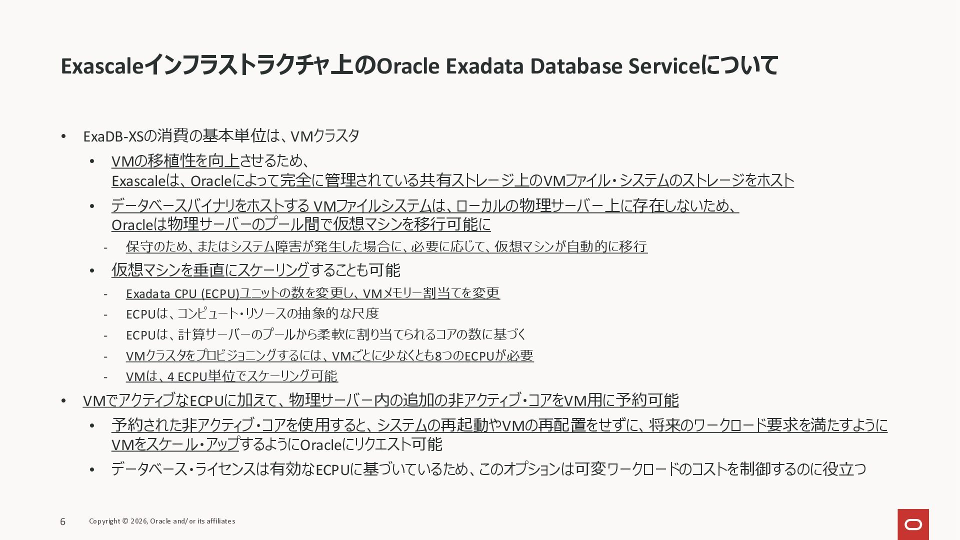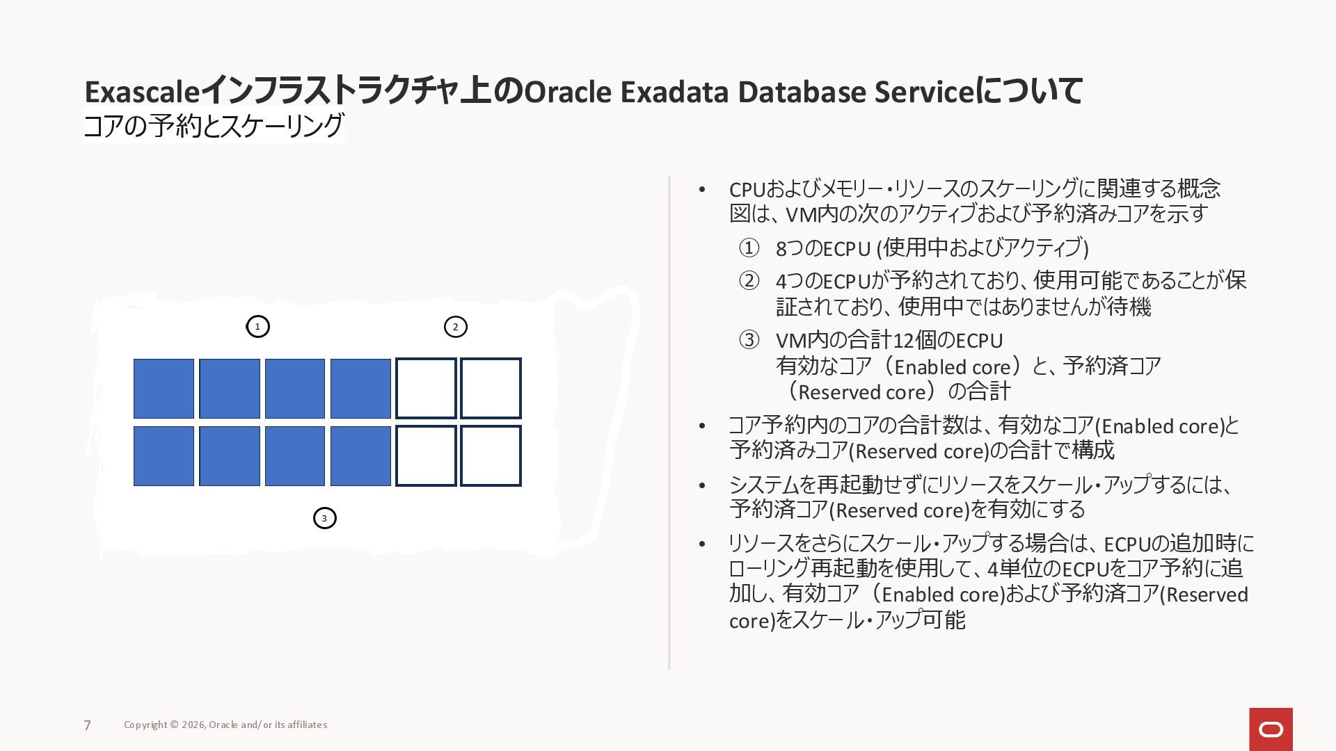 ③ VM内の合計12個のECPU 有効なコア(Enabled core)と、予約済コア (Reserved core)の合計 • コア予約内のコアの合計数は、有効なコア(Enabled core)と 予約済みコア(Reserved core)の合計で構成 • システムを再起動せずにリソースをスケール・アップするには、 予約済コア(Reserved core)を有効にする • リソースをさらにスケール・アップする場合は、ECPUの追加時に ローリング再起動を使用して、4単位のECPUをコア予約に追 加し、有効コア(Enabled core)および予約済コア(Reserved core)をスケール・アップ可能 Exascaleインフラストラクチャ上のOracle Exadata Database Serviceについて Copyright © 2026, Oracle and/or its affiliates 7