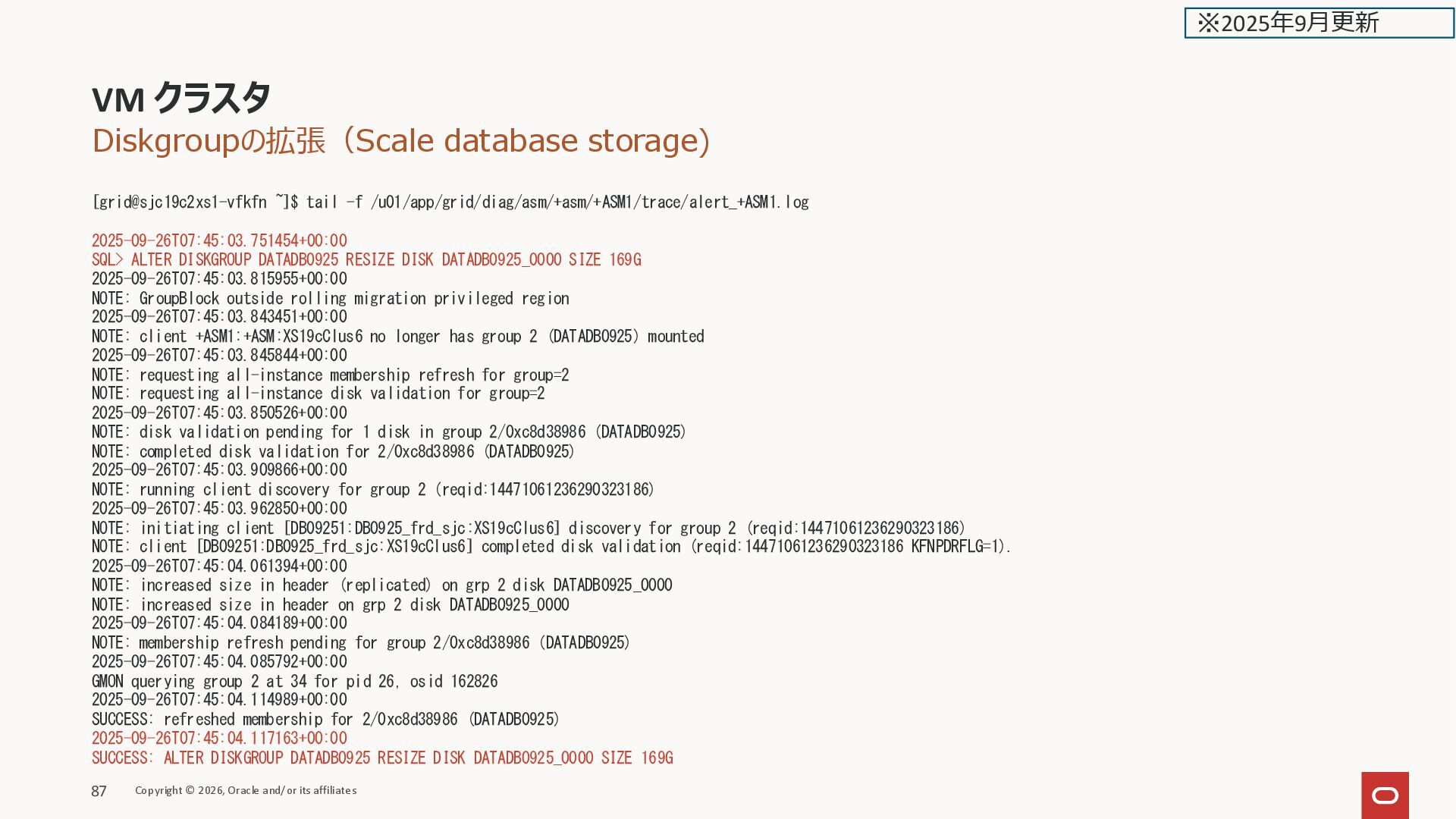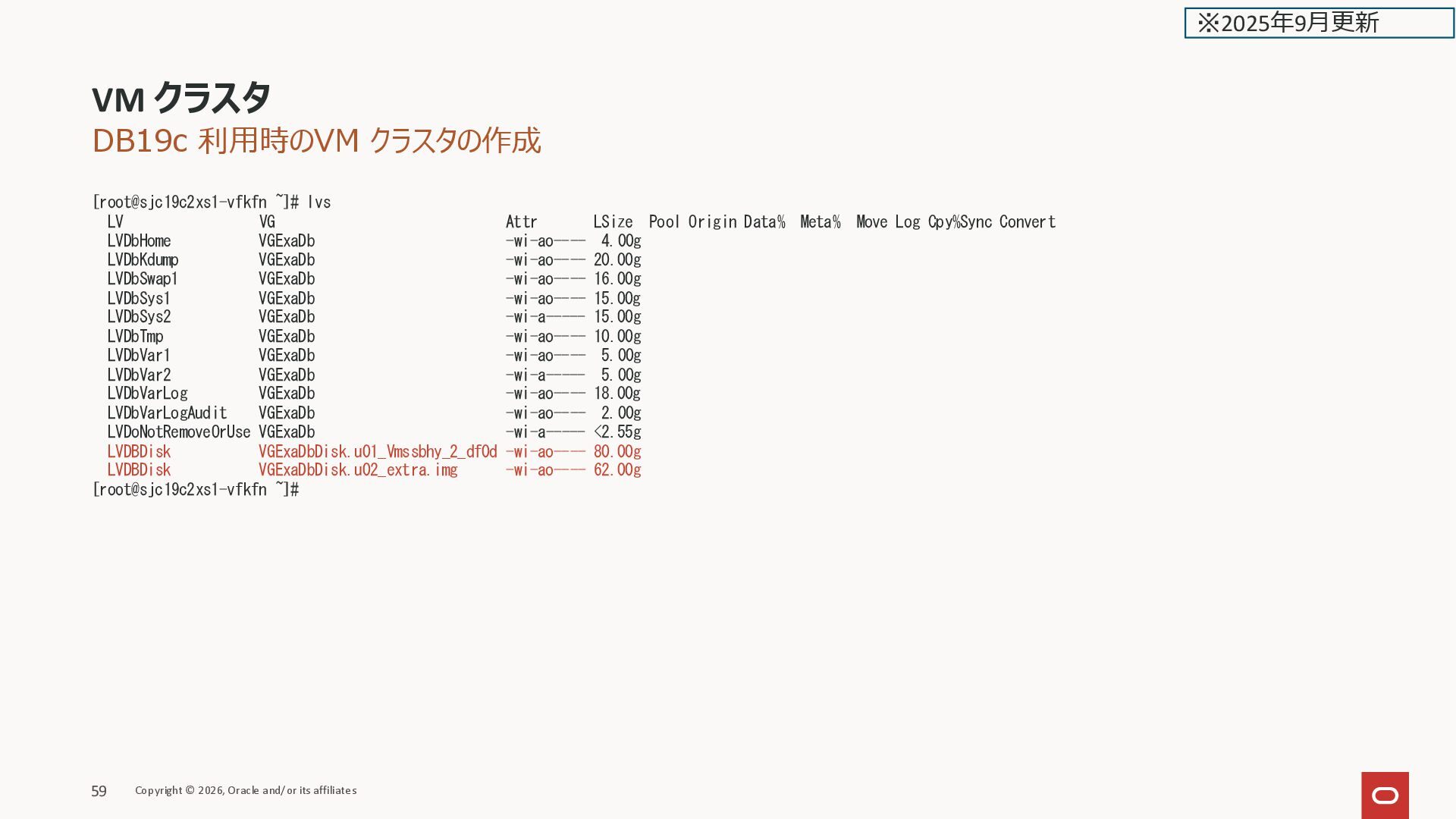 VG Attr LSize Pool Origin Data% Meta% Move Log Cpy%Sync Convert LVDbHome VGExaDb -wi-ao---- 4.00g LVDbKdump VGExaDb -wi-ao---- 20.00g LVDbSwap1 VGExaDb -wi-ao---- 16.00g LVDbSys1 VGExaDb -wi-ao---- 15.00g LVDbSys2 VGExaDb -wi-a----- 15.00g LVDbTmp VGExaDb -wi-ao---- 10.00g LVDbVar1 VGExaDb -wi-ao---- 5.00g LVDbVar2 VGExaDb -wi-a----- 5.00g LVDbVarLog VGExaDb -wi-ao---- 18.00g LVDbVarLogAudit VGExaDb -wi-ao---- 3.00g LVDoNotRemoveOrUse VGExaDb -wi-a----- 2.00g LVDBDisk VGExaDbDisk.u01_Vmmyuwc_1_3e2c -wi-ao---- 40.00g LVDBDisk VGExaDbDisk.u02_extra.img -wi-ao---- 222.00g [root@kixxssec1-ahnvr ~]# VM クラスタのスケール Copyright © 2026, Oracle and/or its affiliates 166 ※2025年2月更新