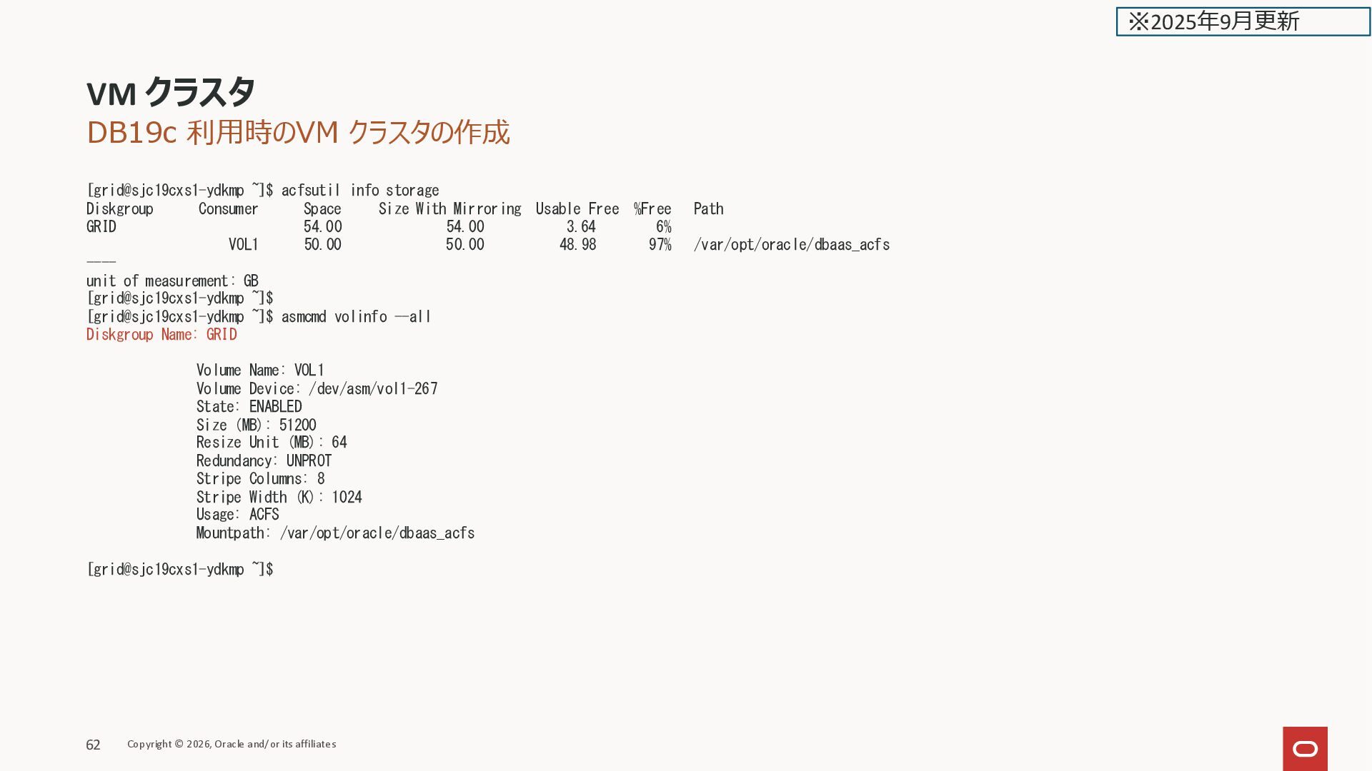 MOUNTPOINT sda 8:0 0 114G 0 disk |-sda1 8:1 0 512M 0 part /boot |-sda2 8:2 0 256M 0 part `-sda3 8:3 0 113.3G 0 part |-VGExaDb-LVDbSys1 252:2 0 15G 0 lvm / |-VGExaDb-LVDbVar1 252:3 0 5G 0 lvm /var |-VGExaDb-LVDbVarLog 252:4 0 18G 0 lvm /var/log |-VGExaDb-LVDbHome 252:5 0 4G 0 lvm /home |-VGExaDb-LVDbSys2 252:6 0 15G 0 lvm |-VGExaDb-LVDbSwap1 252:7 0 16G 0 lvm [SWAP] |-VGExaDb-LVDbTmp 252:8 0 10G 0 lvm /tmp |-VGExaDb-LVDbVar2 252:9 0 5G 0 lvm |-VGExaDb-LVDbVarLogAudit 252:10 0 3G 0 lvm /var/log/audit |-VGExaDb-LVDbKdump 252:11 0 20G 0 lvm /crashfiles `-VGExaDb-LVDoNotRemoveOrUse 252:12 0 2G 0 lvm sdb 8:16 0 124G 0 disk `-sdb1 8:17 0 124G 0 part `-VGExaDbDisk.u02_extra.img-LVDBDisk 252:1 0 122G 0 lvm /u02 sdc 8:32 0 42G 0 disk `-sdc1 8:33 0 42G 0 part `-VGExaDbDisk.u01_Vmmyuwc_2_5e8f-LVDBDisk 252:0 0 40G 0 lvm /u01 exc-dev1 251:1 0 50G 0 disk /var/opt/oracle/dbaas_acfs [root@kixxssec2-berll ~]# VM クラスタ Copyright © 2026, Oracle and/or its affiliates 41 ※2025年2月更新