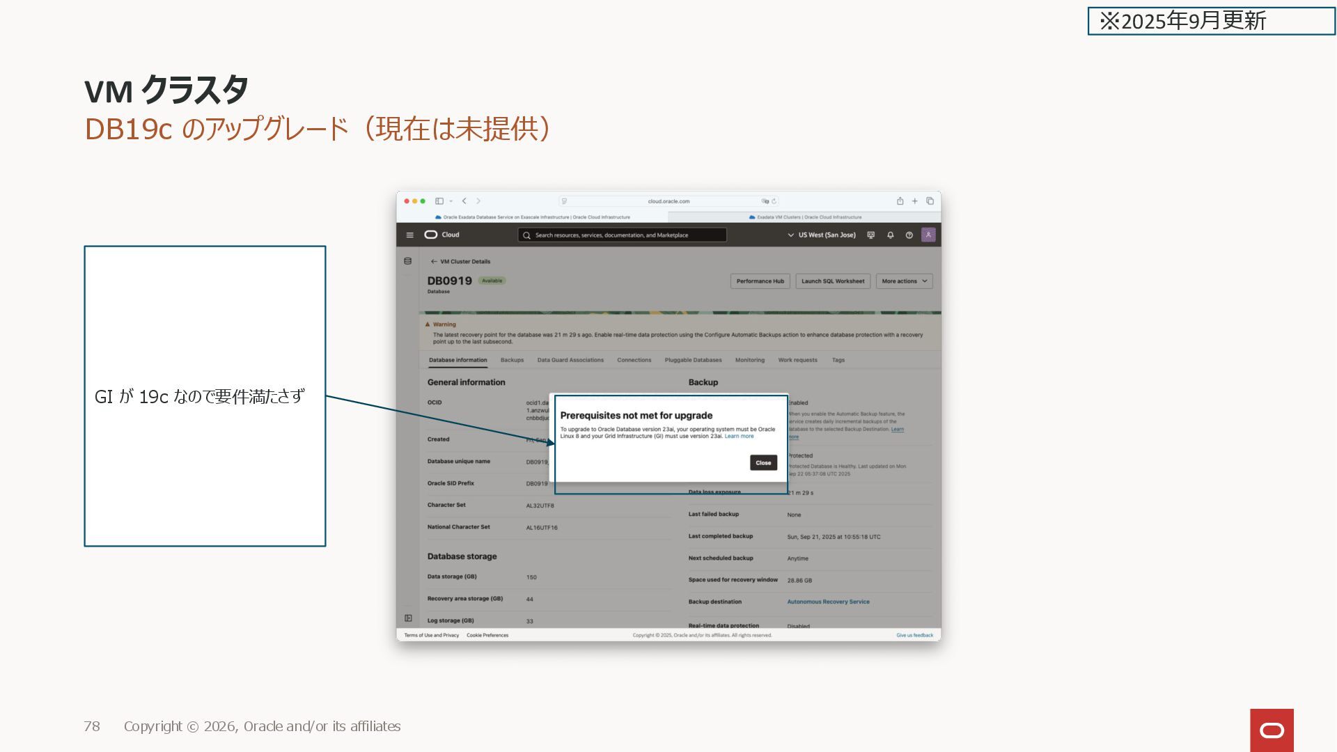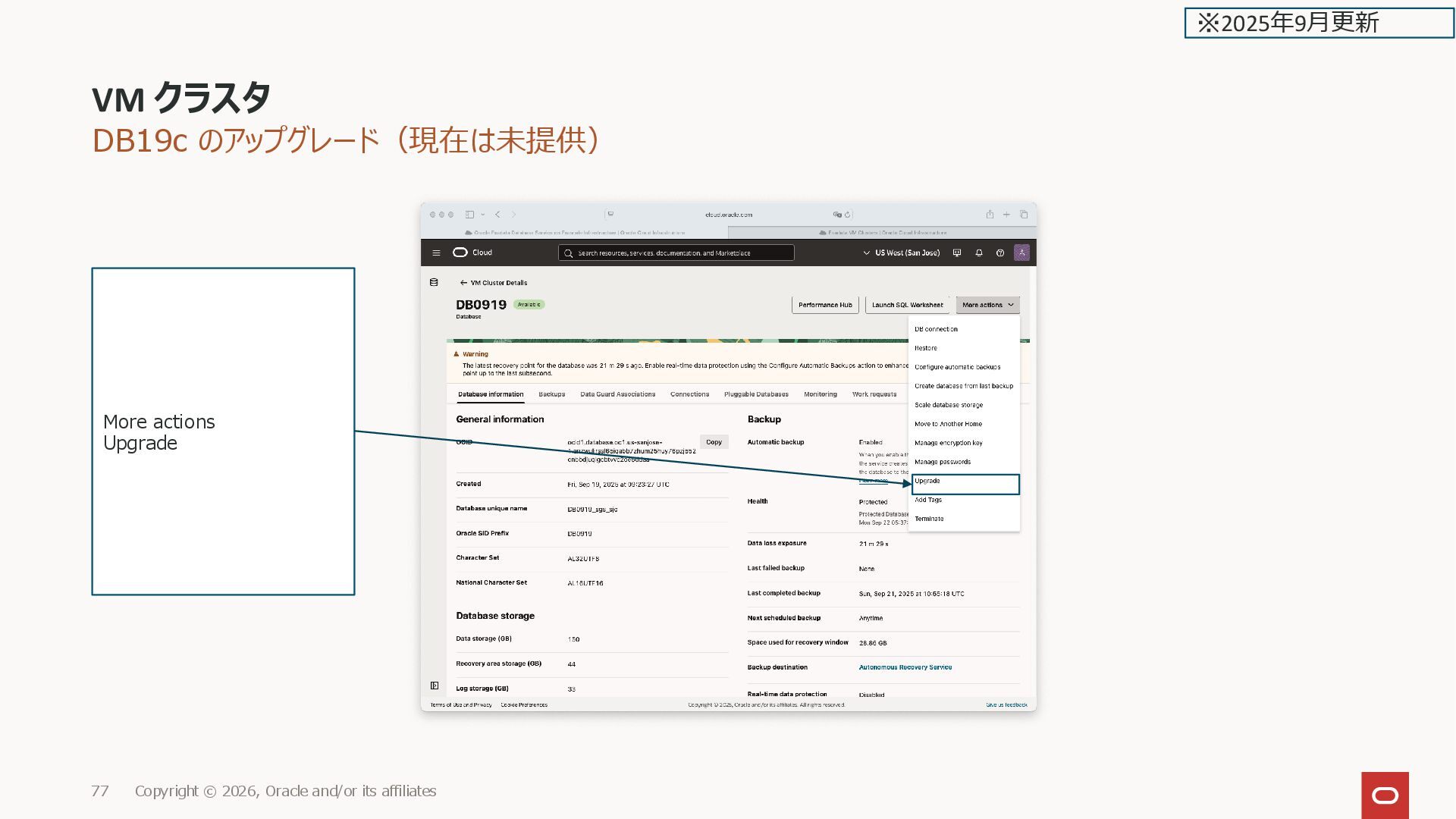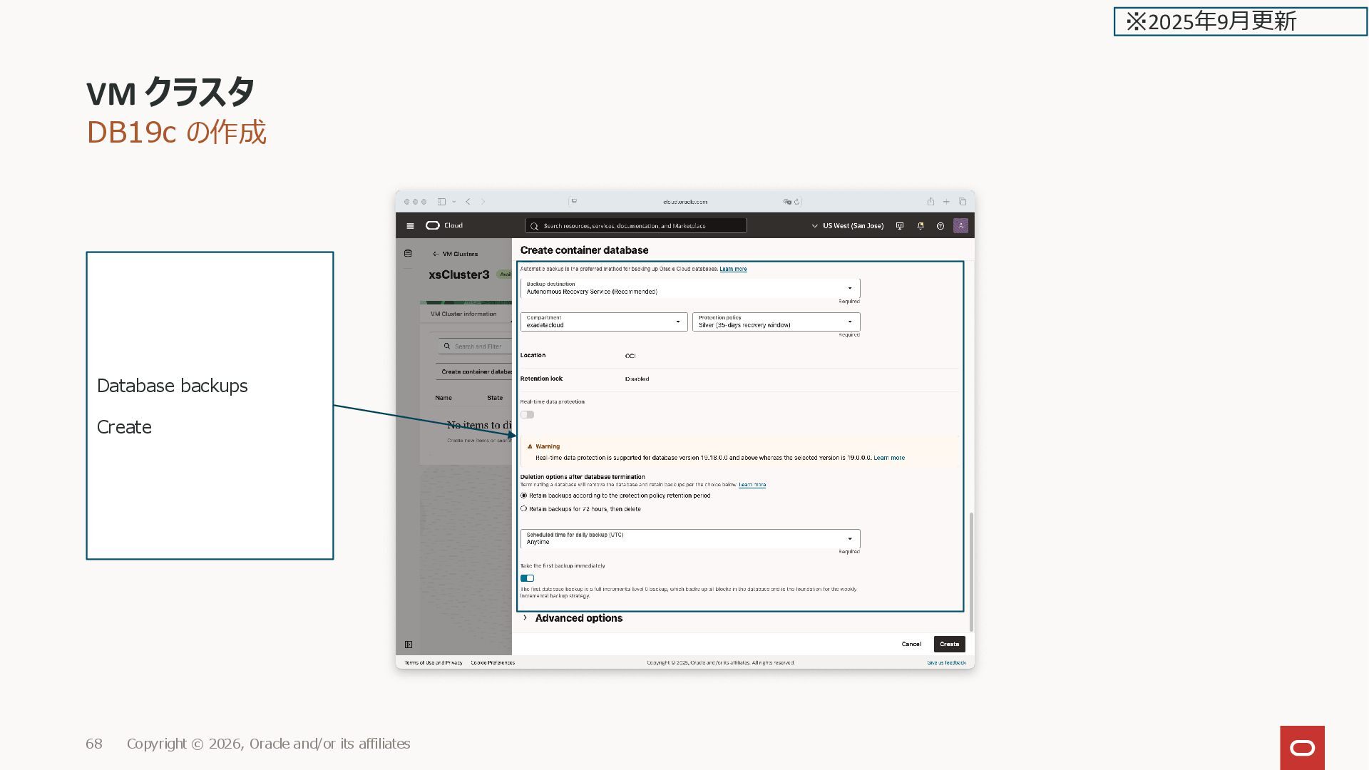 Oracle and/or its affiliates 177 スナップショット名 注意事項 These snapshots are not available at the VM Cluster level, but are created synchronously for all individual Virtual Machines in the VM cluster. To restore the entire cluster, you must restore each individual Virtual Machine located in the cluster. ※2026年2月更新