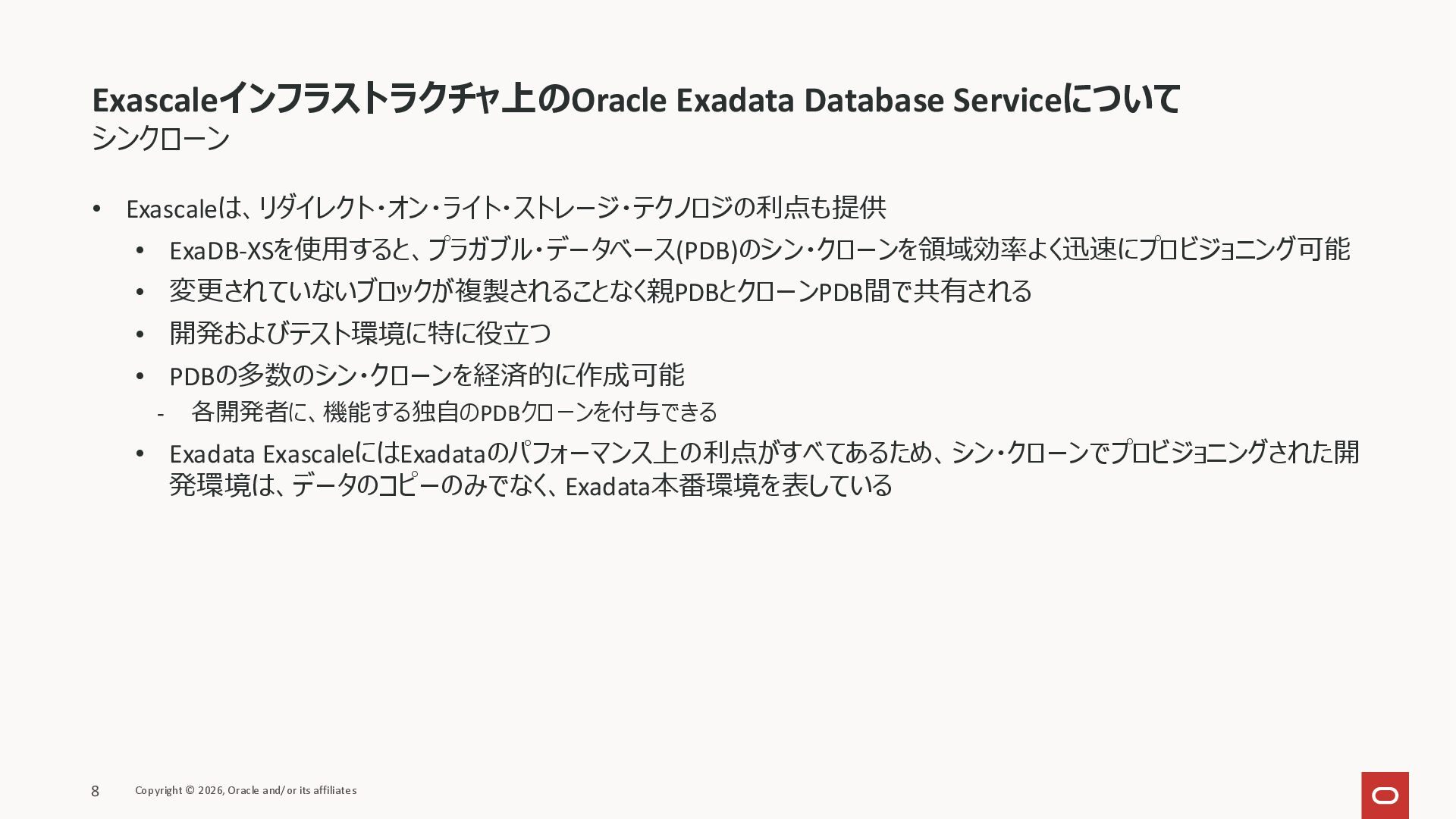 PDBの多数のシン・クローンを経済的に作成可能 - 各開発者に、機能する独自のPDBクローンを付与できる • Exadata ExascaleにはExadataのパフォーマンス上の利点がすべてあるため、シン・クローンでプロビジョニングされた開 発環境は、データのコピーのみでなく、Exadata本番環境を表している Exascaleインフラストラクチャ上のOracle Exadata Database Serviceについて Copyright © 2026, Oracle and/or its affiliates 8
