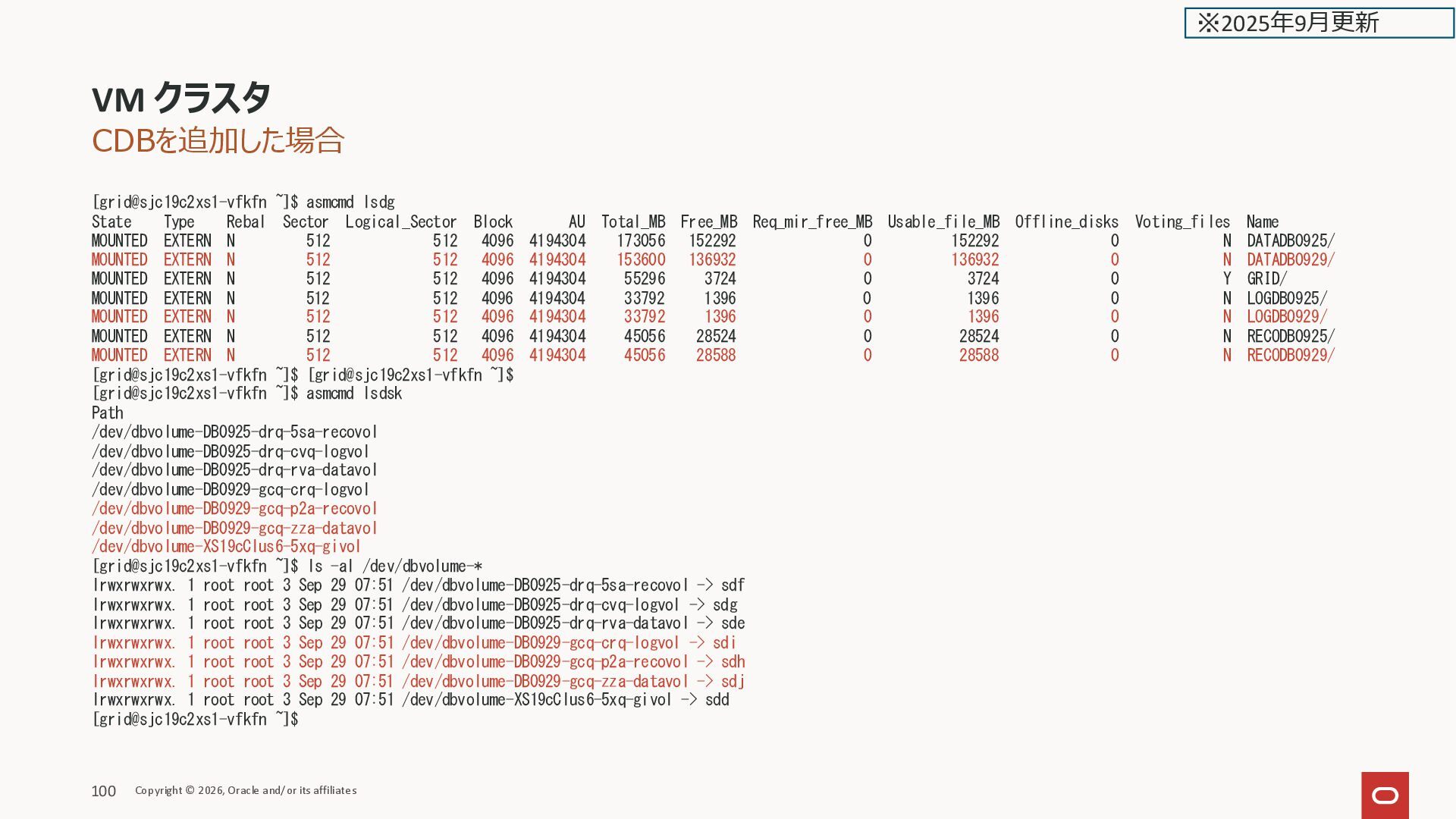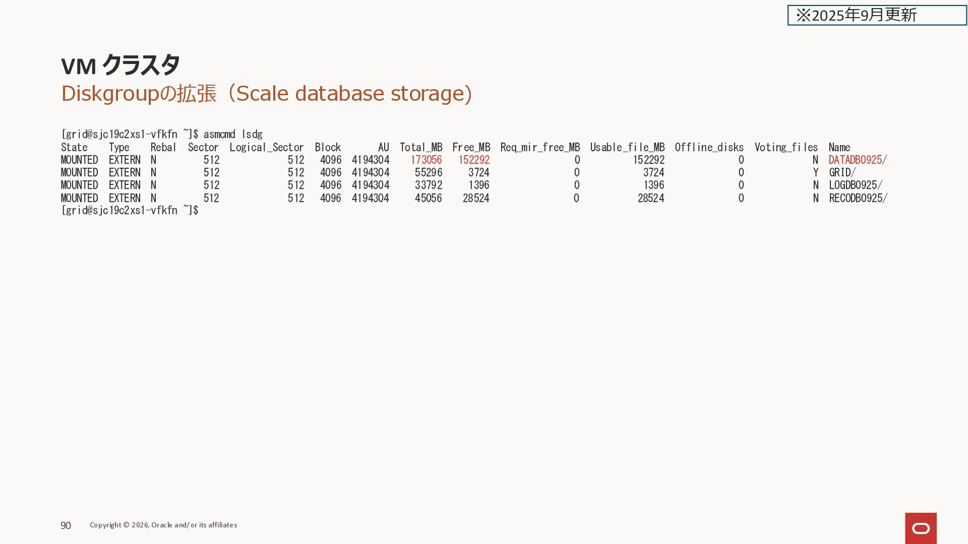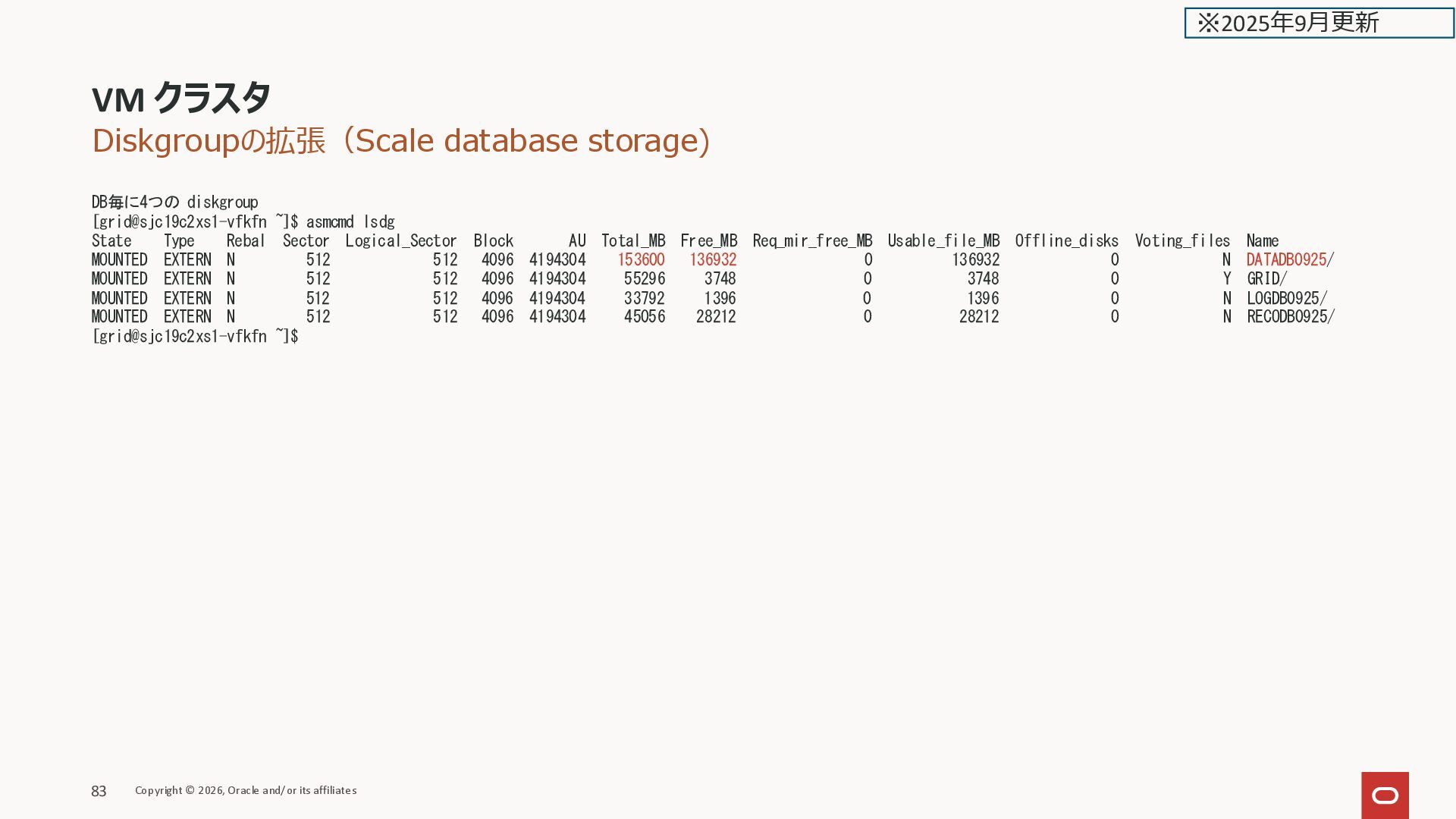 Filesystem Type Size Used Avail Use% Mounted on devtmpfs devtmpfs 11G 0 11G 0% /dev tmpfs tmpfs 11G 8.0M 11G 1% /run tmpfs tmpfs 11G 0 11G 0% /sys/fs/cgroup /dev/mapper/VGExaDb-LVDbSys1 xfs 15G 5.8G 9.2G 39% / /dev/mapper/VGExaDb-LVDbKdump xfs 20G 175M 20G 1% /crashfiles /dev/mapper/VGExaDbDisk.u02_extra.img-LVDBDisk ext4 120G 7.6G 106G 7% /u02 /dev/mapper/VGExaDb-LVDbHome xfs 4.0G 77M 4.0G 2% /home /dev/sda1 xfs 412M 119M 294M 29% /boot /dev/mapper/VGExaDb-LVDbTmp xfs 10G 117M 9.8G 2% /tmp /dev/mapper/VGExaDb-LVDbVar1 xfs 5.0G 1.3G 3.7G 26% /var /dev/mapper/VGExaDb-LVDbVarLog xfs 18G 605M 18G 4% /var/log /dev/mapper/VGExaDb-LVDbVarLogAudit xfs 3.0G 170M 2.8G 6% /var/log/audit /dev/mapper/VGExaDbDisk.u01_Vmmyuwc_1_3e2c-LVDBDisk xfs 40G 6.8G 34G 17% /u01 tmpfs tmpfs 22G 512M 21G 3% /dev/shm oracle_clusterware tmpfs 128M 5.4M 123M 5% /u01/app/grid/crsdata/kixxssec1-ahnvr/shm /dev/exc/vExdb40 acfs 50G 3.0G 48G 6% /var/opt/oracle/dbaas_acfs tmpfs tmpfs 2.2G 0 2.2G 0% /run/user/1001 tmpfs tmpfs 2.2G 0 2.2G 0% /run/user/2000 [root@kixxssec1-ahnvr ~]# VM クラスタのスケール Copyright © 2026, Oracle and/or its affiliates 161 ※2025年2月更新