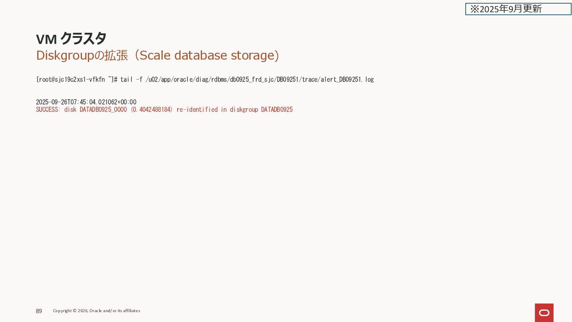 VG Attr LSize Pool Origin Data% Meta% Move Log Cpy%Sync Convert LVDbHome VGExaDb -wi-ao---- 4.00g LVDbKdump VGExaDb -wi-ao---- 20.00g LVDbSwap1 VGExaDb -wi-ao---- 16.00g LVDbSys1 VGExaDb -wi-ao---- 15.00g LVDbSys2 VGExaDb -wi-a----- 15.00g LVDbTmp VGExaDb -wi-ao---- 10.00g LVDbVar1 VGExaDb -wi-ao---- 5.00g LVDbVar2 VGExaDb -wi-a----- 5.00g LVDbVarLog VGExaDb -wi-ao---- 18.00g LVDbVarLogAudit VGExaDb -wi-ao---- 3.00g LVDoNotRemoveOrUse VGExaDb -wi-a----- 2.00g LVDBDisk VGExaDbDisk.u01_Vmmyuwc_1_3e2c -wi-ao---- 40.00g LVDBDisk VGExaDbDisk.u02_extra.img -wi-ao---- 122.00g [root@kixxssec1-ahnvr ~]# VM クラスタのスケール Copyright © 2026, Oracle and/or its affiliates 162 ※2025年2月更新
